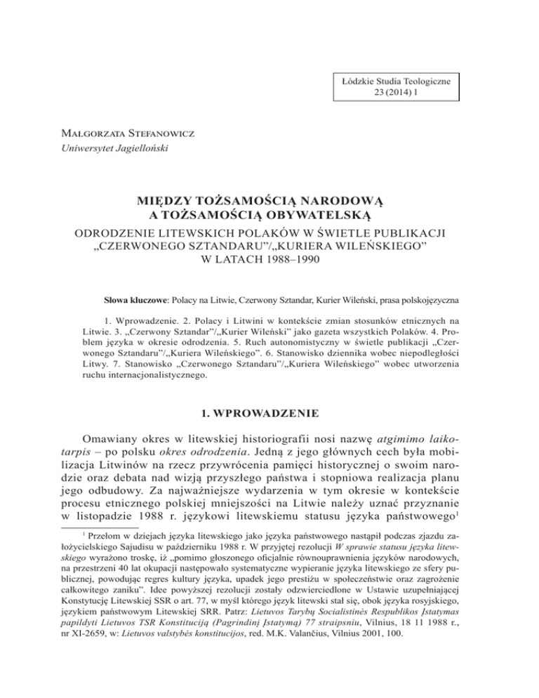 Łódzkie Studia Teologiczne 23 (2014) 1 Małgorzata Stefanowicz Uniwersytet Jagielloński MIĘDZY TOŻSAMOŚCIĄ NARODOWĄ A TOŻSAMOŚCIĄ OBYWATELSKĄ ODRODZENIE LITEWSKICH POLAKÓW W ŚWIETLE PUBLIKACJI „CZERWONEGO SZTANDARU”/„KURIERA WILEŃSKIEGO” W LATACH 1988–1990 Słowa kluczowe: Polacy na Litwie, Czerwony Sztandar, Kurier Wileński, prasa polskojęzyczna 1. Wprowadzenie. 2. Polacy i Litwini w kontekście zmian stosunków etnicznych na Litwie. 3. „Czerwony Sztandar”/„Kurier Wileński” jako gazeta wszystkich Polaków. 4. Problem języka w okresie odrodzenia. 5. Ruch autonomistyczny w świetle publikacji „Czerwonego Sztandaru”/„Kuriera Wileńskiego”. 6. Stanowisko dziennika wobec niepodległości Litwy. 7. Stanowisko „Czerwonego Sztandaru”/„Kuriera Wileńskiego” wobec utworzenia ruchu internacjonalistycznego. 1. Wprowadzenie Omawiany okres w litewskiej historiografii nosi nazwę atgimimo laikotarpis – po polsku okres odrodzenia. Jedną z jego głównych cech była mobilizacja Litwinów na rzecz przywrócenia pamięci historycznej o swoim narodzie oraz debata nad wizją przyszłego państwa i stopniowa realizacja planu jego odbudowy. Za najważniejsze wydarzenia w tym okresie w kontekście procesu etnicznego polskiej mniejszości na Litwie należy uznać przyznanie w listopadzie 1988 r. językowi litewskiemu statusu języka państwowego1 1 Przełom w dziejach języka litewskiego jako języka państwowego nastąpił podczas zjazdu założycielskiego Sajudisu w październiku 1988 r. W przyjętej rezolucji W sprawie statusu języka litewskiego wyrażono troskę, iż „pomimo głoszonego oficjalnie równouprawnienia języków narodowych, na przestrzeni 40 lat okupacji następowało systematyczne wypieranie języka litewskiego ze sfery publicznej, powodując regres kultury języka, upadek jego prestiżu w społeczeństwie oraz zagrożenie całkowitego zaniku”. Idee powyższej rezolucji zostały odzwierciedlone w Ustawie uzupełniającej Konstytucję Litewskiej SSR o art. 77, w myśl którego język litewski stał się, obok języka rosyjskiego, językiem państwowym Litewskiej SRR. Patrz: Lietuvos Tarybų Socialistinės Respublikos Įstatymas papildyti Lietuvos TSR Konstituciją (Pagrindinį Įstatymą) 77 straipsniu, Vilnius, 18 11 1988 r., nr XI-2659, w: Lietuvos valstybės konstitucijos, red. M.K. Valančius, Vilnius 2001, 100. Małgorzata Stefanowicz 94 [2] oraz ogłoszenie 11 marca 1990 r. aktu o restytucji niepodległego państwa litewskiego2. W tym samym okresie odrodzenie narodowe przeżywali również litewscy Polacy, którzy, wykorzystując odprężenie wewnątrz ZSRR, a także obserwując emancypacyjną działalność Litwinów, podjęli starania na rzecz określenia własnego miejsca w nowym państwie litewskim. W tym kontekście omawiany okres jest interesujący z powodu jego „przełomowego” charakteru, gdyż dokonała się w nim redefinicja stosunków międzyetnicznych w nowym ustroju. Polska perspektywa najpełniej była prezentowana na łamach „Czerwonego Sztandaru”/„Kuriera Wileńskiego”, który był otwarty na wszystkie problemy społeczności litewskich Polaków. Dziennik pełnił funkcję przekaziciela idei politycznych właściwie wszystkich środowisk polskich oraz po części sam był kreatorem określonych wizji, gdyż w omawianym okresie „dziennikarze byli nie tylko kronikarzami życia codziennego, ale bardzo często również w sposób aktywny inicjowali przemiany”3. W artykule wykorzystano analizę treści w wydaniach „Czerwonego Sztandaru”/„Kuriera Wileńskiego”, obejmujących okres od 1 stycznia 1988 do 30 grudnia 1990 r. oraz odpowiedź na kilka pytań. Jaką rolę odegrał „Czerwony Sztandar”/ „Kurier Wileński” w procesie mobilizacji etnopolitycznej litewskich Polaków? W jaki sposób w świetle publikacji na łamach dziennika proponowano uregulować położenie polskiej mniejszości? Jakie problemy w okresie transformacji ustrojowej Polacy uznawali za „swoje”? Celem jest również weryfikacja często pojawiającej się w litewskim dyskursie medialnym tezy, że publikacje „Czerwonego Sztandaru”/ „Kuriera Wileńskiego” w okresie transformacji miały charakter antylitewski i antypaństwowy. Innymi słowy, poszukamy odpowiedzi na pytanie, czy najbardziej poczytna gazeta polskojęzyczna na Litwie wprowadzała dysonans między aspiracjami politycznymi litewskich Polaków na rzecz zachowania własnej tożsamości narodowej a lojalnością obywatelską wobec państwa litewskiego? 2. Polacy i Litwini w kontekście zmian stosunków etnicznych na Litwie Radziecka polityka pierestrojki przyniosła wyraźne zmiany życia narodowego na Litwie. Okres ten charakteryzował się znacznym ożywieniem kulturalnym grup etnicznych zamieszkujących terytorium Litwy4, przy czym postulaty dwóch spośród Więcej: P. Łossowski, Litwa, Warszawa 2001, 229–233. A. Bobryk, Media mniejszości polskiej na Litwie w okresie transformacji, w: Mniejszości narodowe i etniczne w procesach transformacji oraz integracji, red. E. Michalik, H. Chałupczak, Lublin 2006, 244. 4 O odrodzeniu litewskich Żydów patrz: S. Alperavičius, Žydų mažumos ir daugumos santykis Lietuvoje, w: Tautinės mažumos demokratinėje valstybėje, Tautinių mažumų ir išeivijos departamentas prie Lietuvos Respublikos Vyriausybės, Vilnius 2000, 97–100; A. Bryo, Język jidysz wraca do szkolnictwa, Czerwony Sztandar 19 X 1988. O odrodzeniu litewskich Karaimów patrz: K. Firkavičiūtė, Lietuvos karaimai – etnokonfesinė mažuma pilietinėje visuomenėje, w: Tautinės mažumos demokratinėje…, dz.cyt., 101–103; Na rzecz kultury karaimskiej, Czerwony Sztandar 17 VII 1988. O odrodzeniu naro2 3 [3] MIĘDZY TOŻSAMOŚCIĄ NARODOWĄ A TOŻSAMOŚCIĄ OBYWATELSKĄ... 95 nich – Litwinów i Polaków – znacząco wykraczały poza zaspokojenie podstawowych potrzeb kulturalnych, takich jak: nauka i krzewienie języka ojczystego cz
