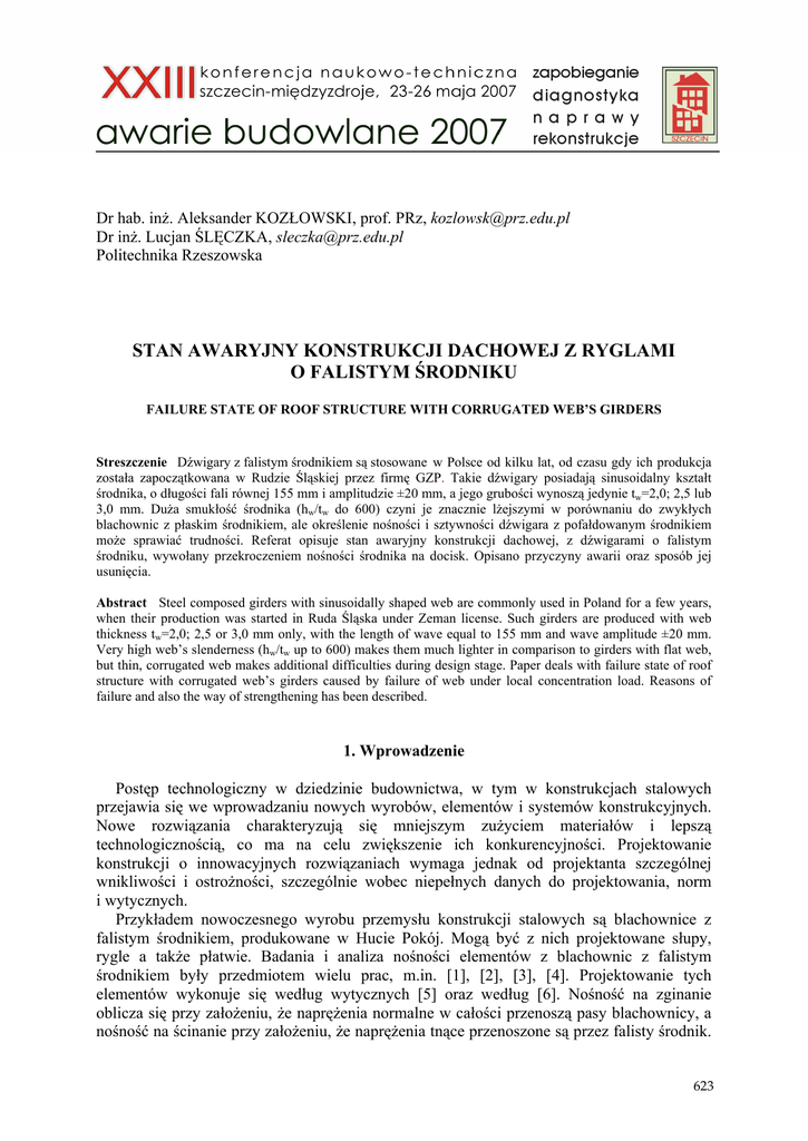 STAN AWARYJNY KONSTRUKCJI DACHOWEJ Z RYGLAMI O