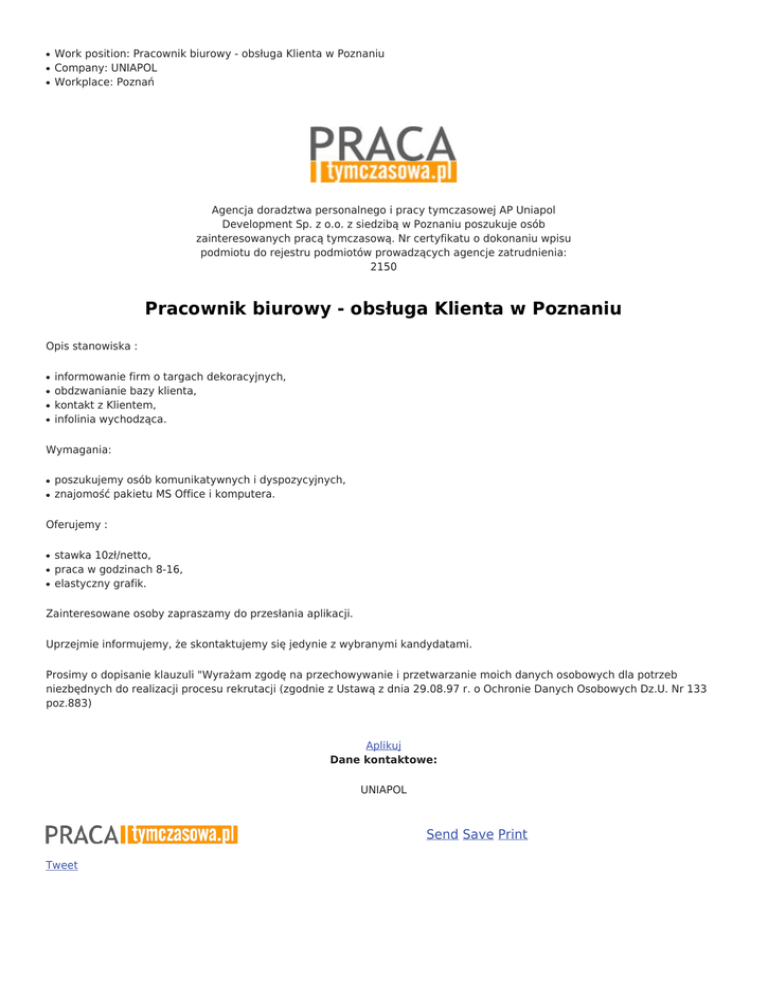 ● ● ● Work position: Pracownik biurowy - obsługa Klienta w Poznaniu Company: UNIAPOL Workplace: Poznań Agencja doradztwa personalnego i pracy tymczasowej AP Uniapol Development Sp. z o.o. z siedzibą w Poznaniu poszukuje osób zainteresowanych pracą tymczasową. Nr certyfikatu o dokonaniu wpisu podmiotu do rejestru podmiotów prowadzących agencje zatrudnienia: 2150 Pracownik biurowy - obsługa Klienta w Poznaniu Opis stanowiska : ● ● ● ● informowanie firm o targach dekoracyjnych, obdzwanianie bazy klienta, kontakt z Klientem, infolinia wychodząca. Wymagania: ● ● poszukujemy osób komunikatywnych i dyspozycyjnych, znajomość pakietu MS Office i komputera. Oferujemy : ● ● ● stawka 10zł/netto, praca w godzinach 8-16, elastyczny grafik. Zainteresowane osoby zapraszamy do przesłania aplikacji. Uprzejmie informujemy, że skontaktujemy się jedynie z wybranymi kandydatami. Prosimy o dopisanie klauzuli "Wyrażam zgodę na przechowywanie i przetwarzanie moich danych osobowych dla potrzeb niezbędnych do realizacji procesu rekrutacji (zgodnie z Ustawą z dnia 29.08.97 r. o Ochronie Danych Osobowych Dz.U. Nr 133 poz.883) Aplikuj Dane kontaktowe: UNIAPOL Send Save Print Tweet