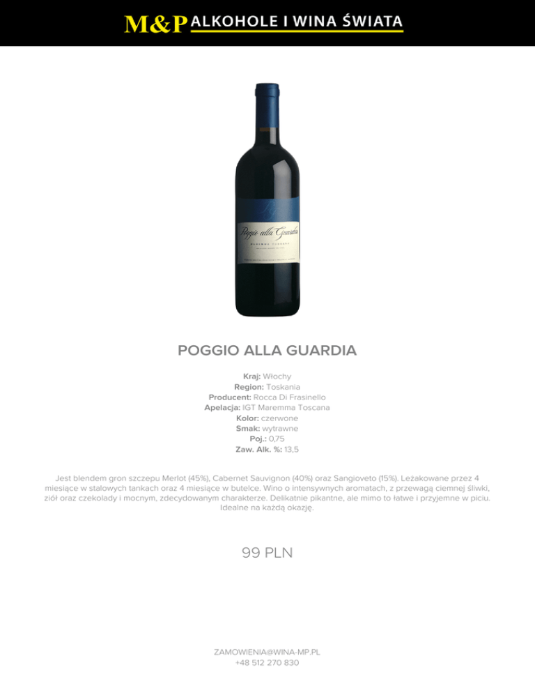 POGGIO ALLA GUARDIA Kraj: Włochy Region: Toskania Producent: Rocca Di Frasinello Apelacja: IGT Maremma Toscana Kolor: czerwone Smak: wytrawne Poj.: 0,75 Zaw. Alk. %: 13,5 Jest blendem gron szczepu Merlot (45%), Cabernet Sauvignon (40%) oraz Sangioveto (15%). Leżakowane przez 4 miesiące w stalowych tankach oraz 4 miesiące w butelce. Wino o intensywnych aromatach, z przewagą ciemnej śliwki, ziół oraz czekolady i mocnym, zdecydowanym charakterze. Delikatnie pikantne, ale mimo to łatwe i przyjemne w piciu. Idealne na każdą okazję. 99 PLN [email protected] +48 512 270 830