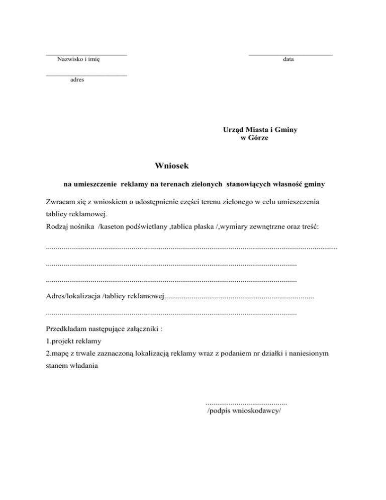 _________________________ Nazwisko i imię __________________________ data _________________________ adres Urząd Miasta i Gminy w Górze Wniosek na umieszczenie reklamy na terenach zielonych stanowiących własność gminy Zwracam się z wnioskiem o udostępnienie części terenu zielonego w celu umieszczenia tablicy reklamowej. Rodzaj nośnika /kaseton podświetlany ,tablica płaska /,wymiary zewnętrzne oraz treść: ...................................................................................................................................................... ................................................................................................................................. ................................................................................................................................. Adres/lokalizacja /tablicy reklamowej............................................................................. ................................................................................................................................. Przedkładam następujące załączniki : 1.projekt reklamy 2.mapę z trwale zaznaczoną lokalizacją reklamy wraz z podaniem nr działki i naniesionym stanem władania .......................................... /podpis wnioskodawcy/