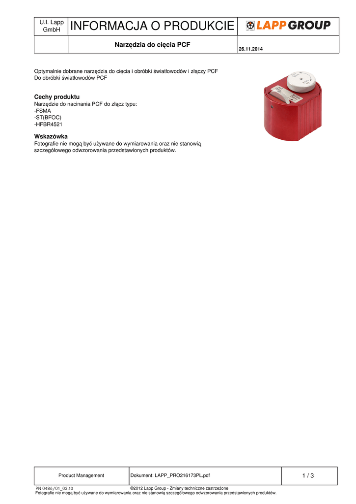 U.I. Lapp GmbH INFORMACJA O PRODUKCIE Narzędzia do cięcia PCF 26.11.2014 Optymalnie dobrane narzędzia do cięcia i obróbki światłowodów i złączy PCF Do obróbki światłowodów PCF Cechy produktu Narzędzie do nacinania PCF do złącz typu: -FSMA -ST(BFOC) -HFBR4521 Wskazówka Fotografie nie mogą być używane do wymiarowania oraz nie stanowią szczegółowego odwzorowania przedstawionych produktów. Product Management Dokument: LAPP_PRO216173PL.pdf ©2012 Lapp Group - Zmiany techniczne zastrzeżone PN 0486/01_03.10 Fotografie nie mogą być używane do wymiarowania oraz nie stanowią szczegółowego odwzorowania przedstawionych produktów. 1/3 Powered by TCPDF (www.tcpdf.org) Narzędzie do rozdzielania buforowanych włókien PCF 0,5 mm (K200/230) 1 sztuka 29500712 Narzędzie do nacinania PCF Złącze FSMA 1 sztuka 29500713 Narzędzie do nacinania PCF Złącze ST(BFOC) 1 sztuka 29500714 Narzędzie do nacinania PCF Złącze HFBR4521 1 sztuka 29500711 Narzędzie do nacinania włókien PCF Narzędzia do cięcia PCF Dokument: LAPP_PRO216173PL.pdf INFORMACJA O PRODUKCIE Jednostka dostawy (PU) U.I. Lapp GmbH Oznaczenie wyrobu Narzędzie do odizolowywania włókien PCF Product Management 26.11.2014 ©2012 Lapp Group - Zmiany techniczne zastrzeżone PN 0486/01_03.10 Fotografie nie mogą być używane do wymiarowania oraz nie stanowią szczegółowego odwzorowania przedstawionych produktów. Numer artykułu 2/3 Powered by TCPDF (www.tcpdf.org) U.I. Lapp GmbH INFORMACJA O PRODUKCIE Narzędzia do cięcia PCF Product Management 26.11.2014 Dokument: LAPP_PRO216173PL.pdf ©2012 Lapp Group - Zmiany techniczne zastrzeżone PN 0486/01_03.10 Fotografie nie mogą być używane do wymiarowania oraz nie stanowią szczegółowego odwzorowania przedstawionych produktów. 3/3