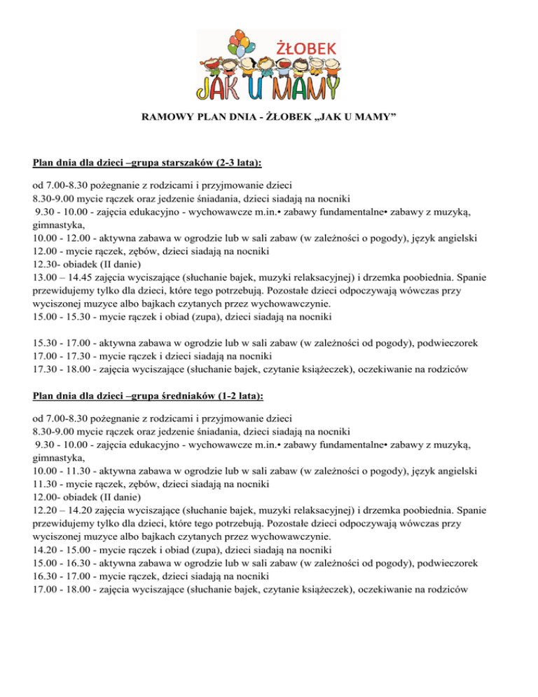 RAMOWY PLAN DNIA - ŻŁOBEK „JAK U MAMY” Plan dnia dla dzieci –grupa starszaków (2-3 lata): od 7.00-8.30 pożegnanie z rodzicami i przyjmowanie dzieci 8.30-9.00 mycie rączek oraz jedzenie śniadania, dzieci siadają na nocniki 9.30 - 10.00 - zajęcia edukacyjno - wychowawcze m.in.• zabawy fundamentalne• zabawy z muzyką, gimnastyka, 10.00 - 12.00 - aktywna zabawa w ogrodzie lub w sali zabaw (w zależności o pogody), język angielski 12.00 - mycie rączek, zębów, dzieci siadają na nocniki 12.30- obiadek (II danie) 13.00 – 14.45 zajęcia wyciszające (słuchanie bajek, muzyki relaksacyjnej) i drzemka poobiednia. Spanie przewidujemy tylko dla dzieci, które tego potrzebują. Pozostałe dzieci odpoczywają wówczas przy wyciszonej muzyce albo bajkach czytanych przez wychowawczynie. 15.00 - 15.30 - mycie rączek i obiad (zupa), dzieci siadają na nocniki 15.30 - 17.00 - aktywna zabawa w ogrodzie lub w sali zabaw (w zależności od pogody), podwieczorek 17.00 - 17.30 - mycie rączek i dzieci siadają na nocniki 17.30 - 18.00 - zajęcia wyciszające (słuchanie bajek, czytanie książeczek), oczekiwanie na rodziców Plan dnia dla dzieci –grupa średniaków (1-2 lata): od 7.00-8.30 pożegnanie z rodzicami i przyjmowanie dzieci 8.30-9.00 mycie rączek oraz jedzenie śniadania, dzieci siadają na nocniki 9.30 - 10.00 - zajęcia edukacyjno - wychowawcze m.in.• zabawy fundamentalne• zabawy z muzyką, gimnastyka, 10.00 - 11.30 - aktywna zabawa w ogrodzie lub w sali zabaw (w zależności o pogody), język angielski 11.30 - mycie rączek, zębów, dzieci siadają na nocniki 12.00- obiadek (II danie) 12.20 – 14.20 zajęcia wyciszające (słuchanie bajek, muzyki relaksacyjnej) i drzemka poobiednia. Spanie przewidujemy tylko dla dzieci, które tego potrzebują. Pozostałe dzieci odpoczywają wówczas przy wyciszonej muzyce albo bajkach czytanych przez wychowawczynie. 14.20 - 15.00 - mycie rączek i obiad (zupa), dzieci siadają na nocniki 15.00 - 16.30 - aktywna zabawa w ogrodzie lub w sali zabaw (w zależności od pogody), podwieczorek 16.30 - 17.00 - mycie rączek, dzieci siadają na nocniki 17.00 - 18.00 - zajęcia wyciszające (słuchanie bajek, czytanie książeczek), oczekiwanie na rodziców