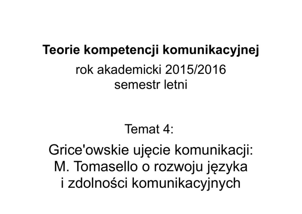 Teorie kompetencji komunikacyjnej rok akademicki 2015/2016 semestr letni Temat 4: Grice'owskie ujęcie komunikacji: M. Tomasello o rozwoju języka i zdolności komunikacyjnych Tylko ludzie tworzą: • wyspecjalizowane narzędzia, • złożone systemy symbolicznej komunikacji, • złożone systemy życia społecznego. Tylko ludzie tworzą: • wyspecjalizowane narzędzia, • złożone systemy symbolicznej komunikacji, • złożone systemy życia społecznego. Ustalenia paleoantropologii: • około 6 lub 7 mln lat temu rozdzielają się linie rozwojowe szympansa oraz człowieka; • około 200 lub 250 tysięcy lat temu pojawia się gatunek homo. Tylko ludzie tworzą: • wyspecjalizowane narzędzia, • złożone systemy symbolicznej komunikacji, • złożone systemy życia społecznego. Ustalenia paleoantropologii: • około 6 lub 7 mln lat temu rozdzielają się linie rozwojowe szympansa oraz człowieka; • około 200 lub 250 tysięcy lat temu pojawia się gatunek homo. Problem: • Czy w tym czasie mogło dojść do wyłonienia się — na drodze ewolucji biologicznej — oddzielnych zdolności poznawczych umożliwiających tworzenie kultur narzędziowych, systemów symbolicznych oraz instytucji społecznych? Tylko ludzie tworzą: • wyspecjalizowane narzędzia, • złożone systemy symbolicznej komunikacji, • złożone systemy życia społecznego. Ustalenia paleoantropologii: • około 6 lub 7 mln lat temu rozdzielają się linie rozwojowe szympansa oraz człowieka; • około 200 lub 250 tysięcy lat temu pojawia się gatunek homo. Problem: • Czy w tym czasie mogło dojść do wyłonienia się — na drodze ewolucji biologicznej — oddzielnych zdolności poznawczych umożliwiających tworzenie kultur narzędziowych, systemów symbolicznych oraz instytucji społecznych? • To mało prawdopodobne... Hipoteza Tomasello: • o wyjątkowości przedstawicieli gatunku homo stanowi jeden mechanizm biologiczny: zdolność do postrzegania innych jako istot intencjonalnych; Hipoteza Tomasello: • o wyjątkowości przedstawicieli gatunku homo stanowi jeden mechanizm biologiczny: zdolność do postrzegania innych jako istot intencjonalnych; • mechanizm ten umożliwia uczenie się przez naśladowanie oraz proces kumulatywnej ewolucji kulturowej. Hipoteza Tomasello: • o wyjątkowości przedstawicieli gatunku homo stanowi jeden mechanizm biologiczny: zdolność do postrzegania innych jako istot intencjonalnych; • mechanizm ten umożliwia uczenie się przez naśladowanie oraz proces kumulatywnej ewolucji kulturowej. Przejawy transmisji kulturowej: • wokalizacje ptaków, • nawyki żywieniowe (młoda jedzą to, co matki), • narzędzia i techniki łowieckie szympansów, • symboliczne formy komunikacji. Hipoteza Tomasello: • o wyjątkowości przedstawicieli gatunku homo stanowi jeden mechanizm biologiczny: zdolność do postrzegania innych jako istot intencjonalnych; • mechanizm ten umożliwia uczenie się przez naśladowanie oraz proces kumulatywnej ewolucji kulturowej. Przejawy transmisji kulturowej: • wokalizacje ptaków, • nawyki żywieniowe (młode jedzą to, co matki), • narzędzia i techniki łowieckie szympansów, • symboliczne formy komunikacji. WAŻNE: • populacja = „kultura”; • zróżnicowanie kulturowe bez zróżnicowania genetycznego; • istnieje wiele różnych mechanizmów transmisji kulturowej. Kumulatywna ewolucja kulturowa jako forma transmisji kulturowej. Dwie umiejętności: • odróżnienie celu od strategii jego realizacji; • wierne odtworzenie strategii. Kumulatywna ewolucja kulturowa jako forma transmisji kulturowej. Dwie umiejętności: • odróżnienie celu od strategii jego realizacji; • wierne odtworzenie strategii. DYGRESJA Co zrobiła Ewa? • Strąciła jabłko z drzewa. • Rzuciła patykiem w gałąź z jabłkiem / zatrzęsła konarem / … Kumulatywna ewolucja kulturowa jako forma transmisji kulturowej Dwie umiejętności: • odróżnienie celu od strategii jego realizacji; • wierne odtworzenie strategii. DYGRESJA Co zrobiła Ewa? • Strąciła jabłko z drzewa. • Rzuciła patykiem w gałąź z jabłkiem / zatrzęsła konarem / … Narzędzia, symbole, strategie behawioralne zawsze odnoszą się do czegoś względem nich zewnętrznego (por. kategoria funkcji właściwej). Kumulatywna ewolucja kulturowa jest możliwa dzięki efektowi zapadki. • Czynnik twórczy → innowacje; • czynnik stabilizujący → „konserwatyzm”. Trzy procesy: • ewolucja biologiczna, • ewolucja kulturowa, • rozwój osobowy. „(...) zdolności poznawcze są wynikiem dziedziczenia biologicznego działającego na filogenetycznej skali czasu. Dzięki tym zdolnościom korzystają z zasobów kulturowych ukształtowanych w czasie historycznym, ale czynią to w czasie ontogenetycznym.” (Tomasello 2002: 68) Zdolności poznawcze ssaków: Zdolności poznawcze ssaków: • pamiętanie, „co”, „gdzie” i „kiedy” można znaleźć; • wykonywanie objazdów i skrótów podczas przemieszczania się w przestrzeni; • podążanie za widocznym i niewidocznym ruchem (por. Piageta test stałości obiektu); • kategoryzacja obiektów na podstawie podobieństwa percepcyjnego; • subityzacja. Zdolności społeczne ssaków: Zdolności społeczne ssaków: • rozpoznawanie jednostek należących do własnej grupy; • nawiązywanie relacji z innymi jednostkami z grupy ze względu na pokrewieństwo, przyjaźń, itp.; • przewidywanie zachowań innych jednostek z grupy na podstawie ich stanów emocjonalnych oraz kierunku poruszania się; • używanie wielu strategii społecznych i komunikacyjnych w celu rywalizacji z innymi jednostkami z grupy o dominację oraz dostęp do zasobów; • współpraca z innymi jednostkami z grupy w celu rozwiązywania problemów; • angażowanie się w złożone formy komunikacji. Zdolności społeczne ssaków: • rozpoznawanie jednostek należących do własnej grupy; • nawiązywanie relacji z i