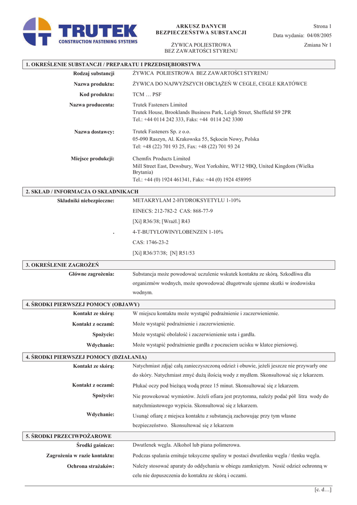 ARKUSZ DANYCH BEZPIECZEēSTWA SUBSTANCJI Strona 1 Data wydania: 04/08/2005 ĩYWICA POLIESTROWA BEZ ZAWARTOĝCI STYRENU Zmiana Nr 1 1. OKREĝLENIE SUBSTANCJI / PREPARATU I PRZEDSIĉBIORSTWA Rodzaj substancji ĩYWICA POLIESTROWA BEZ ZAWARTOĝCI STYRENU Nazwa produktu: ĩYWICA DO NAJWYĩSZYCH OBCIĄĩEē W CEGLE, CEGLE KRATÓWCE Kod produktu: Nazwa producenta: Nazwa dostawcy: Miejsce produkcji: TCM … PSF Trutek Fasteners Limited Trutek House, Brooklands Business Park, Leigh Street, Sheffield S9 2PR Tel.: +44 0114 242 333, Faks: +44 0114 242 3300 Trutek Fasteners Sp. z o.o. 05-090 Raszyn, Al. Krakowska 55, SĊkocin Nowy, Polska Tel: +48 (22) 701 93 25, Fax: +48 (22) 701 93 24 Chemfix Products Limited Mill Street East, Dewsbury, West Yorkshire, WF12 9BQ, United Kingdom (Wielka Brytania) Tel.: +44 (0) 1924 461341, Faks: +44 (0) 1924 458995 2. SKŁAD / INFORMACJA O SKŁADNIKACH Składniki niebezpieczne: METAKRYLAM 2-HYDROKSYETYLU 1-10% EINECS: 212-782-2 CAS: 868-77-9 [Xi] R36/38; [WraĪl.] R43 . 4-T-BUTYLOWINYLOBENZEN 1-10% CAS: 1746-23-2 [Xi] R36/37/38; [N] R51/53 3. OKREĝLENIE ZAGROĩEē Główne zagroĪenia: Substancja moĪe powodowaü uczulenie wskutek kontaktu ze skórą. Szkodliwa dla organizmów wodnych, moĪe spowodowaü długotrwałe ujemne skutki w Ğrodowisku wodnym. 4. ĝRODKI PIERWSZEJ POMOCY (OBJAWY) Kontakt ze skórą: W miejscu kontaktu moĪe wystąpiü podraĪnienie i zaczerwienienie. Kontakt z oczami: MoĪe wystąpiü podraĪnienie i zaczerwienienie. SpoĪycie: Wdychanie: MoĪe wystąpiü obolałoĞü i zaczerwienienie usta i gardła. MoĪe wystąpiü podraĪnienie gardła z poczuciem ucisku w klatce piersiowej. 4. ĝRODKI PIERWSZEJ POMOCY (DZIAŁANIA) Kontakt ze skórą: Natychmiast zdjąü całą zanieczyszczoną odzieĪ i obuwie, jeĪeli jeszcze nie przywarły one do skóry. Natychmiast zmyü duĪą iloĞcią wody z mydłem. Skonsultowaü siĊ z lekarzem. Kontakt z oczami: SpoĪycie: Płukaü oczy pod bieĪącą wodą przez 15 minut. Skonsultowaü siĊ z lekarzem. Nie prowokowaü wymiotów. JeĪeli ofiara jest przytomna, naleĪy podaü pół litra wody do natychmiastowego wypicia. Skonsultowaü siĊ z lekarzem. Wdychanie: Usunąü ofiarĊ z miejsca kontaktu z substancją zachowując przy tym własne bezpieczeĔstwo. Skonsultowaü siĊ z lekarzem 5. ĝRODKI PRZECIWPOĩAROWE ĝrodki gaĞnicze: ZagroĪenia w razie kontaktu: Ochrona straĪaków: Dwutlenek wĊgla. Alkohol lub piana polimerowa. Podczas spalania emituje toksyczne spaliny w postaci dwutlenku wĊgla / tlenku wĊgla. NaleĪy stosowaü aparaty do oddychania w obiegu zamkniĊtym. Nosiü odzieĪ ochronną w celu nie dopuszczenia do kontaktu ze skórą i oczami. [c. d…] ARKUSZ DANYCH BEZPIECZEēSTWA SUBSTANCJI Data wydania: 04/08/2005 Strona 2 ĩYWICA POLIESTROWA BEZ ZAWARTOĝCI STYRENU 6. ĝRODKI STOSOWANE W OKOLICZNOĝCIACH UWOLNIENIA SUBSTANCJI WSKUTEK WYPADKU Osobiste Ğrodki ostroĪnoĞci: Dane dotyczące ochrony osobistej dostĊpne są w p.8 ADBS. ĝrodowiskowe Ğrodki ostroĪnoĞci: Procedura usuwania: Nie naleĪy wylewaü do kanalizacji ani do rzek. PrzemieĞciü do zamykanego, oznakowanego kontenera ratowniczego w celu usuniĊcia go właĞciwymi metodami. 7. PRZEMIESZCZANIE I SKŁADOWANIE Przemieszczanie: Warunki składowania: W obszarze przemieszczania naleĪy zapewniü odpowiednią wentylacjĊ. Składowaü w chłodnym, dobrze wentylowanym miejscu. Kontener musi byü szczelnie zamkniĊty. Nie trzymaü w bezpoĞrednim słoĔcu. Odpowiednie opakowanie: NaleĪy przechowywaü wyłącznie w oryginalnym opakowaniu. 8. ĝRODKI KONTROLI RYZYKA / OCHRONA OSOBISTA ĝrodki techniczne: Ochrona dróg oddechowych: NaleĪy zapewniü odpowiednią wentylacjĊ terenu Ochrona dróg oddechowych nie jest konieczna. Ochrona rąk: RĊkawice ochronne Ochrona oczu: Okulary ochronne. Ochrona skóry: OdzieĪ ochronna. 9. WŁAĝCIWOĝCI FIZYCZNE I CHEMICZNE Stan: Barwa: Zapach: Tempo wyparowywania: Utlenianie: RozpuszczalnoĞü w wodzie: Rozpuszczalna w: LepkoĞü: Temperatura wrzenia w °C Pasta Brązowa Charakterystyczny zapach Powolne Nie utlenia siĊ (według kryteriów EC) TrochĊ rozpuszczalna WiĊkszoĞci rozpuszczalników organicznych Lepka 198 Temperatura zapłonu °C: 80 GĊstoĞü wzglĊdna: 1,6 10. STABILNOĝû I REAKTYWNOĝû StabilnoĞü: Unikaü warunków takich, jak: NaleĪy unikaü materiałów : Stabilna w warunkach normalnych. MoĪe siĊ polimeryzowaü po wystawieniu na działanie Ğwiatła. BezpoĞrednie słoĔce. Gorąco. Płomienie. Silne Ğrodki utleniające. Niebezpieczne produkty dekompozycji: Podczas spalania emituje toksyczne spaliny w postaci dwutlenku wĊgla / tlenku wĊgla. [c. d…] ARKUSZ DANYCH BEZPIECZEēSTWA SUBSTANCJI Data wydania: 04/08/2005 Strona 3 ĩYWICA POLIESTROWA BEZ ZAWARTOĝCI STYRENU 11. INFORMACJE TOKSYGOLOGICZNE Niebezpieczne składniki: METAKRYLAN 2-HYDROKSYETYLU IPR RAT LD50 1250 mg/kg ORL MUS LD50 3275 mg/kg ORL RAT LD50 5050 mg/kg ToksycznoĞü chroniczna: MoĪe powodowaü uczulenie wskutek kontaktu ze skórą. Drogi szkodliwego oddziaływania: Zob. p.4 ADBS opisujący drogi oddziaływania i związane z nimi objawy. 12. INFORMACJE EKOLOGICZNE MobilnoĞü: TrwałoĞü i rozkład: Potencjał bio-akumulatywny: Nierozpuszczalna w wodzie. Nie ulega biologicznemu rozkładowi. Brak danych. 13. OKOLICZNOĝCI ZWIĄZANE Z USUWANIEM SUBSTANCJI Operacje usuwania: NP.: D1 Zrzut na ziemiĊ lub pod ziemiĊ (np. na wysypisko, etc.) Zwraca siĊ uwagĊ uĪytkownika na moĪliwoĞü istnienia regionalnych lub krajowych regulacji dotyczących usuwania odpadów 14. INFORMACJE DORTYCZĄCE TRANSPORTU ADR / RID IMDG / IMO IATA / ICAO 15. INFORMACJE DOTYCZĄCE REGULACJI Symbole zagroĪeĔ: Frazy ryzyka: Substancja draĪniąca. R43: MoĪe powodowaü uczulenie wskutek kontaktu ze skórą. R52/53: Szkodliwa dla organizmów wodnych. MoĪe spowodowaü długotrwałe ujemne efekty w Ğrodowisku wodnym. Frazy bezpieczeĔstwa: S2: Trzymaü z dala od dzieci. S24: Unikaü kontaktu ze skórą. S29: Nie wylewaü do kana