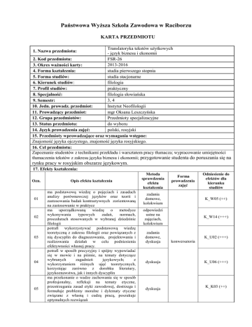 Państwowa Wyższa Szkoła Zawodowa w Raciborzu KARTA PRZEDMIOTU Translatoryka tekstów użytkowych - język biznesu i ekonomii FSR-26 2. Kod przedmiotu: 2013-2016 3. Okres ważności karty: studia pierwszego stopnia 4. Forma kształcenia: studia stacjonarne 5. Forma studiów: 6. Kierunek studiów: filologia praktyczny 7. Profil studiów: filologia słowiańska 8. Specjalność: 3, 4 9. Semestr: Instytut Neofilologii 10. Jedn. prowadz. przedmiot: mgr Oksana Leszczyńska 11. Prowadzący przedmiot: Przedmioty specjalizacyjne 12. Grupa przedmiotów: 13. Status przedmiotu: do wyboru 14. Język prowadzenia zajęć: polski, rosyjski 15. Przedmioty wprowadzające oraz wymagania wstępne: Znajomość języka ojczystego, znajomość języka rosyjskiego. 16. Cel przedmiotu: Zapoznanie studentów z technikami przekładu i warsztatem pracy tłumacza; wypracowanie umiejętności tłumaczenia tekstów z zakresu języka biznesu i ekonomii; przygotowanie studenta do poruszania się na 1. Nazwa przedmiotu: rynku pracy w rosyjskim obszarze językowym. 17. Efekty kształcenia: Ozn. 01 02 03 04 05 Opis efektu kształcenia ma podstawową wiedzę o pojęciach i zasadach analizy porównawczej języków oraz teorii i zastosowania badań kontrastywnych zorientowaną na zastosowanie w praktyce ma uporządkowaną wiedzę o metodyce wykonywania typowych zadań, normach, procedurach stosowanych w wybranej dziedzinie filologii potrafi wykorzystywać podstawową wiedzę teoretyczną z zakresu filologii oraz powiązanych z nią dyscyplin do diagnozowania, projektowania i realizowania działań w celu podniesienia efektywności własnej pracy. potrafi w sposób precyzyjny i spójny wypowiadać się w mowie i na piśmie, na tematy dotyczące wybranych zagadnień językowych; z wykorzystaniem różnych ujęć teoretycznych, korzystając zarówno z dorobku literatury, językoznawstwa, jak i innych dyscyplin ma przekonanie o wadze zachowania się w sposób profesjonalny, refleksji na tematy etyczne, przestrzegania zasad etyki zawodowej, dostrzega i formułuje problemy moralne i dylematy etyczne związane z własną i cudzą pracą, poszukuje optymalnych rozwiązań Metoda sprawdzenia efektu kształcenia Forma prowadzenia zajęć Odniesienie do efektów dla kierunku studiów zadania domowe, kolokwium K_W05 (++) odpowiedzi ustne na zajęciach, kolokwium K_W14 (+++) zadania domowe, dyskusja dyskusja dyskusja K_U02 (+++) konwersatoria K_U06 (+++) K_K03 (++) 06 uczestniczy w życiu kulturalnym, korzystając z różnych mediów i różnych jego form zarówno w języku rodzimym, jak i w języku obcym. zadania domowe, dyskusja K_K06 (++) 18. Formy i wymiar zajęć: K. (30h + 30h) 19. Treści kształcenia: Techniczna strona przekładu z zakresu języka biznesu. Główne pomoce tłumacza. Tłumaczenie pojęć z zakresu ekonomii, gospodarki rynkowej itp. Praca, zatrudnienie. Tłumaczenia - oferty pracy, listy motywacyjne, życiorysy, umowy o pracę. Słownictwo, pojęcia z zakresu handlu. Tłumaczenia reklamacje, kosztorysy. Tłumaczenia - oferty handlowe z różnych dziedzin – turystyka, przemysł odzieżowy, kosmetyczny, motoryzacyjny itd. Tłumaczenia - umowy handlowe. Bank, bankowość. Tłumaczenia - oferty bankowe, regulaminy bankowe, umowy bankowe (kredytowe, dot. kont, rachunków). Reklama, promocja, marketing. Tłumaczenia - tekstów promocyjnych, reklamowych z różnych dziedzin – turystyka, farmacja, kosmetyka, motoryzacja itd. Tłumaczenie ustne. 20. Egzamin: nie, zal/o 21. Literatura podstawowa: Bogucki Ł., Tłumaczenie wspomagane komputerowo, Warszawa 2009. Tryuk M., Przekład ustny konferencyjny, Warszawa 2007. 21. Literatura uzupełniająca: Milewski R., Kwiatkowski E. (red.), Podstawy ekonomii, Warszawa 2006. 23. Nakład pracy studenta potrzebny do osiągnięcia efektów kształcenia: Liczba godzin Lp. Forma zajęć kontaktowych / pracy studenta 1 Wykład 60 2 Konwersatorium - przygotowywanie do zajęć 60 - tłumaczenia 40 3 Inne - przygotowanie do kolokwium 20 Suma godzin 180 24. Suma wszystkich godzin: 180 25. Liczba punktów ECTS: 6 26. Liczba punktów ECTS uzyskanych 27. Liczba punktów ECTS na zajęciach z bezpośrednim uzyskanych w wyniku 2 4 udziałem nauczyciela akademickiego: samodzielnej pracy studenta: 28. Kryteria oceniania: Efekt kształcenia Ocena bdb db 01 dst ndst bdb db 02 dst ndst Opis wymagań Student trafnie wykorzystuje podstawową wiedzę o pojęciach i zasadach analizy porównawczej języków oraz teorii i zastosowaniach badań kontrastywnych umiejętnie wykorzystując ją w tłumaczeniach Student prawidłowo wykorzystuje podstawową wiedzę o pojęciach i zasadach analizy porównawczej języków oraz teorii i zastosowaniach badań kontrastywnych wykorzystując ją w tłumaczeniach Student nieumiejętnie wykorzystuje niepełną podstawową wiedzę o pojęciach i zasadach analizy porównawczej języków oraz teorii i zastosowaniach badań kontrastywnych wykorzystując ją w tłumaczeniach Student nie potrafi wykorzystać podstawowej wiedzy o pojęciach i zasadach analizy porównawczej języków oraz teorii i zastosowaniach badań kontrastywnych i nie wykorzystuje jej w tłumaczeniach Student umiejętnie operuje uporządkowaną, pełną wiedzą o metodyce wykonywania typowych zadań tłumacza oraz o normach i procedurach stosowanych w tłumaczeniach Student poprawnie operuje wiedzą o metodyce wykonywania typowych zadań tłumacza oraz o normach i procedurach stosowanych w tłumaczeniach Student częściowo poprawnie operuje niepełną wiedzą o metodyce wykonywania typowych zadań tłumacza oraz o normach i procedurach stosowanych w tłumaczeniach Student nie potrafi operować wiedzą o metodyce wykonywania typowych zadań tłumacza oraz o normach i procedurach stosowanych w tłumaczeniach bdb db 03 dst ndst bdb db 04 dst ndst o. 05 no. o. 06 no. Student umiejętnie wykorzystuje podstawową wiedzę z zakresu translatoryki oraz powiązanych z nią dyscyplin i celnie stosuje ją w projektowan