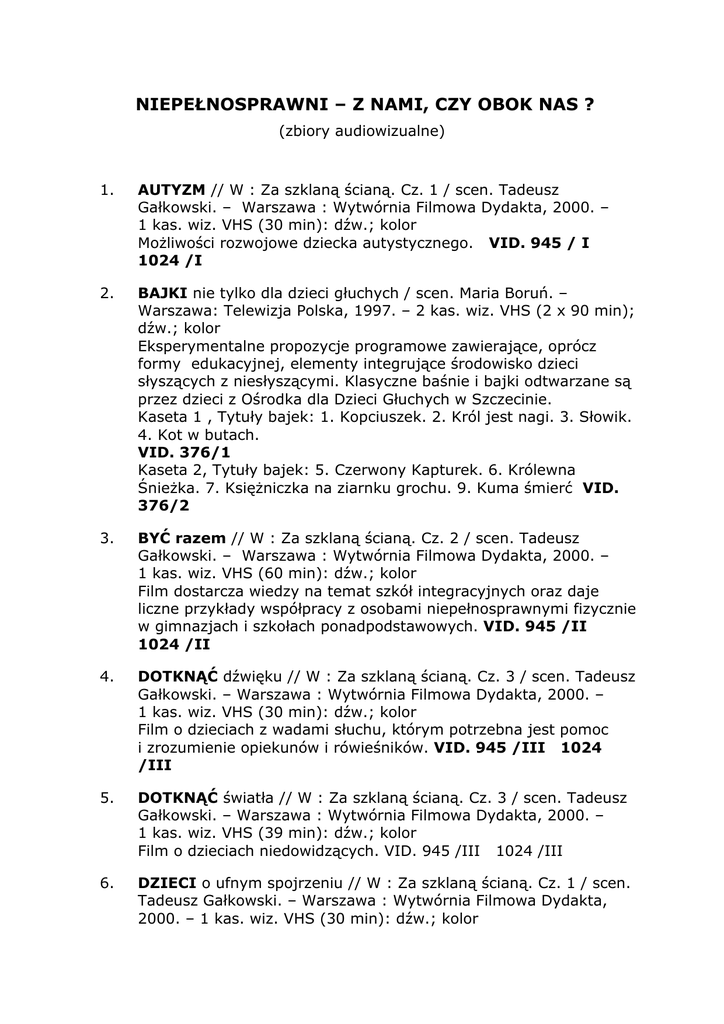 NIEPEŁNOSPRAWNI – Z NAMI, CZY OBOK NAS ? (zbiory audiowizualne) 1. AUTYZM // W : Za szklaną ścianą. Cz. 1 / scen. Tadeusz Gałkowski. – Warszawa : Wytwórnia Filmowa Dydakta, 2000. – 1 kas. wiz. VHS (30 min): dźw.; kolor Możliwości rozwojowe dziecka autystycznego. VID. 945 / I 1024 /I 2. BAJKI nie tylko dla dzieci głuchych / scen. Maria Boruń. – Warszawa: Telewizja Polska, 1997. – 2 kas. wiz. VHS (2 x 90 min); dźw.; kolor Eksperymentalne propozycje programowe zawierające, oprócz formy edukacyjnej, elementy integrujące środowisko dzieci słyszących z niesłyszącymi. Klasyczne baśnie i bajki odtwarzane są przez dzieci z Ośrodka dla Dzieci Głuchych w Szczecinie. Kaseta 1 , Tytuły bajek: 1. Kopciuszek. 2. Król jest nagi. 3. Słowik. 4. Kot w butach. VID. 376/1 Kaseta 2, Tytuły bajek: 5. Czerwony Kapturek. 6. Królewna Śnieżka. 7. Księżniczka na ziarnku grochu. 9. Kuma śmierć VID. 376/2 3. BYĆ razem // W : Za szklaną ścianą. Cz. 2 / scen. Tadeusz Gałkowski. – Warszawa : Wytwórnia Filmowa Dydakta, 2000. – 1 kas. wiz. VHS (60 min): dźw.; kolor Film dostarcza wiedzy na temat szkół integracyjnych oraz daje liczne przykłady współpracy z osobami niepełnosprawnymi fizycznie w gimnazjach i szkołach ponadpodstawowych. VID. 945 /II 1024 /II 4. DOTKNĄĆ dźwięku // W : Za szklaną ścianą. Cz. 3 / scen. Tadeusz Gałkowski. – Warszawa : Wytwórnia Filmowa Dydakta, 2000. – 1 kas. wiz. VHS (30 min): dźw.; kolor Film o dzieciach z wadami słuchu, którym potrzebna jest pomoc i zrozumienie opiekunów i rówieśników. VID. 945 /III 1024 /III 5. DOTKNĄĆ światła // W : Za szklaną ścianą. Cz. 3 / scen. Tadeusz Gałkowski. – Warszawa : Wytwórnia Filmowa Dydakta, 2000. – 1 kas. wiz. VHS (39 min): dźw.; kolor Film o dzieciach niedowidzących. VID. 945 /III 1024 /III 6. DZIECI o ufnym spojrzeniu // W : Za szklaną ścianą. Cz. 1 / scen. Tadeusz Gałkowski. – Warszawa : Wytwórnia Filmowa Dydakta, 2000. – 1 kas. wiz. VHS (30 min): dźw.; kolor Film o dzieciach niepełnosprawnych intelektualnie, którym potrzebna jest pomoc i zrozumienie opiekunów i rówieśników. VID. 945 /I 1024 /I 7. DZIECI portowego miasta // W : Edukacja ludzi niepełnosprawnych. Cz. 2 / scen. Henryk Konieczny. – Warszawa : Telewizja Polska,1996. – 1 kas.wiz. VHS (20 min): dźw.; kolor Wspólna szkoła dla dzieci zdrowych i niepełnosprawnych w Niemczech. VID. 321/2 8. EDUKACJA dla pomocy // W : Edukacja ludzi niepełnosprawnych. Cz. 1 / scen. Henryk Konieczny. – Warszawa : Telewizja Polska, 1996. – 1 kas. wiz. VHS (20 min): dźw.; kolor Rehabilitacja dorosłych po utracie wzroku. Nauka nowych zawodów przez niewidomych we Francji. VID. 321/ 1 9. GRUPA // W : Inna szkoła / scen. i reż. Elżbieta Nekanda – Trepka. Warszawa : Telewizja Polska, 1998. – 1 kas. wiz. VHS (20 min): dźw.;kolor Organizacja pracy w grupie. Wzajemna pomoc i współpraca dzieci zdrowych i niepełnosprawnych (Polska) VID. 677 /2 10. INTEGRACJA // W : Edukacja ludzi niepełnosprawnych. Cz. 1 / scen. Henryk Konieczny. – Warszawa : Telewizja Polska, 1996. – 1 kas. wiz. VHS (20 min): dźw.; kolor Współpraca placówek naukowych i szkolnych w kształceniu dzieci niewidomych i niesłyszących w Belgii VID. 321/ 1 11. INTEGRACJA // W : Inna szkoła / scen. i reż. Elżbieta Nekanda – Trepka. – Warszawa : Telewizja Polska, 1998. – 1 kas. wiz. VHS (20 min): dźw.;kolor Powstanie szkoły integracyjnej i jej osiągnięcia w jednym z miast Polski. VID. 677 /1 12. JESTEM // W : Za szklaną ścianą. Cz. 1 / scen. Tadeusz Gałkowski. – Warszawa : Wytwórnia Filmowa Dydakta, 2000. – 1 kas. wiz. VHS (30 min): dźw.; kolor Problemy dzieci z porażeniem mózgowym, możliwości rozwojowe. VID. 945 /I 1024 /I 13. METODY // W : Inna szkoła / scen. i reż. Elżbieta Nekanda – Trepka. – Warszawa : Telewizja Polska, 1998. – 1 kas. wiz. VHS (20 min): dźw.;kolor. Sposoby pokonywania własnych zahamowań VID. 677 /2 14. MÓZGOWE porażenie dziecięce – Warszawa : Studio Filmów Edukacyjnych Nauka, 2003. – 1 kas. wiz. VHS (100 min): dźw.; kolor Film przedstawia zasady działań usprawniających i możliwości rozwojowe dzieci zporażeniem mózgowym. VID. 1270 15. NAUCZYCIELE // W : Inna szkoła / scen. i reż. Elżbieta Nekanda – Trepka. - Warszawa : Telewizja Polska, 1998. – 1 kas. wiz. VHS (20 min): dźw.;kolor Jakie predyspozycje powinni posiadać nauczyciele w szkołach integracyjnych? VID. 677 /2 16. NIEWIDOMI i niedowidzący // W: Edukacja ludzi niepełnosprawnych. Cz. 1 / scen. Henryk Konieczny. – Warszawa: Telewizja Polska, 1996. – 1 kas. wiz. VHS (20 min): dźw.; kolor Formy i ośrodki kształcenia osób niepełnosprawnych we Francji. VID. 321/ 1 17. NIEWIDOMI i niedowidzący // W : Edukacja ludzi niepełnosprawnych. Cz. 1 / scen. Henryk Konieczny. – Warszawa: Telewizja Polska, 1996. – 1 kas. wiz. VHS (2 x 20 min): dźw.; kolor Nauka niedowidzących w normalnej szkole w Anglii. VID. 321/ 1 18. OSOBY niepełnosprawne w Unii Europejskiej. – Warszawa ; Zakład Wydawnictw Związku Niewidomych, 2003 . – 1 kas. dźw. (80 min) Możliwości kształcenia, status prawny, integracja społeczna. TMK. 6504 19. PRAWO bycia razem // W :Edukacja ludzi niepełnosprawnych. Cz. 2 / scen. Henryk Konieczny. – Warszawa : Telewizja Polska, 1996. – 1 kas. wiz. VHS (20 min): dźw.; kolor Integracja w szkole masowej w Anglii VID. 321/2 20. REHABILITACJA zawodowa // W : Edukacja ludzi niepełnosprawnych. Cz. 2 / scen. Henryk Konieczny – Warszawa : Telewizja Polska,1996. – 1 kas. wiz. VHS (20 min): dźw.; kolor Kształcenie i rekwalifikacja osób niepełnosprawnych. Aktywizacja zawodowa niepełnosprawnych w Niemczech VID. 321/2 21. RODZICE // W : Inna szkoła / scen. i reż. Elżbieta Nekanda – Trepka. – Warszawa : Telewizja Polska, 1998. – 1 kas. wiz. VHS (20 min): dźw.;kolor Szkoły integracyjne w opinii rodziców dzieci niepełnosprawnych i zdrowych VID. 677 /2 