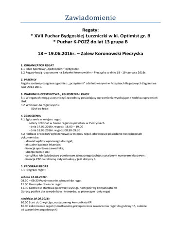 Zawiadomienie Regaty: * XVII Puchar Bydgoskiej Łuczniczki w kl. Optimist gr. B * Puchar K-POZŻ do lat 13 grupa B 18 – 19.06.2016r. – Zalew Koronowski Pieczyska 1. ORGANIZATOR REGAT 1.1 Klub Sportowy „Zjednoczeni” Bydgoszcz. 1.2 Regaty będą rozgrywane na Zalewie Koronowskim - Pieczyska w dniu 18 - 19 czerwca 2016r. 2. PRZEPISY Regaty zostaną rozegrane zgodnie z „przepisami” zdefiniowanymi w Przepisach Regatowych Żeglarstwa ISAF 2013-2016. 3. WARUNKI UCZESTNICTWA , ZGŁOSZENIA I KLASY 3.1 W regatach mogą uczestniczyć zawodnicy posiadający uprawnienia wynikające z Kodeksu uprawnień ISAF. 3.2 Wpisowe do regat wynosi 50 zł od łodzi 4. ZGŁOSZENIA 4.1 Zgłoszenia w miejscu regat: należy dokonać w biurze regat na przystani w Pieczyskach - dnia 17.06.2016r. w godz. 18.00 – 19.00 - dnia 18.06.2016r. w godz.08.30-09.30 4.2 Podczas procedury zgłoszeniowej w miejscu regat, obowiązuje posiadanie następujących dokumentów: - dowód wpłaty wpisowego do regat; -aktualne badania lekarskie; -licencja sportowa zawodnika; -ubezpieczenie OC; -certyfikat lub świadectwo pomiarowe zgłoszonego jachtu z ustalonym numerem klasowym; -licencja PZŻ na reklamę indywidualną / jeśli dotyczy /. 5. PROGRAM REGAT 5.1 Program regat : sobota 18.06.2016r. 08.30 – 09.30 Przyjmowanie zgłoszeń do regat 11.00 Uroczyste otwarcie regat 11.30 Gotowość startowa (pierwszy wyścig), następne wg komunikatu KR Gorący posiłek dla zawodników i trenerów, w pierwszym dniu regat niedziela 19.06.2016r. 10.00 Start do 1 wyścigu, następne wg komunikatu KR 16.00 Zakończenie regat (z możliwością przyspieszenia zakończenia regat do godziny 15, zależne od warunków pogodowych) 5.2 Planowane jest rozegranie 7 wyścigów. W dniu 19.06.2016r. sygnał ostrzeżenia nie może być podany później niż o godz. 12:30 5.3 Jednego dnia regat nie może zostać rozegranych nie więcej niż 4 wyścigów. 6. INSTRUKCJA ŻEGLUGI Instrukcja żeglugi będzie dostępna po zakończeniu procedury zgłoszeniowej. 7. TRASA ROZEGRANIA REGAT Wyścigi rozgrywane będą na trasach stosowanych w regatach międzynarodowych. Trasa regat zostanie przedstawiona w Instrukcji Żeglugi. 8. PUNKTACJA 8.1 Regaty zostaną uznane za ważne po rozegraniu 2 wyścigów. 8.2 Przy rozegraniu 4 i więcej wyścigów, jeden najgorszy rezultat jachtu będzie odrzucany. 9. ŁODZIE TRENERÓW I OBSERWATORÓW Wszystkie motorówki trenerów i obserwatorów uczestniczących w regatach wymagają akredytacji organizatora regat podczas procedury zgłoszeniowej. 10. PRAWO DO WIZERUNKU Zgłaszając się do regat zawodnik wyraża zgodę na bezpłatne wykorzystywanie swego wizerunku przez Organizatorów i sponsorów podczas zdjęć, filmów i innych reprodukcji w czasie trwania regat oraz we wszystkich materiałach dotyczących regat. 11. NAGRODY Za zajęcie miejsc 1-3 zawodnikom wręczone zostaną puchary i medale w regatach XVII Pucharu Bydgoskiej Łuczniczki. Za zajęcie miejsc 1-3 zawodnikom wręczone zostaną puchary i medale w Pucharze K-POZŻ do 13 lat /dotyczy tylko zawodników K-POZŻ/. Za zajęcie miejsc 1-3 w kategoriach wiekowych do lat 9 i od lat 10 do lat 11 zawodnicy otrzymają medale w Pucharze K-POZŻ /dotyczy to zawodników w K-POZŻ/. 12. ZASTRZEŻENIA ODPOWIEDZIALNOŚCI Wszyscy uczestnicy biorą udział w regatach na własną odpowiedzialność. Żadna z czynności wykonana lub nie wykonana przez organizatorów nie zwalnia uczestników regat do ponoszenia odpowiedzialności za jakąkolwiek szkodę spowodowaną przez zawodnika lub jego jacht, czy deskę windsurfingową , wynikającą z udziału w regatach. 13. INFORMACJE I OSOBA KONTAKTOWE ORGANIZATOR: Waldemar Skarżyński Tel.: 601 68 47 62 14. BAZA NOCLEGOWA/WYŻYWIENIE: OW Polonez ul. Okoniowa 3 (Pieczyska) 86-010 Koronowo tel./fax: (052) 382 74 77 tel: (052) 382 74 30 kom. : 503 008 398 e-mail: [email protected]