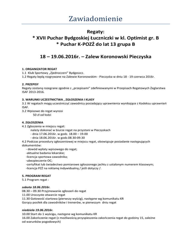 Zawiadomienie o regatach - Klub Sportowy ZJEDNOCZENI