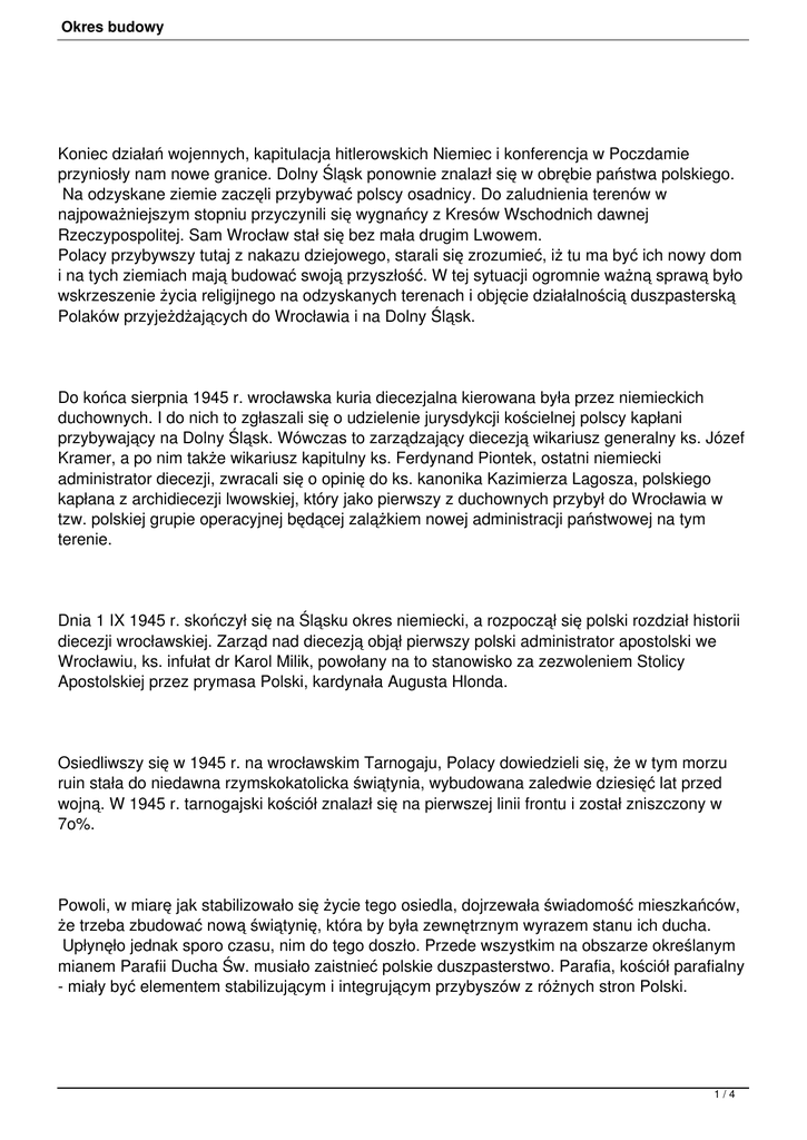Okres budowy Koniec działań wojennych, kapitulacja hitlerowskich Niemiec i konferencja w Poczdamie przyniosły nam nowe granice. Dolny Śląsk ponownie znalazł się w obrębie państwa polskiego. Na odzyskane ziemie zaczęli przybywać polscy osadnicy. Do zaludnienia terenów w najpoważniejszym stopniu przyczynili się wygnańcy z Kresów Wschodnich dawnej Rzeczypospolitej. Sam Wrocław stał się bez mała drugim Lwowem. Polacy przybywszy tutaj z nakazu dziejowego, starali się zrozumieć, iż tu ma być ich nowy dom i na tych ziemiach mają budować swoją przyszłość. W tej sytuacji ogromnie ważną sprawą było wskrzeszenie życia religijnego na odzyskanych terenach i objęcie działalnością duszpasterską Polaków przyjeżdżających do Wrocławia i na Dolny Śląsk. Do końca sierpnia 1945 r. wrocławska kuria diecezjalna kierowana była przez niemieckich duchownych. I do nich to zgłaszali się o udzielenie jurysdykcji kościelnej polscy kapłani przybywający na Dolny Śląsk. Wówczas to zarządzający diecezją wikariusz generalny ks. Józef Kramer, a po nim także wikariusz kapitulny ks. Ferdynand Piontek, ostatni niemiecki administrator diecezji, zwracali się o opinię do ks. kanonika Kazimierza Lagosza, polskiego kapłana z archidiecezji lwowskiej, który jako pierwszy z duchownych przybył do Wrocławia w tzw. polskiej grupie operacyjnej będącej zalążkiem nowej administracji państwowej na tym terenie. Dnia 1 IX 1945 r. skończył się na Śląsku okres niemiecki, a rozpoczął się polski rozdział historii diecezji wrocławskiej. Zarząd nad diecezją objął pierwszy polski administrator apostolski we Wrocławiu, ks. infułat dr Karol Milik, powołany na to stanowisko za zezwoleniem Stolicy Apostolskiej przez prymasa Polski, kardynała Augusta Hlonda. Osiedliwszy się w 1945 r. na wrocławskim Tarnogaju, Polacy dowiedzieli się, że w tym morzu ruin stała do niedawna rzymskokatolicka świątynia, wybudowana zaledwie dziesięć lat przed wojną. W 1945 r. tarnogajski kościół znalazł się na pierwszej linii frontu i został zniszczony w 7o%. Powoli, w miarę jak stabilizowało się życie tego osiedla, dojrzewała świadomość mieszkańców, że trzeba zbudować nową świątynię, która by była zewnętrznym wyrazem stanu ich ducha. Upłynęło jednak sporo czasu, nim do tego doszło. Przede wszystkim na obszarze określanym mianem Parafii Ducha Św. musiało zaistnieć polskie duszpasterstwo. Parafia, kościół parafialny - miały być elementem stabilizującym i integrującym przybyszów z różnych stron Polski. 1/4 Okres budowy Początkowo na Tarnogaju mieszkało dość sporo Niemców, a wśród nich 450 osobowa grupa niemieckich katolików. Duszpasterzował im ich proboszcz, ks. Johannes Gulitz. Niektórzy starsi mieszkańcy osiedla wspominają, że w pierwszych latach (1945-47) chodzili na nabożeństwa do prowizorycznie urządzonej kaplicy-baraku przy ul. Kamienieckiej 72 i uczestniczyli we mszach św. odprawianych po łacinie przez niemieckiego księdza. Istotnie, taka była prawda, przez długie bowiem lata Domem Bożym dla wiernych odgruzowywanej i zaludnianej Polakami wrocławskiej dzielnicy Tarnogaj, była kaplica mieszcząca się w odremontowanym baraku, w którym była niegdyś gospoda. W czasie wojny w baraku tym mieszkali jeńcy wojenni, a w ostatnich miesiącach oblężenia twierdzy Wrocław, mieściła się w nim stajnia dla koni. Uroczyste oddanie wyremontowanego baraku-kaplicy na cele kultu religijnego odbyło się w święto Chrystusa Króla 1945 r. Odtąd największym problemem był brak polskiego kapłana. Pierwszym polskim księdzem sprawującym posługę religijną, gromadzącym Polaków wokół ołtarza, był ksiądz obrządku ormiańskiego Tadeusz Kuntze, przybyły ze Lwowa, który 26 IV 1946 r. ustanowiony został wikariuszem kooperatorem parafii Ducha Św. i św. Henryka. W obu tych parafiach liturgię sprawował w zaimprowizowanych kaplicach. Pierwszym proboszczem Parafii św. Henryka mianowanym 28 VI 1946 r. przez Administrację Apostolską Dolnego Śląska, którego zadaniem było obsługiwanie również Parafii Ducha Św. był ks. Dominik Kostial. Taki stan przejściowy trwał do połowy 1947 r. Od 1 VII 1947 r. Parafia Ducha Św. miała już swojego proboszcza, którym został ks. Jan Dmochowski. Objął on wszakże parafię dopiero po opuszczeniu jej przez niemieckiego proboszcza ks. J. Gulitza, czyli po 29 lipca. Po nim też nowy proboszcz przejął dwupokojowe mieszkanie przy dzisiejszej ul. Tarnogajskiej 57, które równocześnie służyło za kancelarię parafialną. Nabożeństwa nadal odprawiane były we wspomnianej kaplicy-baraku, która stawała się coraz bardziej ciasna, przybywało bowiem wiernych, a powierzchnia kaplicy wynosiła tylko 100 m2. Taka sytuacja utrzymywała się przez ponad 25 lat. Do pierwszych działań, jakie podjął nowy proboszcz, należała próba ustalenia granic podległej parafii. Wskutek wydarzeń dziejowych sytuacja była nieczytelna, granice z okresu przedwojennego przestały być funkcjonalne. Ulice i domy w większości były zburzone, tym samym parafia stała się bardzo okrojona. Ks. proboszcz J. Dmochowski argumentował w kurii, że z taką małą ilością parafian nie będzie mógł odbudować zburzonego kościoła. Z czasem problem doraźnie rozstrzygnięto, ale po latach granice parafii uległy daleko idącym 2/4 Okres budowy modyfikacjom, głównie wskutek rozbudowy miasta. W 1953 r. ks. Dmochowskiemu udało się uzyskać od Prezydium Miejskiej Rady Narodowej m. Wrocławia pozwolenie na odbudowę kościoła i plebanii. W tym czasie stały jeszcze mury niemieckiej świątyni. Jednak prace przy budowie nie zostały podjęte w należytym terminie i pozwolenie cofnięto. W 1954 r. miał miejsce fakt bardzo przykry w skutkach dla parafii. Decyzją ks. K. Lagosza, który wówczas jako wikariusz kapitulny zarządzał diecezją wrocławską, zostały zebrane resztki murów ko