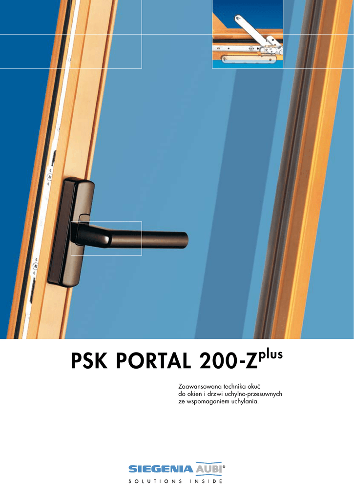 PSK PORTAL 200-Z plus Zaawansowana technika okuć do okien i drzwi uchylno-przesuwnych ze wspomaganiem uchylania. Portal 200-Z plus Komfort i bezpieczeństwo Możliwości plus r s amozabezpieczająca się regulacja wysokości gwarantuje prostą i bezpieczną obsługę rd zięki niewielkim wymiarom nadaje się również do wąskich profili rn ośność do 200kg zapewnia duże rezerwy bezpieczeństwa rw ymagana szerokość ramy tylko 35 mm Zestaw zamka PZ rd ornmassy 30, 40 , 45 i 50 pozwalają na optymalne dopasowanie do wymagań profilu rm ożliwość zamknięcia również w pozycji uchyłu Bezpieczeństwo w każdym narożniku rz integrowana regulacja wysokości optymalnie korygująca różnice luzu okuciowego r lekka obsługa dzięki obrotowym grzybkom rm odułowy system rozbudowy aż do poziomu WK2 r luz okuciowy możliwy od 10 – 15,5 mm po całym obwodzie Informacje techniczne w skrócie: r maksymalny ciężar skrzydła 200 kg r szerokość skrzydła w rowku okuciowym 740 mm – 2000 mm r wysokość skrzydła w rowku okuciowym 1000 mm – 2360 mm r odjazd skrzydła 122 mm r dostępne dla profili z PCV, drewna i aluminium r kolory: srebrny, biały, kremowy, tytanowy, brązowy, średni brąz H4004.2723pl SIEGENIA-AUBI Sp. z o.o. ul. Ossowskiego 64, 46-203 Kluczbork, Tel.: 077 44 77 700, Fax: 077 44 77 720 Dział handlowy: Tel.: 077 44 77 704, 077 44 77 723, 077 44 77 737, 077 44 77 752, Fax: 077 44 77 719 e-mail: [email protected], www.siegenia-aubi.pl