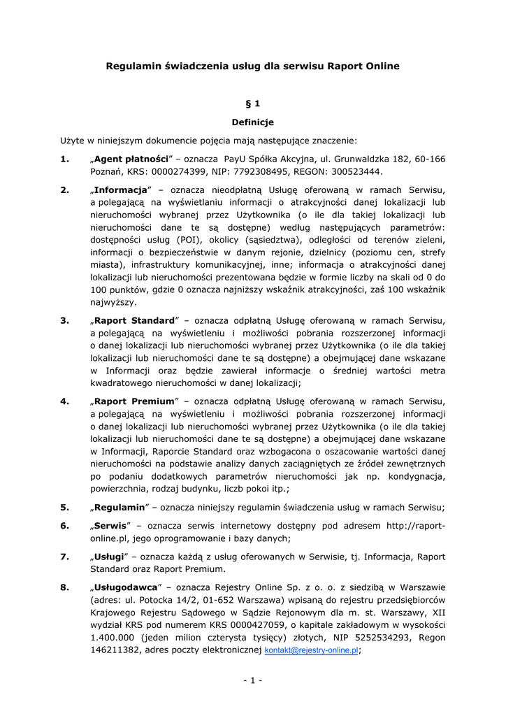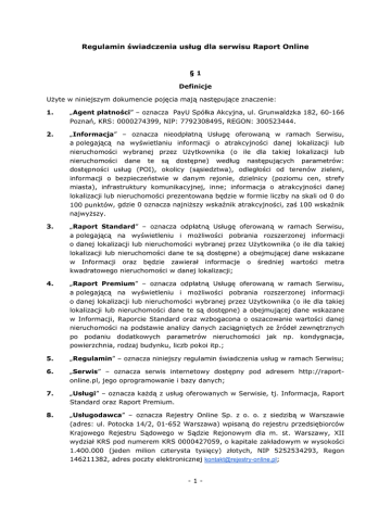 Regulamin świadczenia usług dla serwisu Raport Online §1 Definicje Użyte w niniejszym dokumencie pojęcia mają następujące znaczenie: 1. „Agent płatności” – oznacza PayU Spółka Akcyjna, ul. Grunwaldzka 182, 60-166 Poznań, KRS: 0000274399, NIP: 7792308495, REGON: 300523444. 2. „Informacja” – oznacza nieodpłatną Usługę oferowaną w ramach Serwisu, a polegającą na wyświetlaniu informacji o atrakcyjności danej lokalizacji lub nieruchomości wybranej przez Użytkownika (o ile dla takiej lokalizacji lub nieruchomości dane te są dostępne) według następujących parametrów: dostępności usług (POI), okolicy (sąsiedztwa), odległości od terenów zieleni, informacji o bezpieczeństwie w danym rejonie, dzielnicy (poziomu cen, strefy miasta), infrastruktury komunikacyjnej, inne; informacja o atrakcyjności danej lokalizacji lub nieruchomości prezentowana będzie w formie liczby na skali od 0 do 100 punktów, gdzie 0 oznacza najniższy wskaźnik atrakcyjności, zaś 100 wskaźnik najwyższy. 3. „Raport Standard” – oznacza odpłatną Usługę oferowaną w ramach Serwisu, a polegającą na wyświetleniu i możliwości pobrania rozszerzonej informacji o danej lokalizacji lub nieruchomości wybranej przez Użytkownika (o ile dla takiej lokalizacji lub nieruchomości dane te są dostępne) a obejmującej dane wskazane w Informacji oraz będzie zawierał informacje o średniej wartości metra kwadratowego nieruchomości w danej lokalizacji; 4. „Raport Premium” – oznacza odpłatną Usługę oferowaną w ramach Serwisu, a polegającą na wyświetleniu i możliwości pobrania rozszerzonej informacji o danej lokalizacji lub nieruchomości wybranej przez Użytkownika (o ile dla takiej lokalizacji lub nieruchomości dane te są dostępne) a obejmującej dane wskazane w Informacji, Raporcie Standard oraz wzbogacona o oszacowanie wartości danej nieruchomości na podstawie analizy danych zaciągniętych ze źródeł zewnętrznych po podaniu dodatkowych parametrów nieruchomości jak np. kondygnacja, powierzchnia, rodzaj budynku, liczb pokoi itp.; 5. „Regulamin” – oznacza niniejszy regulamin świadczenia usług w ramach Serwisu; 6. „Serwis” – oznacza serwis internetowy dostępny pod adresem http://raportonline.pl, jego oprogramowanie i bazy danych; 7. „Usługi” – oznacza każdą z usług oferowanych w Serwisie, tj. Informacja, Raport Standard oraz Raport Premium. 8. „Usługodawca” – oznacza Rejestry Online Sp. z o. o. z siedzibą w Warszawie (adres: ul. Potocka 14/2, 01-652 Warszawa) wpisaną do rejestru przedsiębiorców Krajowego Rejestru Sądowego w Sądzie Rejonowym dla m. st. Warszawy, XII wydział KRS pod numerem KRS 0000427059, o kapitale zakładowym w wysokości 1.400.000 (jeden milion czterysta tysięcy) złotych, NIP 5252534293, Regon 146211382, adres poczty elektronicznej [email protected]; -1- 9. „Użytkownik” – każda osoba fizyczna, prawna albo jednostka organizacyjna nieposiadająca osobowości prawnej, korzystająca z Serwisu; §2 Postanowienia ogólne 1. Niniejszy Regulamin określa warunki korzystania z Usług Serwisu. 2. Użytkownicy są zobowiązani do przestrzegania Regulaminu. Korzystanie z oferowanych odpłatnie Usług wymaga uprzedniej akceptacji Regulaminu przez Użytkownika. 3. W ramach oferowanych za pośrednictwem Serwisu Usług Użytkownikowi prezentowane są informacje o wybranych lokalizacjach lub nieruchomościach wraz z ich oceną według kryteriów przyjętych przez Usługodawcę, a także wyceną sporządzoną w oparciu o źródła zewnętrzne. §3 Usługi 1. Serwis w ramach oferowanych Usług umożliwia generowanie i zapoznawanie się z Informacjami, generowanie, zapoznawanie się i pobieranie Raportów Standard oraz raportów Premium. 2. Raport Standard oraz Raport Premium generowane są wyłącznie poprzez wyraźne zamówienie złożone przez Użytkownika potwierdzone zapoznaniem się treścią Regulaminu i naciśnięciem przycisku akceptacji zamówienia danej Usługi. 3. Dane dotyczące oznaczonych nieruchomości a wchodzące w skład Raportu Standard lub Raportu Premium pochodzą z publicznie dostępnych rejestrów i wpisów w księgach wieczystych dla nieruchomości. §3 Warunki korzystania z Serwisu 1. Dostęp do Informacji jest bezpłatny. 2. Dostęp do Raportów Standard oraz Raportów Premium jest każdorazowo płatne, według stawek następujących: 3. (a) Raport Standard – 6,15 złotych (z uwzględnieniem podatku VAT) za jeden Raport Standard; (b) Raport Premium – 18,45 złotych (z uwzględnieniem podatku VAT) za jeden Raport Premium. Płatności za Raporty Standard i Raporty Premium mogą być realizowane wyłącznie za pośrednictwem Agenta płatności na zasadach i według regulaminu dokonywania płatności przewidzianych przez Agenta płatności. -2- 4. Usługodawca zastrzega sobie prawo do zmiany statusu wybranych Usług tj. do wprowadzenia opłat za dostęp bądź wymogu wcześniejszej rejestracji. 5. Do korzystania z Usług niezbędne jest posiadanie przeglądarki internetowej z włączoną obsługą plików cookies, języka XHTML, języka JavaScript oraz kaskadowych arkuszy stylów (CSS). 6. Użytkownicy nie mogą korzystać z oferowanych Usług w sposób powodujący nadmierne obciążenie infrastruktury technicznej Serwisu (np. wysyłając do serwera znaczną liczbę żądań HTTP w krótkim okresie). 7. Korzystanie z Informacji, Raportów Standard lub Raportów Premium dopuszczalne jest wyłącznie dla celów własnych Użytkownika. W szczególności zabronione jest wykorzystywanie, przetwarzanie publikowanie Informacji, Raportów Standard lub Raportów Premium bez zgody Usługodawcy. §4 Reklamacje 1. Reklamacje dotyczące odpłatnych Usług dodatkowych można zgłaszać na piśmie lub drogą elektroniczną na adres poczty elektronicznej [email protected]. 2. Poprawnie złożona reklamacja powinna zawierać dane Użytkownika niezbędne o rozpoznania reklamacji (imię, naz