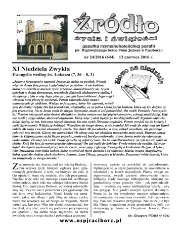 gazetka rzymskokatolickiej parafii pw. Najświętszego Serca Pana Jezusa w Raciborzu nr 24/2016 (644) 12 czerwca 2016 r. XI Niedziela Zwykła Ewangelia według św. Łukasza (7, 36 – 8, 3) „Jeden z faryzeuszów zaprosił Jezusa do siebie na posiłek. Wszedł więc do domu faryzeusza i zajął miejsce za stołem. A oto kobieta, która prowadziła w mieście Ŝycie grzeszne, dowiedziawszy się, Ŝe jest gościem w domu faryzeusza, przyniosła flakonik alabastrowy olejku, i stanąwszy z tyłu u nóg Jego, płacząc, zaczęła łzami oblewać Jego nogi i włosami swej głowy je wycierać. Potem całowała Jego stopy i namaszczała je olejkiem. Widząc to faryzeusz, który Go zaprosił, mówił sam do siebie: Gdyby On był prorokiem, wiedziałby, co za jedna i jaka jest ta kobieta, która się Go dotyka, Ŝe jest grzesznicą. Na to Jezus rzekł do niego: Szymonie, mam ci coś powiedzieć. On rzekł: Powiedz, Nauczycielu! Pewien wierzyciel miał dwóch dłuŜników. Jeden winien mu był pięćset denarów, a drugi pięćdziesiąt. Gdy nie mieli z czego oddać, darował obydwom. Który więc z nich będzie go bardziej miłował? Szymon odpowiedział: Sądzę, Ŝe ten, któremu więcej darował. On mu rzekł: Słusznie osądziłeś. Potem zwrócił się do kobiety i rzekł Szymonowi: Widzisz tę kobietę? Wszedłem do twego domu, a nie podałeś Mi wody do nóg; ona zaś łzami oblała Mi stopy i swymi włosami je otarła. Nie dałeś Mi pocałunku; a ona, odkąd wszedłem, nie przestaje całować nóg moich. Głowy nie namaściłeś Mi oliwą; ona zaś olejkiem namaściła moje nogi. Dlatego powiadam ci: Odpuszczone są jej liczne grzechy, poniewaŜ bardzo umiłowała. A ten, komu mało się odpuszcza, mało miłuje. Do niej zaś rzekł: Twoje grzechy są odpuszczone. Na to współbiesiadnicy zaczęli mówić sami do siebie: KtóŜ On jest, Ŝe nawet grzechy odpuszcza? On zaś rzekł do kobiety: Twoja wiara cię ocaliła, idź w pokoju! Następnie wędrował przez miasta i wsie, nauczając i głosząc Ewangelię o królestwie BoŜym. A było z Nim Dwunastu oraz kilka kobiet, które uwolnił od złych duchów i od słabości: Maria, zwana Magdaleną, którą opuściło siedem złych duchów; Joanna, Ŝona Chuzy, zarządcy u Heroda; Zuzanna i wiele innych, które im usługiwały ze swego mienia.” Z astanówcie się, bracia, nad tak wielką litością... Pan wzywa tych, których ogłasza jako splamionych grzechami, a tych, na których się Ŝali, iŜ Go opuścili, stara się znaleźć, aby ich przygarnąć. Niechaj więc nikt nie marnuje czasu tak wielkiego miłosierdzia, nich nikt nie odtrąca lekarstwa litości BoŜej. Oto najwyŜsza Dobroć, od której odwróciliśmy się, wzywa nas z powrotem i przygotowuje dla nas łono swej łaskawości. Niech kaŜdy się zastanowi, jakie ma długi i gdy Bóg na niego czeka, niech nie odwraca się od Niego ze wzgardą. Niech wróci ten, kto przy Nim nie chciał pozostawać; kto nie dbał, aby stać, niech się podniesie przynajmniej po upadku!... Na siebie więc, najdroŜsi, na siebie zwróćcie oczy swego ducha i pokutującą grzeszną niewiastę weźcie za przykład do naśladowania. Opłakujcie to, o czym pamiętacie, Ŝe zawiniliście w młodości i w latach dojrzałych. Plamy swego postępowania, swych czynów obmywajcie łzami. Miłujmy ślady naszego Odkupiciela, którymi pogardzaliśmy przez grzechy. Oto – jak powiedzieliśmy – otwiera się serce niebiańskiej Litości, aby nas przyjąć. Nie gardzi naszym Ŝyciem skalanym. Przez to, Ŝe się brzydzimy naszym splamieniem, otrzymujemy wewnętrzną czystość. Jeśli powracamy, Pan nas łaskawie przyjmuje. Nie moŜe juŜ być dla Niego niegodnym Ŝycie grzeszników, jeśli oni obmywają je łzami w Chrystusie Jezusie, Panu naszym. św. Grzegorz Wielki († 604) www.nspjraciborz.pl 2 Źródło - gazetka Poniedziałek – 13 czerwca 2016 – św. Antoniego z Padwy, kapłana i doktora Kościoła Mt 5,38-42 630 Za †† rodziców Teodora i Antoninę Libowski, †† dwóch braci Leona i Zygfryda, † Gertrudę Iskra i dusze w czyśćcu cierpiące 900 W int. † siostry Wandy Kucharskiej w kolejną rocznicę śmierci oraz za dusze w czyśćcu cierpiące 1800 1. Do BoŜej Opatrzności w rocznicę urodzin Marka z podziękowaniem za otrzymane łaski, z prośbą o BoŜe błogosławieństwo, umocnienie wiary i zdrowie w całej rodzinie 2. O dar Ŝycia wiecznego dla † mamy Marii, dla †† z rodzin Mostek, Skatuła, Kretek oraz dla † Eryki NaboŜeństwo czerwcowe Wtorek – 14 czerwca 2016 – bł. Michała Kozala, biskupa i męczennika Mt 5,43-48 630 Za † męŜa Józefa Miguła w 15. rocznicę śmierci, † Franciszka Widok, †† rodziców z obu stron oraz za dusze w czyśćcu cierpiące 800 W języku niemieckim: Für verstorbene Eltern Anna und Franz Nowak 1800 1. Do BoŜej Opatrzności z podziękowaniem za otrzymane łaski, z prośbą o dalsze dla Henryka z okazji 65. rocznicy urodzin oraz o BoŜe błogosławieństwo dla całej rodziny 2. Do Miłosierdzia BoŜego za † męŜa Kazimierza Pytel, †† rodziców z obu stron, †† z rodziny i dusze w czyśćcu cierpiące NaboŜeństwo czerwcowe Środa – 15 czerwca 2016 – bł. Jolanty, zakonnicy Mt 6,1-6.16-18 630 Za †† rodziców, siostrę Julię i Martę, szwagra Jana i za † wujka Karola i Martę 900 Za † Marię Woźniak (od rodziny Krolów) Pielgrzymka wiernych i kapłanów dekanatu Pietrowice do Kościoła Jubileuszowego 1800 1. W intencji ks. Proboszcza z okazji 25. rocznicy święceń kapłańskich z prośbą o BoŜe błogosławieństwo i opiekę Matki Najświętszej 2. Do Miłosierdzia BoŜego za † męŜa Antoniego Jabłonka, rodziców z obu stron, pokrewieństwo i dusze w czyśćcu cierpiące 3. Zbiorowa za zmarłych: za †† rodziców Janinę Prędką w 3. rocznicę śmierci, ojca Jana, siostrę Urszulę oraz †† krewnych, za † Marię Woźniak (od Zenki z rodziną z Limanowej), za † Zbigniewa Surma i jego † 