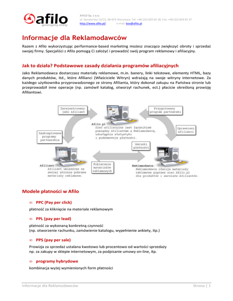 AFILO Sp. z o.o. ul. Senatorska 13/15, 00-075 Warszawa, Tel. +48 (22) 829 65 38, Fax: +48 (22) 829 65 37 http://www.afilo.pl/ e-mail: [email protected] Informacje dla Reklamodawców Razem z Afilo wykorzystując performance-based marketing możesz znacząco zwiększyć obroty i sprzedaż swojej firmy. Specjaliści z Afilo pomogą Ci założyć i prowadzić swój program reklamowy i afiliacyjny. Jak to działa? Podstawowe zasady działania programów afiliacyjnych Jako Reklamodawca dostarczasz materiały reklamowe, m.in. banery, linki tekstowe, elementy HTML, bazy danych produktów, itd., które Afilianci (Właściciele Witryn) wdrażają na swoje witryny internetowe. Za każdego użytkownika przyprowadzonego ze strony Afilianta, który dokonał zakupu na Państwa stronie lub przeprowadził inne operacje (np. zamówił katalog, otworzył rachunek, ect.) płacicie określoną prowizję Afiliantowi. Modele płatności w Afilo • PPC (Pay per click) płatność za kliknięcie na materiale reklamowym • PPL (pay per lead) płatność za wykonaną konkretną czynność (np. otworzenie rachunku, zamówienie katalogu, wypełnienie ankiety, itp.) • PPS (pay per sale) Prowizja za sprzedaż ustalana kwotowo lub procentowo od wartości sprzedaży np. za zakupy w sklepie internetowym, za podpisanie umowy on-line, itp. • programy hybrydowe kombinacja wyżej wymienionych form płatności Informacje dla Reklamodawców Strona | 1 AFILO Sp. z o.o. ul. Senatorska 13/15, 00-075 Warszawa, Tel. +48 (22) 829 65 38, Fax: +48 (22) 829 65 37 http://www.afilo.pl/ e-mail: [email protected] Benefity – natychmiastowy zwrot z inwestycji Marketing afiliacyjny jest znakomitym dodatkiem do marketingu mix Wysokie zarobki i niskie koszty • • wyższy zwrot z inwestycji w porównaniu z tradycyjnymi kampaniami internetowymi lepsze wskaźniki klikalności materiałów promocyjnych przygotowanych przez nas (reklamy nakierowane na promowanie produktów) Lepsza kontrola • • • szczegółowe statystyki monitoring wszystkich zdarzeń (kliki, leady, sprzedaż) antyFRAUD – systemy zabezpieczeń przed nieuczciwym nabijaniem statystyk (kliknięcia) Zdobywanie nowych Klientów i obszarów rynku - bogata oferta witryn pogrupowanych tematycznie - budowa „wirtualnej” sieci sprzedaży (przedstawicieli handlowych) Zostań Reklamodawcą w Afilo i korzystaj: • wysoka jakość sieć afiliacyjna gwarantuje Reklamodawcom wysoką jakość naszych usług oraz efektywną i przyjazną platformę technologiczną • doradztwo marketingowe nasza sieć afiliacyjna AfiloNET ma w swoim zespole profesjonalistów, z ponad 10 letnim doświadczeniem, którzy pomagają dobrać i zainstalować programy afiliacyjne • wysokie standardy bezpieczeństwa Afilo zapewnia doskonały pomiar i monitoring ilości kliknięć leadów i sprzedaży • elastyczność Do każdego Klienta podchodzimy indywidualnie, oferujemy innowacyjne pomysły w rozwijaniu materiałów reklamowych udostępnianych witrynom w celu promocji oraz stałą optymalizację działań • wygoda wszystko jest dostępne w jednym miejscu, łatwe zarządzanie, łatwe rozliczanie, jedna faktura, jeden opiekun, jeden system. Informacje dla Reklamodawców Strona | 2 AFILO Sp. z o.o. ul. Senatorska 13/15, 00-075 Warszawa, Tel. +48 (22) 829 65 38, Fax: +48 (22) 829 65 37 http://www.afilo.pl/ e-mail: [email protected] Płacisz za efekt Nasze hasło to „generujemy efekty”. W Afilo płacisz za zrealizowany efekt. Dajemy Ci możliwość realizowania kampanii rozliczanej za efekt na wielu witrynach zrzeszonych w naszej sieci. Pobieramy jedynie prowizję od pieniędzy wypłacanych właścicielom witryn. Oprócz kosztów administracji, serwowania i zarządzania reklamami ta opłata pokrywa koszty utrzymania konta w systemie, organizację i realizację płatności dla Afiliantów, bieżącą kontrolę jakości, rozwój oprogramowania i sieci oraz koszty obsługi osobowej komunikacji z Afiliantami. Zgodnie z naszym mottem, że płacisz jedynie za efekty w sieci AfiloNET panują następujące zasady: • nie ma kosztów wstępnych (np. za założenia programu afiliacyjnego) • nie ma wartości minimalnej sprzedaży • nie ma opłat licencyjnych Przegląd usług Afilo dla Reklamodawców W ramach członkostwa w sieci afiliacyjnej AfiloNET oferujemy Reklamodawcom szereg dodatkowych narzędzi i usług: • Afilo MANAGER – udostępnia wszystkie, proste w użyciu, funkcjonalności, m.in. zarządzanie materiałami reklamowymi, monitorowanie, zarządzanie płatnościami, zarządzanie programem afiliacyjnym, itd. • Afilo SOLUTION– udostępnienie profesjonalnego oprogramowania do zarządzania programami afiliacyjnymi w sposób bardziej efektywny – służący do wdrożenia dynamicznych form reklamowych (tzw. feedów, sklepów, itp.). • Afilo SERVICE – serwis zorientowany na Klientów zawierający wszystkie funkcjonalności do prostego i efektywnego zarządzania programami afiliacyjnymi. Afilo MANAGER Sieć afiliacyjna to miejsce gdzie spotyka się duża liczba Reklamodawców z reklamą ich produktów i witryn internetowych oraz prywatni Afilianci i firmy z ich witrynami, którzy udostępniają miejsce na reklamę. Dla obu stron – Reklamodawcy i Afilianta – sieć afiliacyjna udostępnia dużą gamę skutecznych rozwiązań. Po rejestracji, program afiliacyjny poprowadzi użytkownika do jego konta poprzez kontakty, programy afiliacyjne, wdrożenie materiałów reklamowych oraz zarządzanie raportami. W Afilo robimy o wiele więcej. Prowadzimy całą kampanię dla Reklamodawcy, włączając w to rozliczanie się z właścicielami witryn, zarządzanie materiałami reklamowymi. Reklamodawca tylko dostarcza produkt, my zajmujemy się resztą. Nasi Reklamodawcy mają dostęp do narzędzi administracyjnych służących zarządzaniu programami afiliacyjnymi. Te dogodne aplikacje czynią administrowanie i dystrybucję materiałów reklamowych oraz wykonywane operacje w programie afiliacyjnym, 