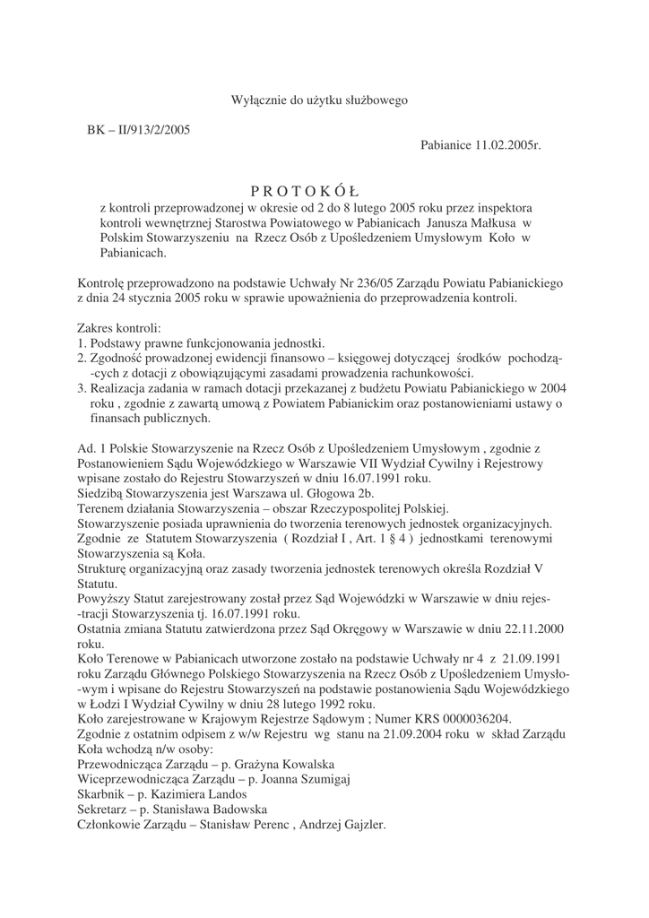 Wył cznie do u ytku słu bowego BK – II/913/2/2005 Pabianice 11.02.2005r. PROTOKÓŁ z kontroli przeprowadzonej w okresie od 2 do 8 lutego 2005 roku przez inspektora kontroli wewn trznej Starostwa Powiatowego w Pabianicach Janusza Małkusa w Polskim Stowarzyszeniu na Rzecz Osób z Upo ledzeniem Umysłowym Koło w Pabianicach. Kontrol przeprowadzono na podstawie Uchwały Nr 236/05 Zarz du Powiatu Pabianickiego z dnia 24 stycznia 2005 roku w sprawie upowa nienia do przeprowadzenia kontroli. Zakres kontroli: 1. Podstawy prawne funkcjonowania jednostki. 2. Zgodno prowadzonej ewidencji finansowo – ksi gowej dotycz cej rodków pochodz -cych z dotacji z obowi zuj cymi zasadami prowadzenia rachunkowo ci. 3. Realizacja zadania w ramach dotacji przekazanej z bud etu Powiatu Pabianickiego w 2004 roku , zgodnie z zawart umow z Powiatem Pabianickim oraz postanowieniami ustawy o finansach publicznych. Ad. 1 Polskie Stowarzyszenie na Rzecz Osób z Upo ledzeniem Umysłowym , zgodnie z Postanowieniem S du Wojewódzkiego w Warszawie VII Wydział Cywilny i Rejestrowy wpisane zostało do Rejestru Stowarzysze w dniu 16.07.1991 roku. Siedzib Stowarzyszenia jest Warszawa ul. Głogowa 2b. Terenem działania Stowarzyszenia – obszar Rzeczypospolitej Polskiej. Stowarzyszenie posiada uprawnienia do tworzenia terenowych jednostek organizacyjnych. Zgodnie ze Statutem Stowarzyszenia ( Rozdział I , Art. 1 § 4 ) jednostkami terenowymi Stowarzyszenia s Koła. Struktur organizacyjn oraz zasady tworzenia jednostek terenowych okre la Rozdział V Statutu. Powy szy Statut zarejestrowany został przez S d Wojewódzki w Warszawie w dniu rejes-tracji Stowarzyszenia tj. 16.07.1991 roku. Ostatnia zmiana Statutu zatwierdzona przez S d Okr gowy w Warszawie w dniu 22.11.2000 roku. Koło Terenowe w Pabianicach utworzone zostało na podstawie Uchwały nr 4 z 21.09.1991 roku Zarz du Głównego Polskiego Stowarzyszenia na Rzecz Osób z Upo ledzeniem Umysło-wym i wpisane do Rejestru Stowarzysze na podstawie postanowienia S du Wojewódzkiego w Łodzi I Wydział Cywilny w dniu 28 lutego 1992 roku. Koło zarejestrowane w Krajowym Rejestrze S dowym ; Numer KRS 0000036204. Zgodnie z ostatnim odpisem z w/w Rejestru wg stanu na 21.09.2004 roku w skład Zarz du Koła wchodz n/w osoby: Przewodnicz ca Zarz du – p. Gra yna Kowalska Wiceprzewodnicz ca Zarz du – p. Joanna Szumigaj Skarbnik – p. Kazimiera Landos Sekretarz – p. Stanisława Badowska Członkowie Zarz du – Stanisław Perenc , Andrzej Gajzler. - 2 Zgodnie z postanowieniami Art. 20.2 Ustawy z dnia 7 kwietnia 1989 roku Prawo o Stowa-rzyszeniach ( tekst jednolity: Dz.U. z 2001r. Nr 79 poz.855 ) Zarz d terenowej jednostki organizacyjnej w przypadku zmian w składzie Zarz du i adresie siedziby terenowej jednos-tki oraz w statucie Stowarzyszenia , w terminie 14 dni od chwili dokonania tych zmian jest zobowi zany zawiadomi o tym organ nadzoruj cy wła ciwy ze wzgl du na siedzib tej jednostki. Zgodnie z Art. 8.1.2 cytowanej wy ej ustawy , organem nadzoruj cym funkcjo-nowanie kontrolowanej jednostki jest Starosta Powiatowy. Do dnia rozpocz cia kontroli jednostka nie powiadomiła organ nadzoruj cy o zmianach w składzie Zarz du Koła dokonanych we wrze niu 2004 roku. Z wydruku sporz dzonego przez Wydział Infrastruktury Społecznej i Spraw Obywatelskich zawieraj cego informacje o jednostce wg stanu na dzie 01.02.2005 roku ( zał cznik nr 1 do protokołu z kontroli ) wynikało , e w skład Zarz du Koła wchodzi 13 osób , w tym 8 człon-kół Zarz du , a ostatnia aktualizacja danych miała miejsce w dniu 28.11.2003 roku. W dniu 4 lutego 2005 roku Zarz d Koła zło ył w Wydziale Infrastruktury Społecznej i Spraw Obywatelskich stosowne zawiadomienie o aktualnym składzie Zarz du Koła. Powy sze zawiadomienie jest zał cznikiem nr 2 do protokołu z kontroli. Ad. 2 Rachunkowo jednostki winna by prowadzona na zasadach okre lonych w ustawie o rachunkowo ci oraz Rozporz dzeniu Ministra Finansów z dnia 15 listopada 2001 roku w sprawie szczegółowych zasad rachunkowo ci dla niektórych jednostek nie b d cych spółka-mi handlowymi , nie prowadz cych działalno ci gospodarczej ( Dz.U. z 2001r. Nr 137 , poz. 1539 ). Zgodnie z postanowieniami Art. 2.1.7 ustawy o rachunkowo ci przepisy ustawy winny stoso-wa jednostki otrzymuj ce na realizacj zada zleconych dotacje lub subwencje z bud etu pa stwa , bud etów jednostek samorz du terytorialnego lub funduszów celowych. W roku 2004 jednostka otrzymywała dotacje z bud etu Powiatu Pabianickiego na realizacj zadania zleconego przez Powiat Pabianicki , równie w roku 2005 realizacja powy szego za-dania b dzie dotowana z wymienionych powy ej rodków. Natomiast obowi zek stosowania zasad w zakresie prowadzenia rachunkowo ci w oparciu o wymienione powy ej Rozporz dzenie wynika z postanowie § 1.1 Rozporz dzenia , bez wzgl du czy jednostka otrzymuje w/w dotacji lub subwencje. Zgodnie z postanowieniami Art. 10 ustawy o rachunkowo ci oraz § 2.6 Rozporz dzenia, jednostka powinna posiada dokumentacj opisuj c przyj te przez jednostk zasady prowa-dzenia rachunkowo ci , w tym zakładowy plan kont , ustalaj cy wykaz kont ksi gi głównej, przyj te zasady klasyfikacji zdarze , zasady prowadzenia ksi g pomocniczych ( je li takie s prowadzone ) oraz ich powi zania z kontami ksi gi głównej. Dokumentacji o której mowa powy ej jednostka nie posiada , równie zestawienia obrotów i sald nie były sporz dzane. Obowi zek sporz dzania zestawie obrotów i sald na podstawie zapisów z kont ksi gi głów-nej na koniec ka dego miesi ca wynika z zapisów Art. 18 ustawy o rachunkowo ci. Przychody i koszty działalno ci jednostki ewidencjonowane s w prowadzonej przez jednos-tk ksi dze głównej , w której zgodnie z § 2.2 Rozporz dzenia odr bnie s ewidencjonowane przychody z otrzymanych dotacji oraz koszty prowadzonej działalno ci z podziałem na rodza-je ponoszonych kosztów zgodnie z § 2.3 Rozporz dzenia , w tym koszty sfinansowane z otrzymanych dotacji. W roku 2004 