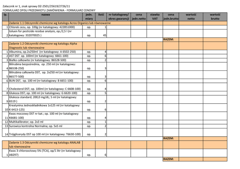 Załacznik nr 1, znak sprawy DZ-2501/25619/2726/11 FORMULARZ OPISU PRZEDMIOTU ZAMÓWIENIA - FORMULARZ CENOWY lp. nazwa jedn. ilość nr katalogowy/ cena miary okres gwarancji jedn.netto Zadanie 1.1 Odczynniki chemiczne wg katalogu Acros Organics lub równoważne op. 1 1 Chlorek cezu, op. 100g (nr katalogowy: 422851000) toluen for pesticide residue analysis, op./2,5 l (nr op. 45 2 katalogowy: 332070025 ) stawka VAT cena jedn.brutto RAZEM: Zadanie 1.2 Odczynniki chemiczne wg katalogu Alpha Diagnostic lub równoważne Albumina, op.2x250ml (nr katalogowy: A 6502-250) AST DST op. 100ml (nr katalogowy: 6661-100) Białko całkowite (nr katalogowy: B6528-500) Bilirubina bezpośrednia, op. 250 ml (nr katalogowy: B6538-250) Bilirubina całkowita DST, op. 2x250 ml (nr katalogowy: B6577-500) BUN DST, op. 100 ml (nr katalogowy: B 6651-100) op. op. op. 4 6 2 op. 3 op. op. 3 6 7 Cholesterol DST; op. 100ml (nr katalogowy: C 6608-100) 8 Glukoza DST; op. 100 ml (nr katalogowy: G 6620-100) Glukoza standard; 200,0 mg/dL; 5 ml (nr katalogowy: 9 6519 ) Kreatynina Jednoskładnikowa 1x125 ml (nr katalogowy: 10 K 6413-125) Kwas moczowy DST nr kat.; op. 100 ml (nr katalogowy: 11 K6681-100) 12 Multikalibrator; op. 2x3 ml 13 Surowica kontrolna Normalna; op. 5x5 ml op. op. 4 5 op. 2 op. 6 op. op. op. 4 1 2 14 Trójglicerydy DST op 100 ml (nr katalogowy: T6630-100) op. 2 1 2 3 4 5 6 RAZEM: Zadanie 1.3 Odczynniki chemiczne wg katalogu ANALAB lub równoważne Kwas 3-chlorooctowy 5% (TCA), op/1 litr (nr katalogowy: 1 AB297) op. 6 RAZEM: wartość netto wartość brutto Zadanie 1.4 Odczynniki chemiczne wg katalogu Carolina Biological lub równoważne Newman Lampert Stain, op. 500 ml (nr katalogowy: 871 6925) 2 Scyntylator ciekły (nr katalogowy: ME-COC-GS1) op. op. 1 2 3 Żywica strontowa (Sr-resin) (nr katalogowy: SR-B-100-A) op. 1 RAZEM: Zadanie 1.5 Odczynniki chemiczne wg katalogu BIO RAD lub równoważne 30% Acrylamide/Bis Solution, 29:1 (nr katalogowy: 1611 0156) 2 APS- Amonium persulfate (nr katalogowy: 161-0700) 3 TEMED (nr katalogowy: 161-0801) op op op 2 1 2 RAZEM: Zadanie 1.6 Odczynniki chemiczne wg katalogu Crison lub równoważne 1 bufor, pH=4,01 (nr katalogowy: 94-60) 2 bufor, pH=7,0; 125 ml (nr katalogowy: 94-61) op. 2 2 RAZEM: Zadanie 1.7 Odczynniki chemiczne wg katalogu BIOMEDA lub równoważne 1 10x automation Buffer pH 7.5 (nr katalogowy: M30) op 1 RAZEM: 1 2 3 4 Zadanie 1.8 Odczynniki chemiczne wg katalogu BioMerieux lub równoważne Evans Blue (nr katalogowy: 75491) Fluoprep, op. 1 x 15 ml (nr katalogowy: 75521) NaCl 0,85% Medium (nr katalogowy: 20070) NaCl 0,85% medium 5ml (nr katalogowy: 20230) op. op. op. op. 3 2 15 1 RAZEM: Zadanie 1.9 Odczynniki chemiczne wg katalogu BORPOL lub równoważne Zestaw do oznaczania białka całkowitego op/2x250 ml 1 (nr katalogowy: 11500) Zestaw do oznaczania glukozy op/1x500 ml (nr 2 katalogowy: 11504) op 2 op 1 RAZEM: 1 2 3 4 Zadanie 1.10 Odczynniki chemiczne wg katalogu BOULE MEDICAL AP lub równoważne Cleaning Kit (nr katalogowy: 1504111) Detectoterge 5 l (nr katalogowy: 1504103) Diluid AC 900 20 l (nr katalogowy: 1504103) Lyse diff AC 900 cyanide free 5 l (nr katalogowy: 1504104) op. op. op. 2 4 8 op. 4 RAZEM: Zadanie 1.11 Odczynniki chemiczne wg katalogu WAKO lub równoważne 1-AN(1-anthroyl cyjanide) 100 mg (nr katalogowy: 0171 12101) op. 1 RAZEM: Zadanie 1.12 Odczynniki chemiczne wg katalogu BTL lub równoważne 1 Pepsyna 2.000 FIP/G 500g (nr katalogowy: E-0161 ) op. 20 RAZEM: Zadanie 1.13 Odczynniki chemiczne wg katalogu Chempur lub równoważne Kwas siarkowy 2mol/l roztwór mianowany, op/ 1litr (nr 1 katalogowy: 815749500) Kwas siarkowy 2mol/l roztwór mianowany, op/500ml (nr 2 katalogowy: 815749500) op. 4 op. 2 RAZEM: Zadanie 1.14 Odczynniki chemiczne wg katalogu Virion lub równoważne 1 buffer veronal saline,op/2 l (nr katalogowy: 9009) szt. 10 RAZEM: Zadanie 1.15 Odczynniki chemiczne wg katalogu DAKO CYTOMATION lub równoważne 1 Glycergel Mounting Medium (nr katalogowy: C056330) op. 2 2 polyclonal goat anti mouse/AP (nr katalogowy: D0486) 3 Proteinaza K, op./ 15 ml (nr katalogowy: S302080) op. op. 2 1 RAZEM: Zadanie 1.16 Odczynniki chemiczne wg katalogu FERMENTAS lub równoważne 1 10X TBE (Tris-borate-EDTA) (nr katalogowy: B52) 50X TAE Electrophoresis Buffer, op/1000ml (nr 2 katalogowy: B49) 3 GeneJET Plasmid Miniprep Kit (nr katalogowy: K0502) 4 IPTG Solution, ready-to-use (nr katalogowy: R1171) 5 TopVision Agarose, 100g (nr katalogowy: R0491) 6 X-Gal solution ready-to-use (nr katalogowy: R0941) op. 51 op op. op. op. op. 10 5 1 13 1 RAZEM: Zadanie 1.17 Odczynniki chemiczne wg katalogu Thermo Scientific Pierce lub równoważne 1 2 mg/ml BSA Standard Ampules (nr katalogowy: 23209) 2 20xTBS Tween - 20 buffer (nr katalogowy: 28360) Phosphate Buffered Saline, op. 1000 ml (nr katalogowy: 3 SH30256.02) op. op. 1 4 op. 1 RAZEM: Zadanie 1.18 Odczynniki chemiczne wg katalogu FOSS ELECTRIC lub równoważne BactoScan 8000 Control Sample (nr katalogowy: (P/N 1 59559)) 2 Buffer Powder (nr katalogowy: P/N 431163) op. szt. 1 4 3 Calibration Suspension BZ (nr katalogowy: P/N 431791) 4 Emulsifier (nr katalogowy: P/N 431197) 5 Enzyme (nr katalogowy: P/N 431189) Ethidium bromide (Foss Dye) 100 mg; op. 10 tabletek (nr 6 katalogowy: 342147) 7 Fossomatic Dye Tablets (nr katalogowy: P/N 342147) 8 Gradient (nr katalogowy: P/N 431171) 9 Lysing Powder (nr katalogowy: P/N 431155) 10 Membrane Disc Filters (nr katalogowy: P/N 702027) 11 Reagent D Clean 5000 (nr katalogowy: P/N 1010901) 12 S-470 Liquid do MSC (nr katalogowy: P/N 509935) op. op. op. 1 2 1 op. op. op. szt. op. op. op. 2 1 2 2 1 1 1 13 S-6060 Zero Liquid do MSC (nr katalogowy: P/N 509919) 14 Staining Medium (nr katalogowy: P/N 431213) op. op. 1 1 RAZEM: Zadanie 1.19 Odczynniki chemiczne wg katalogu Funke Gerber lub równoważne 1 Calibration Standard A (nr katalogowy: 7165) 2 Calibration Standard B (nr katalogowy: 7166) 3 Cooling Bath Fluid for CryoStar (nr katalogowy: 7169) op. op. szt. 2 2 2 RAZEM: Zadanie 1.20 Od