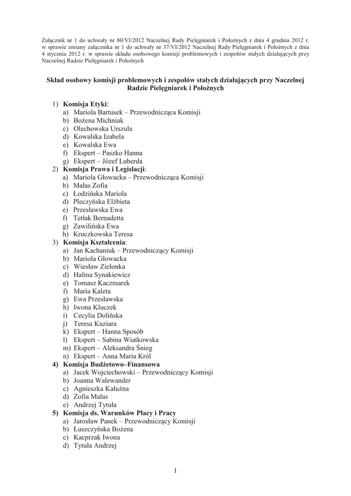 Załącznik nr 1 do uchwały nr 80/VI/2012 Naczelnej Rady PielĊgniarek i PołoĪnych z dnia 4 grudnia 2012 r. w sprawie zmiany załącznika nr 1 do uchwały nr 37/VI/2012 Naczelnej Rady PielĊgniarek i PołoĪnych z dnia 4 stycznia 2012 r. w sprawie składu osobowego komisji problemowych i zespołów stałych działających przy Naczelnej Radzie PielĊgniarek i PołoĪnych Skład osobowy komisji problemowych i zespołów stałych działających przy Naczelnej Radzie PielĊgniarek i PołoĪnych 1) Komisja Etyki: a) Mariola Bartusek – Przewodnicząca Komisji b) BoĪena Michniak c) Olechowska Urszula d) Kowalska Izabela e) Kowalska Ewa f) Ekspert – Paszko Hanna g) Ekspert – Józef Luberda 2) Komisja Prawa i Legislacji: a) Mariola Głowacka – Przewodnicząca Komisji b) Małas Zofia c) ŁodziĔska Mariola d) PleczyĔska ElĪbieta e) Przesławska Ewa f) Tetłak Bernadetta g) ZawiliĔska Ewa h) Kruczkowska Teresa 3) Komisja Kształcenia: a) Jan Kachaniuk – Przewodniczący Komisji b) Mariola Głowacka c) Wiesław Zielonka d) Halina Synakiewicz e) Tomasz Kaczmarek f) Maria Kaleta g) Ewa Przesławska h) Iwona Kluczek i) Cecylia DoliĔska j) Teresa Kuziara k) Ekspert – Hanna Sposób l) Ekspert – Sabina Wiatkowska m) Ekspert – Aleksandra ĝnieg n) Ekspert – Anna Maria Król 4) Komisja BudĪetowo–Finansowa a) Jacek Wojciechowski – Przewodniczący Komisji b) Joanna Walewander c) Agnieszka KałuĪna d) Zofia Małas e) Andrzej Tytuła 5) Komisja ds. Warunków Płacy i Pracy a) Jarosław Panek – Przewodniczący Komisji b) ŁuszczyĔska BoĪena c) Kacprzak Iwona d) Tytuła Andrzej 1 6) 7) 8) 9) e) Kusiak Danuta f) Zaczyk ElĪbieta g) Ekspert – Zofia Małas Komisja ds. Kontraktowania ĞwiadczeĔ zdrowotnych a) Matusiak Maria – Przewodnicząca Komisji b) BłaĪejowska-Kopiczak Barbara c) Wiatkowska Sabina d) PleczyĔska ElĪbieta e) Krzysztyniak Tomasz f) Kowalska Izabela g) Sebastian Irzykowski Komisja ds. PołoĪnych a) Beata ĩółkiewska – Przewodnicząca Komisji b) Adamczyk-WiĞniewska Danuta c) Kaleta Maria d) Kowalska Izabela e) Laska Justyna f) Ekspert – Ewa Janiuk g) Ekspert – Barbara Gardyjas Zespół ds. Ratownictwa medycznego a) Ewa ĝlązak – Przewodnicząca Zespołu b) Urszula Szostak c) Wiesław Zielonka Zespół ds. Promocji zawodów a) Andrzej Tytuła – Przewodniczący Zespołu b) Stachowicz GraĪyna c) Irzykowski Sebastian d) Ekspert – Stanisław Łukasik e) Ekspert – Danuta Adamczyk-WiĞniewska 2