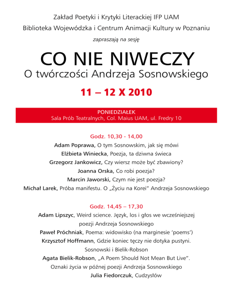 Zakład Poetyki i Krytyki Literackiej IFP UAM Biblioteka Wojewódzka i Centrum Animacji Kultury w Poznaniu zapraszają na sesję Co nie niweczy O twórczości Andrzeja Sosnowskiego 11 – 12 X 2010 Poniedziałek Sala Prób Teatralnych, Col. Maius UAM, ul. Fredry 10 Godz. 10,30 - 14,00 Adam Poprawa, O tym Sosnowskim, jak się mówi Elżbieta Winiecka, Poezja, ta dziwna świeca Grzegorz Jankowicz, Czy wiersz może być zbawiony? Joanna Orska, Co robi poezja? Marcin Jaworski, Czym nie jest poezja? Michał Larek, Próba manifestu. O „Życiu na Korei” Andrzeja Sosnowskiego Godz. 14,45 – 17,30 Adam Lipszyc, Weird science. Język, los i głos we wcześniejszej poezji Andrzeja Sosnowskiego Paweł Próchniak, Poema: widowisko (na marginesie ‘poems’) Krzysztof Hoffmann, Gdzie koniec tęczy nie dotyka pustyni. Sosnowski i Bielik-Robson Agata Bielik-Robson, „A Poem Should Not Mean But Live”. Oznaki życia w późnej poezji Andrzeja Sosnowskiego Julia Fiedorczuk, Cudzysłów * Godz. 18, Centrum Kultury Zamek – z cyklu Jaskinia Filozofów i Pisarzy – MIEJSCE PIĘKNA – Agata Bielik-Robson, Adam Lipszyc, Andrzej Sosnowski Wtorek Sala Prób Teatralnych, Col. Maius UAM, ul. Fredry 10 Godz. 10,00 – 14,30 Dorota Kozicka, Czy krytyk może być poetą? O ryzykownym czytaniu Andrzeja Sosnowskiego Aldona Kopkiewicz, Uprowadzony przez obraz, przechwycony przez dźwięk. O obcych słowach w poezji Andrzeja Sosnowskiego Grzegorz Olszański, Pióro Sosnowskiego i aparat Atkinsa. Rzecz o poezji i fotografii Jakub Momro, Akustyka powtórzenia. Andrzej Sosnowski i kwestia głosu Anna Kałuża, Powietrze. Poezja Andrzeja Sosnowskiego w perspektywie filozofii sztuki ziemi i nowych mediów Alina Świeściak, Andrzeja Sosnowskiego przygody z czasem Jacek Gutorow, Mutacja Godz. 15,00 – 18,00 Joanna Roszak, Kim jestem Ja i kim jesteś Ty (w poezji Andrzeja Sosnowskiego)? Inez Okulska, Miłość, fetysz i spotkanie języków Maria Beszterda, (Nie)swoistość codzienności według Sosnowskiego Natalia Rapp, Gra (ze) śmiercią Karolina Felberg, Andrzej Sosnowski: pozycje