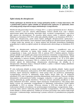 Informacja Prasowa Kraków 22.09.2011 r. Zgłoś nianię do ubezpieczeń Nianie opiekujące się dziećmi do lat 3 mogą spokojniej myśleć o swojej emeryturze. Od 1 października państwo opłaci składki na ubezpieczenia społeczne za opiekunki, które otrzymują pensję nieprzekraczającą minimalnego wynagrodzenia. Możliwość taką przewiduje Ustawa z 4 lutego 2011 r. o opiece nad dziećmi do lat 3. Rodzice, muszą zawrzeć z nią tzw. umowę uaktywniającą. Umowa określa m.in. czas i miejsce sprawowania opieki nad pociechą, obowiązki niani, wysokość wynagrodzenia i czas przez jaki umowa ma obowiązywać. Po zawarciu takiej umowy jeden z rodziców zgłasza w Zakładzie na formularzu ZUS ZFA siebie jako płatnika składek, a na formularzu ZUS ZUA nianię jako ubezpieczoną, jeżeli niania będzie podlegała ubezpieczeniom społecznym i ubezpieczeniu zdrowotnemu. Jeżeli natomiast niania podlega już ubezpieczeniom społecznym z innego tytułu (np. pracuje już w innym miejscu lub prowadzi pozarolniczą działalność gospodarczą) to należy ją zgłosić jedynie do ubezpieczenia zdrowotnego na formularzu ZUS ZZA. Składki na ubezpieczenia społeczne (emerytalne, rentowe i wypadkowe) oraz na ubezpieczenie zdrowotne za nianię, która zarabia nie więcej niż wynosi minimalne wynagrodzenie w kraju, czyli obecnie 1386 zł, pokryje ZUS z budżetu państwa. Rodzice pokryją składki w przypadku gdy pensja niani przekroczy minimalne wynagrodzenie. Opłacą jednak składki tylko od kwoty, o którą pensja przekracza minimalne wynagrodzenie. Jeżeli więc opiekunka w umowie miałaby określoną pensję na poziomie 2 tys. zł, to ZUS opłaci składki od podstawy wynoszącej 1386 zł, a rodzice od 614 zł. Na życzenie niani można ją również zgłosić do dobrowolnego ubezpieczenia chorobowego, ale składkę na to ubezpieczenie sfinansuje niania z własnych środków, a jeden z rodziców będący płatnikiem składek będzie ją opłacał do ZUS. W celu rozliczenia składek za nianię rodzic pełniący rolę płatnika składek będzie musiał złożyć w ZUS dokumenty rozliczeniowe ZUS DRA (deklaracja rozliczeniowa) i ZUS RCA (imienny raport miesięczny składkowy). Jeżeli pensja niani nie przekroczy minimalnego wynagrodzenia wówczas te dokumenty trzeba będzie złożyć tylko raz. W kolejnych miesiącach ZUS sam wygeneruje potrzebną dokumentację rozliczeniową. Ponowne złożenie dokumentów rozliczeniowych byłoby wymagane wyłącznie w razie gdyby niania za dany miesiąc pobierała np. zasiłek chorobowy. Wówczas bowiem należałoby przedłożyć w ZUS także dokument ZUS RSA (imienny raport miesięczny świadczeniowy). Gdy pensja niani będzie wyższa niż minimalne wynagrodzenie to dokumenty rozliczeniowe trzeba będzie przedkładać w ZUS co miesiąc. Wówczas złożymy w ZUS dwa druki RCA: jeden z rozliczeniem składek od podstawy nie przekraczającej minimalnego wynagrodzenia, drugi – od kwoty która stanowi nadwyżkę ponad minimalne wynagrodzenie. Na razie dokumenty trzeba składać w formie papierowej. Jednak już od marca przyszłego roku rodzice będą mogli skorzystać z elektronicznego, internetowego systemu rozliczeń za pośrednictwem programu e-płatnik. www.zus.pl www.zus.pl Informacja Prasowa Rodzice, którzy będą mieli jakikolwiek problem ze zgłoszeniem, czy rozliczeniem składek za nianię zawsze mogą liczyć na pomoc pracowników ZUS, którzy pomogą wypełnić niezbędne formularze. Specjalnie dla rodziców zatrudniających nianie została też uruchomiona infolinia pod numerem 801 400 400. Zapraszamy również na stronę internetową ZUS: www.zus.pl/nianie. Radosław Milczarski Rzecznik Prasowy ZUS O/Kraków tel. kom. 502-008-319 tel. stac. 12-42-46-236 e-mail: [email protected] www.zus.pl www.zus.pl Kod pola
