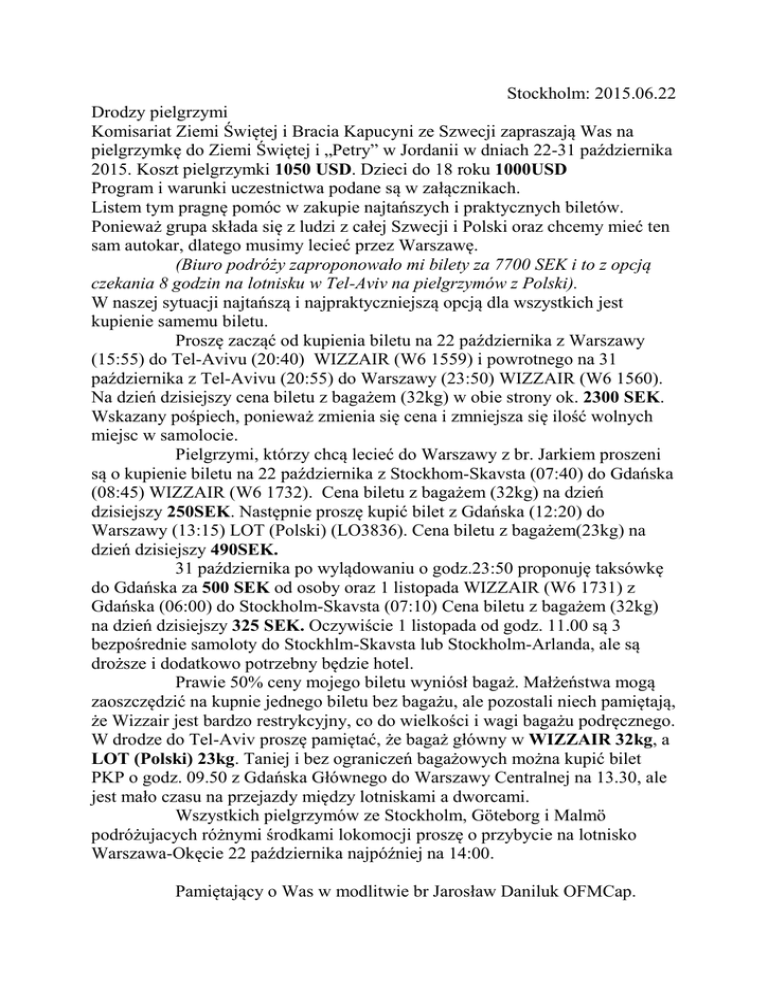 Stockholm: 2015.06.22 Drodzy pielgrzymi Komisariat Ziemi Świętej i Bracia Kapucyni ze Szwecji zapraszają Was na pielgrzymkę do Ziemi Świętej i „Petry” w Jordanii w dniach 22-31 października 2015. Koszt pielgrzymki 1050 USD. Dzieci do 18 roku 1000USD Program i warunki uczestnictwa podane są w załącznikach. Listem tym pragnę pomóc w zakupie najtańszych i praktycznych biletów. Ponieważ grupa składa się z ludzi z całej Szwecji i Polski oraz chcemy mieć ten sam autokar, dlatego musimy lecieć przez Warszawę. (Biuro podróży zaproponowało mi bilety za 7700 SEK i to z opcją czekania 8 godzin na lotnisku w Tel-Aviv na pielgrzymów z Polski). W naszej sytuacji najtańszą i najpraktyczniejszą opcją dla wszystkich jest kupienie samemu biletu. Proszę zacząć od kupienia biletu na 22 października z Warszawy (15:55) do Tel-Avivu (20:40) WIZZAIR (W6 1559) i powrotnego na 31 października z Tel-Avivu (20:55) do Warszawy (23:50) WIZZAIR (W6 1560). Na dzień dzisiejszy cena biletu z bagażem (32kg) w obie strony ok. 2300 SEK. Wskazany pośpiech, ponieważ zmienia się cena i zmniejsza się ilość wolnych miejsc w samolocie. Pielgrzymi, którzy chcą lecieć do Warszawy z br. Jarkiem proszeni są o kupienie biletu na 22 października z Stockhom-Skavsta (07:40) do Gdańska (08:45) WIZZAIR (W6 1732). Cena biletu z bagażem (32kg) na dzień dzisiejszy 250SEK. Następnie proszę kupić bilet z Gdańska (12:20) do Warszawy (13:15) LOT (Polski) (LO3836). Cena biletu z bagażem(23kg) na dzień dzisiejszy 490SEK. 31 października po wylądowaniu o godz.23:50 proponuję taksówkę do Gdańska za 500 SEK od osoby oraz 1 listopada WIZZAIR (W6 1731) z Gdańska (06:00) do Stockholm-Skavsta (07:10) Cena biletu z bagażem (32kg) na dzień dzisiejszy 325 SEK. Oczywiście 1 listopada od godz. 11.00 są 3 bezpośrednie samoloty do Stockhlm-Skavsta lub Stockholm-Arlanda, ale są droższe i dodatkowo potrzebny będzie hotel. Prawie 50% ceny mojego biletu wyniósł bagaż. Małżeństwa mogą zaoszczędzić na kupnie jednego biletu bez bagażu, ale pozostali niech pamiętają, że Wizzair jest bardzo restrykcyjny, co do wielkości i wagi bagażu podręcznego. W drodze do Tel-Aviv proszę pamiętać, że bagaż główny w WIZZAIR 32kg, a LOT (Polski) 23kg. Taniej i bez ograniczeń bagażowych można kupić bilet PKP o godz. 09.50 z Gdańska Głównego do Warszawy Centralnej na 13.30, ale jest mało czasu na przejazdy między lotniskami a dworcami. Wszystkich pielgrzymów ze Stockholm, Göteborg i Malmö podróżujacych różnymi środkami lokomocji proszę o przybycie na lotnisko Warszawa-Okęcie 22 października najpóźniej na 14:00. Pamiętający o Was w modlitwie br Jarosław Daniluk OFMCap.