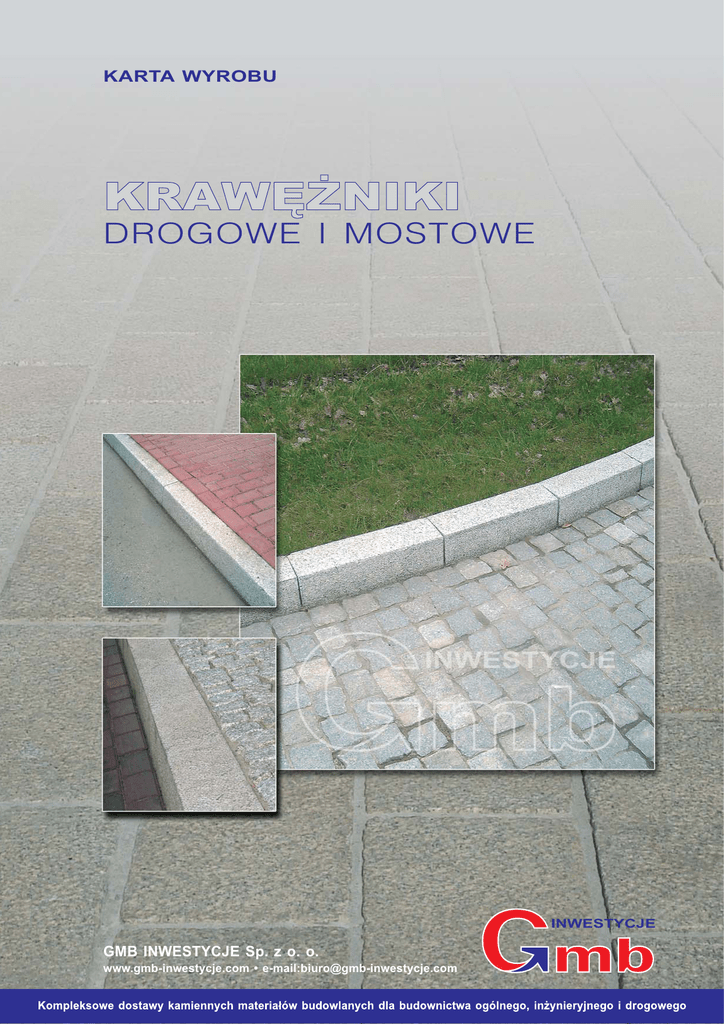 KARTA WYROBU DROGOWE I MOSTOWE INWESTYCJE GMB INWESTYCJE Sp. z o. o. www.gmb-inwestycje.com • e-mail:[email protected] KRAWĘŻNIKI DROGOWE I MOSTOWE Krawężnik drogowy A wg PN-B 11213:1997 i PN-EN 1343 Krawężnik drogowy B b h h 70 50 b l l Tabela wymiarów krawężników drogowych Obróbka powierzchni widocznych: groszkowana piaskowana płomieniowana cięta po pile Rodzaje Wymiary [mm] A B h 220 220 +30 -200 b 110 110 ±5 dla A, ±15 dla B l 400÷1200 400÷1200 - Dopuszczalne odchyłki wymiarów Krawężnik mostowy A Krawężnik mostowy B b b h l 50 h l 70 d 70 50 c Obróbka powierzchni widocznych: groszkowana piaskowana płomieniowana cięta po pile Tabela wymiarów krawężników mostowych Rodzaje Wymiary [mm] Dopuszczalne odchyłki wymiarów A B h 230 180 230 180 ±20 b 200 200 150 150 ±3 c 40 40 - - ±2 d 120 100 120 100 ±2 dla A, ±20 dla B l 800÷2000 - UWAGA: dopuszcza się występowanie zmian strukturalnych charakterystycznych dla granitu, które nie powodują osłabienia materiału. Produkty granitowe dostarczane przez firmę GMB Inwestycje Sp. z o.o. posiadają aprobatę dopuszczającą do użycia w budownictwie określoną w Orzeczeniu o Jakości Surowca