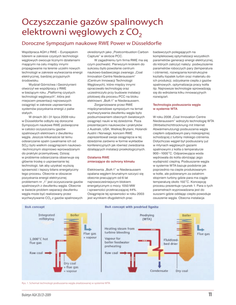Oczyszczanie gazów spalinowych elektrowni węglowych z CO2 Doroczne Sympozjum naukowe RWE Power w Düsseldorfie Współpraca AGH z RWE – Europejskim liderem w zakresie czystych technologii węglowych owocuje licznymi działaniami mającymi na celu między innymi propagowanie na terenie uczelni nowych technologii w zakresie wytwarzania energii elektrycznej, bardziej przyjaznych środowisku. Wydział Górnictwa i Geoinżynierii otworzył we współpracy z RWE w bieżącym roku „Platformę czystych technologii węglowych”, która jest miejscem prezentacji najnowszych osiągnięć w zakresie usprawniania systemów pozyskania energii z paliw stałych. W dniach 30 i 31 lipca 2009 roku w Düsseldorfie odbyło się doroczne Sympozjum naukowe RWE poświęcone w całości oczyszczaniu gazów spalinowych elektrowni z dwutlenku węgla. Jeszcze kilkanaście lat temu odsiarczanie spalin (uwalnianie ich od SO2) było wielkim osiągnięciem naukowo-technicznym stopniowo wprowadzanym do praktyki przemysłowej. Dzisiaj w problemie odsiarczania obserwuje się głównie troskę o usprawnianie tej technologii, tak aby uzyskać wyższą sprawność i lepszy bilans energetyczny tego procesu. Obecnie w obszarze pozyskania energii elektrycznej problemem nr „1” jest oczyszczanie gazów spalinowych z dwutlenku węgla. Obecnie w świecie problem separacji dwutlenku węgla może być realizowany przez wychwytywanie CO2 z gazów spalinowych określonych jako „Postcombustion Carbon Capture” w skrócie PCC. W zagadnieniu tym firma RWE ma się czym pochwalić. Pierwszym krokiem do sukcesu było powołanie centrum naukowo-badawczego zwanego „Coal Innovation Centre Niederaussem” (Centrum Innowacji Technologii Węglowych), które między innymi opracowało technologię oraz uczestniczyło przy budowie instalacji pilotowej dla procesu PCC na bloku elektrowni „BoA-1” w Niederaussem. Zorganizowane przez RWE międzynarodowe sympozjum na temat wychwytywania dwutlenku węgla było podsumowaniem obecnych światowych osiągnięć nauki w tej dziedzinie. Poza prezentacjami naukowców i praktyków z Australii, USA, Wielkiej Brytanii, Holandii Austrii i Norwegii, koncern RWE zaprezentował swoje osiągnięcia w tej dziedzinie zarówno w formie wykładów konferencyjnych jak również zwiedzania działających instalacji proekologicznych. Działania RWE zmierzające do ochrony klimatu Elektrownia „BoA-1” w Niederaussem opalana węglem brunatnym szczyci się obecnie pracującym od 6 lat najnowocześniejszym blokiem energetycznym o mocy 1050 MW i sprawności przekraczającej 44 %. Osiągnięcie tej sprawności w roku 2003 jest wynikiem długoletnich prac badawczych polegających na kompleksowej optymalizacji wszystkich parametrów generacji energii elektrycznej, do których zaliczyć należy: podwyższenie parametrów roboczych pary (temperatura i ciśnienie), rozwiązania konstrukcyjne kształtu łopatek turbin oraz materiału do ich produkcji, odzyskanie ciepła z gazów spalinowych, optymalizacja pracy kotła itp. Najnowsze technologie sprowadzają się do wdrożenia kilku innowacyjnych rozwiązań. Technologia podsuszania węgla w systemie WTA W roku 2008 „Coal Innovation Centre Niederaussem” wdrożyło technologię WTA (Wirbelschichttrocknung mit Internet Abwärmenutzung) podsuszania węgla ciepłem odpadowym pary niskoprężnej schodzącej z turbiny niskiego ciśnienia. Dotychczas węgiel był podsuszany już w młynach węglowych gazami spalinowymi z kotła o temperaturze 900÷1000 ˚C. Odparowująca woda wędrowała do kotła obniżając jego wydajność cieplną. Podsuszanie węgla w systemie WTA bazuje podobnie jak poprzednio na cieple produkowanym w kotle, ale pobieranym za ostatnim stopniem turbiny gdzie para ma ciągle temperaturę około 150 ˚C. Koncepcję procesu prezentuje rysunek 1. Para o tych parametrach wyprowadzana jest do suszarni gdzie oddając ciepło powoduje osuszenie węgla. Obecna instalacja Rys. 1. Schemat technologii podsuszania węgla zrealizowanej w systemie WTA Biuletyn AGH 20 / 21-2009 11 fot. arch. autora Rys. 2. Widok instalacja WTA w Elektrowni „BoA-1” Niederaussem widoczna na rysunku 2 jest w stanie osuszyć w ciągu godziny około 210 ton węgla zawodnionego z wilgotności powyżej 50 % do wilgotności około 12 % , produkując około 100 ton pary wodnej. Koszt budowy tego segmentu suszarni oszacowano na 50 mln Euro. Wydajność instalacji jest na tyle duża, że obecnie 30 % węgla dla kotła „BoA-1” może być podsuszana w tej technologii. System nie korzysta z dużych ilości energii zewnętrznej. Ciepło suszenia pozyskiwane jest w całości z energii pary zrzucanej do systemu chłodzenia. Pewna ilość energii jest oczywiście potrzebna do transportu olbrzymich mas węgla napędzania wentylatorów. Uwzględniając jednak to zużycie energii wynikowo po doprowadzeniu do suszenia całego węgla wsadowego do kotła „BoA-1” jego sprawność wzrośnie o 4 %, czyli omawiany blok osiągnie sprawność rzędu 48 %. Suszarnia Niederaussem jest obecnie największą instalacją tego typu funkcjonującą w świecie. Jest więc zrozumiałe, że propozycja RWE wzbudziła duże zainteresowanie w gronie wytwórców energii na całym globie w tym również w Polsce, a w szczególności w jednej ze spółek energetycznych operujących na węglu brunatnym. Nowa generacja systemu odsiarczania spalin w elektrowni Niederaussem Podobnie znaczącym osiągnięciem technicznym RWE jest wdrożenie instalacji odsiarczania najnowszej generacji zwanej REA Plus. System został opracowany 12 i zbudowany we współpracy z austriacką firmą „Austrian Energy & Environment (AE&E). System ten charakteryzuje się odmiennym od powszechnie stosowanych systemów odsiarczania sposobem oddziaływania roztworu tlenku wapnia na strumień gazów spalinowych zawierających SO2. Idea procesu wdrożonego w RWE – Niederaussem sprowadza się w uproszczeniu do sprowadzenia gazów spalinowych z ko