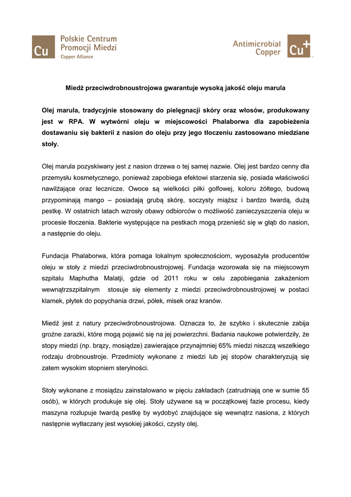 Miedź przeciwdrobnoustrojowa gwarantuje wysoką jakość oleju marula Olej marula, tradycyjnie stosowany do pielęgnacji skóry oraz włosów, produkowany jest w RPA. W wytwórni oleju w miejscowości Phalaborwa dla zapobieżenia dostawaniu się bakterii z nasion do oleju przy jego tłoczeniu zastosowano miedziane stoły. Olej marula pozyskiwany jest z nasion drzewa o tej samej nazwie. Olej jest bardzo cenny dla przemysłu kosmetycznego, ponieważ zapobiega efektowi starzenia się, posiada właściwości nawilżające oraz lecznicze. Owoce są wielkości piłki golfowej, koloru żółtego, budową przypominają mango – posiadają grubą skórę, soczysty miąższ i bardzo twardą, dużą pestkę. W ostatnich latach wzrosły obawy odbiorców o możliwość zanieczyszczenia oleju w procesie tłoczenia. Bakterie występujące na pestkach mogą przenieść się w głąb do nasion, a następnie do oleju. Fundacja Phalaborwa, która pomaga lokalnym społecznościom, wyposażyła producentów oleju w stoły z miedzi przeciwdrobnoustrojowej. Fundacja wzorowała się na miejscowym szpitalu Maphutha Malatji, gdzie od 2011 roku w celu zapobiegania zakażeniom wewnątrzszpitalnym stosuje się elementy z miedzi przeciwdrobnoustrojowej w postaci klamek, płytek do popychania drzwi, półek, misek oraz kranów. Miedź jest z natury przeciwdrobnoustrojowa. Oznacza to, że szybko i skutecznie zabija groźne zarazki, które mogą pojawić się na jej powierzchni. Badania naukowe potwierdziły, że stopy miedzi (np. brązy, mosiądze) zawierające przynajmniej 65% miedzi niszczą wszelkiego rodzaju drobnoustroje. Przedmioty wykonane z miedzi lub jej stopów charakteryzują się zatem wysokim stopniem sterylności. Stoły wykonane z mosiądzu zainstalowano w pięciu zakładach (zatrudniają one w sumie 55 osób), w których produkuje się olej. Stoły używane są w początkowej fazie procesu, kiedy maszyna rozłupuje twardą pestkę by wydobyć znajdujące się wewnątrz nasiona, z których następnie wytłaczany jest wysokiej jakości, czysty olej. Stoły z miedzi przeciwdrobnoustrojowej z urządzeniami do otwierania pestek owocu marula Informacja dodatkowe: Polskie Centrum Promocji Miedzi (PCPM) www.pcpm.pl jest częścią Europejskiego Instytutu Miedzi (European Copper Institute ECI) z siedzibą w Brukseli. PCPM jest organizacją powołaną przez producentów miedzi i jej przetwórców do działań na rzecz zwiększania jej zastosowań w gospodarce zarówno naszego kraju jak i krajach Europy Środkowej. Jego działalność koordynowana jest oraz współfinansowana przez Międzynarodowe Stowarzyszenie na Rzecz Miedzi (International Copper Association ICA) z siedzibą w Nowym Jorku. PCPM powstało i działa, by tworzyć warunki na rynku dla zwiększenia konsumpcji na produkty z miedzi i jej stopów. Stawia sobie za cel wszechstronne przedstawienie korzyści wynikających z zastosowania miedzi, pragnie, by stała się ona materiałem uznanym i pożądanym w dziedzinach takich jak: energetyka, telekomunikacja, budownictwo, architektura, ochrona środowiska, czy też zdrowie człowieka. European Copper Institute (ECI) www.eurocopper.org jest organizacją zrzeszającą światowe przedsiębiorstwa górnicze i hutnicze (reprezentowane przez International Copper Association, Ltd) oraz europejski przemysł przetwórczy miedzi. Jego misją jest promowanie korzyści płynących ze stosowania miedzi w nowoczesnym społeczeństwie. ECI działa w oparciu o Centralę w Brukseli oraz sieć 11 Centrów Promocji Miedzi w całej Europie, której częścią jest PCPM. Osoby kontaktowe: Michał Ramczykowski [email protected] Piotr Jurasz [email protected]