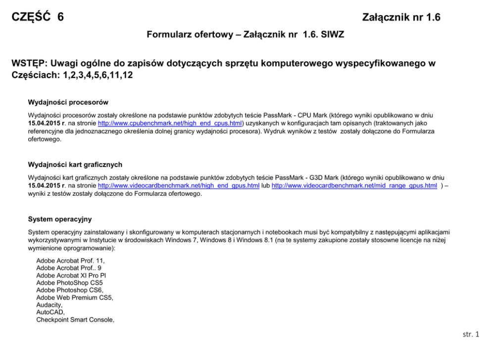 CZĘŚĆ 6 Załącznik nr 1.6 Formularz ofertowy – Załącznik nr 1.6. SIWZ WSTĘP: Uwagi ogólne do zapisów dotyczących sprzętu komputerowego wyspecyfikowanego w Częściach: 1,2,3,4,5,6,11,12 Wydajności procesorów Wydajności procesorów zostały określone na podstawie punktów zdobytych teście PassMark - CPU Mark (którego wyniki opublikowano w dniu 15.04.2015 r. na stronie http://www.cpubenchmark.net/high_end_cpus.html) uzyskanych w konfiguracjach tam opisanych (traktowanych jako referencyjne dla jednoznacznego określenia dolnej granicy wydajności procesora). Wydruk wyników z testów zostały dołączone do Formularza ofertowego. Wydajności kart graficznych Wydajności kart graficznych zostały określone na podstawie punktów zdobytych teście PassMark - G3D Mark (którego wyniki opublikowano w dniu 15.04.2015 r. na stronie http://www.videocardbenchmark.net/high_end_gpus.html lub http://www.videocardbenchmark.net/mid_range_gpus.html ) – wyniki z testów zostały dołączone do Formularza ofertowego. System operacyjny System operacyjny zainstalowany i skonfigurowany w komputerach stacjonarnych i notebookach musi być kompatybilny z następującymi aplikacjami wykorzystywanymi w Instytucie w środowiskach Windows 7, Windows 8 i Windows 8.1 (na te systemy zakupione zostały stosowne licencje na niżej wymienione oprogramowanie): Adobe Acrobat Prof. 11, Adobe Acrobat Prof.. 9 Adobe Acrobat XI Pro Pl Adobe PhotoShop CS5 Adobe Photoshop CS6, Adobe Web Premium CS5, Audacity, AutoCAD, Checkpoint Smart Console, str. 1 Corel Designer Technical Suite 12 CorelDraw 11, CorelDraw Graphics Suite 12, CorelDraw Graphics Suite X5, CorelDraw X3, CorelDraw X4 Graphics Suite, CorelDraw, CST Studio Suite, Delphi RAD Studio, DXO Optics PTO, EMG Works 4.05 (do aparatu Bagnoli-16 PDsEMG), English Translator TX2 Synergy, InDesign Cs 5.5, IntelliJ IDEA 14, Mathlab MS Office 2010, MS Office 2013, MS Visio 10 ODEON Room Acoustics Software, Office Visio Professional 2007 Oprogramowanie CAD (projektowanie i symulacje 3D), np.. SolidWorks, Solid Works Simulation do skanera 3D oprogramowanie dedykowane do badań palestezjometrycznych oprogramowanie dedykowane do pomiaru sił Oracle Fusion Middleware 11.1.2.4.0, Photoshop CS 6, PhotoShop CSS Extended v. 12.0.4 x64, PhotoShop, Pinnacle Studio HD ultimate, Play Memories Home 4.1 (Sony) PLSQL Developer, Pulse Data Recorder, PULSE LabShop, Pulse Reflex, SEMCAD x, Simple ERP, SPSS Statistics Statistica Statistica 8.0, Statistica 10.0 MR1, UltraEdit str. 2 Wysokowydajne komputery przenośne laboratoryjne (łącznie 6 szt.) SZCZEGÓŁOWA SPECYFIKACJA TECHNICZNA 6.1. Komputer przenośny prezentacyjny, ekonomiczny o bardzo małej masie z przekątną ekranu 13” – szt. 1 KOMPUTER TYP-N4 PRZENOŚNY Komputer przenośny prezentacyjny o małej masie, ekonomiczny N4 Minimalne parametry wymagane Gwarancja min. 12 miesięcy Warunki serwisu gwarancyjnego: TYP oferowany: ……………………………………. Producent: …………………………………………. Faktyczne parametry oferowanych urządzeń (nie gorsze, niż wymagane) W serwisie zewnętrznym Pełna sprawność sprzętu zostanie przywrócona w czasie nie dłuższym, niż 14 dni od otrzymania formalnego zawiadomienia o awarii sprzętu Zapewniona przez producenta sprzętu możliwość wykupienia standardowej gwarancji rozszerzonej do 36 miesięcy z czasem naprawy w siedzibie użytkownika w następnym dniu roboczym (potwierdzeniem ww. możliwości jest wydruk informacji o takim produkcie ze strony internetowej producenta sprzętu) Firma serwisująca musi posiadać ISO 9001:2000 na świadczenie usług serwisowych oraz posiadać autoryzacje producenta komputera – dokumenty potwierdzające załączyć do oferty. System operacyjny Zainstalowany i skonfigurowany system operacyjny 64-bitowy z interfejsem graficznym w języku polskim + (nośnik lub dostępna funkcjonalność wykonania kopii instalacyjnej systemu operacyjnego na nośniku zewnętrznym) str. 3 pełny pakiet instalacyjny na nośnikach stałych (system operacyjny z licencją, drivery do wszystkich podzespołów zainstalowanych w notebooku) dostarczony przez producenta notebooka System operacyjny musi być w pełni kompatybilny z oprogramowaniem posiadanym przez Zamawiającego wymienionym we WSTĘPie do niniejszego Załącznika. tzn. musi umożliwiać bezproblemowe zainstalowanie, skonfigurowanie i użytkowanie ww. oprogramowania w jego pełnej funkcjonalności z wykorzystaniem oryginalnych bibliotek i sterowników, bez użycia jakichkolwiek programów dodatkowych, np. emulatorów lub nakładek. Procesor Jeden procesor (wymagana 1 szt.) wielordzeniowy klasy x86, zaprojektowany do pracy w komputerach przenośnych, o wydajności ocenionej na co najmniej 3,547 punktów zdobytych teście PassMark – CPU Mark. Wydajność procesora została określona na podstawie punktów zdobytych teście PassMark - CPU Mark (którego wyniki opublikowano w dniu 15.04.2015 r. na stronie http://www.cpubenchmark.net/high_end_cpus.html) uzyskanych w konfiguracjach tam opisanych (traktowanych jako referencyjne dla jednoznacznego określenia dolnej granicy wydajności procesora). Wydruk wyników testów dostępnych procesorów opublikowany w dniu 15.04.2015 r. na ww. stronie został dołączony do Formularza ofertowego. Typ / producent procesora: ………………………………………….. Maksymalny pobór mocy procesora musi być nie większy, niż 15 W Wydajność powyższego procesora w oferowanym komputerze przenośnym, zmierzona poprzez wykonanie na niej ww. testu powinna być nie mniejsza od wydajności konfiguracji referencyjnej z tym procesorem. Zamawiający zastrzega sobie, iż w celu sprawdzenia poprawności przeprowadzenia testów Wykonawca może zostać poproszony o dostarczenie Zamawiającemu oprogramowania testującego oraz dokładnego opisu wykonanych testów wraz z ich wynikami w celu ich sprawdzenia w terminie nie dłuższym niż 3 dni od 