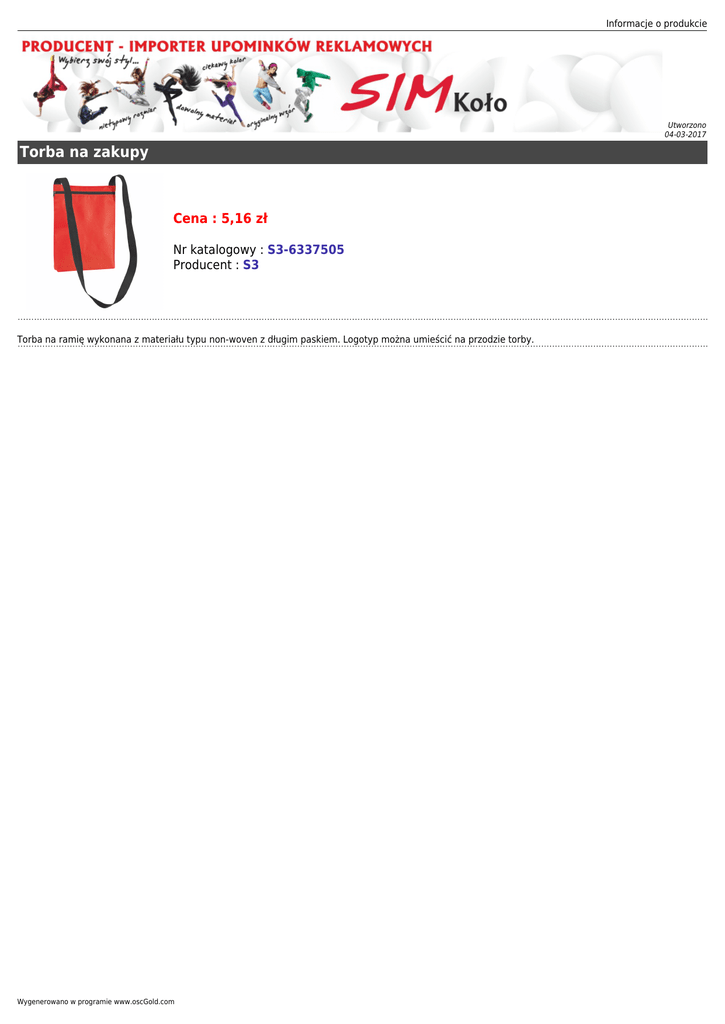 Informacje o produkcie Utworzono 04-03-2017 Torba na zakupy Cena : 5,16 zł Nr katalogowy : S3-6337505 Producent : S3 Torba na ramię wykonana z materiału typu non-woven z długim paskiem. Logotyp można umieścić na przodzie torby. Wygenerowano w programie www.oscGold.com