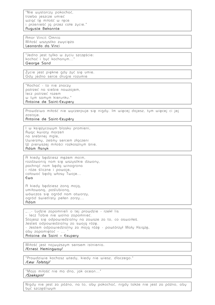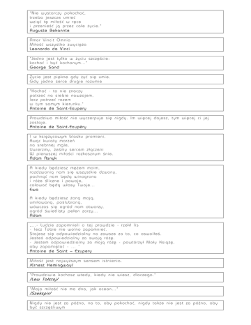 "Nie wy starczy pokocha ć , trz eb a je szc ze um ie ć w zi ąć tę miło ść w rę ce i przenieś ć j ą p r ze z ca ł e życie." A u g u s t e B ek an n te A mo r V in ci t O mni a M i ło ść ws zys tko zwy c ię ża L e on a rd o da V in c i "Je dno je st ty lk o w życiu szczę śc ie : k och ać i być kochanym..." G e o rg e S an d Życie jest piękn e gdy żyć s ię umie. G dy je dno se rce d rugie rozu mie "Koch ać - to n ie zna czy p a t rz eć n a s i eb ie na wz a jem , lecz patrzeć ra zem w tym samym kierun ku ." A n to i n e d e S a in t -E xu pe r y P raw dz iw a m i ło ść nie wy cz erpu je s ię n i gdy . Im w ię ce j d a je sz , tym w ięc e j c i je j z os t a je . A n to i n e d e S a in t -E xu pé r y I w k s ięży co wym blasku p rom ien i, R wą c k wi a ty m a rz eń na srebrnej mgle, U w i e rzm y , ż eś my sercem z ł ąc zen i W pierwszej miło śc i r oz ko szny m śn ie . Adam Asny k A k i edy będ z ie sz m ę że m m oi m , ro zd zwon i ą n am s ię w s zys t k ie dzw on y , p achn ąć nam bę dą w in o g ron a i ró że ś lic zne i p ow oje , c a łow ać b ęd ą w łosy Tw oje ... Ewa A k i edy będ z ie sz ż oną m o ją , u m iłow aną , po ś lub ion ą , w ówc za s się o g ró d n am o tw o r zy , o g ró d św ietlis ty pe łen zorzy... A d am „...- Ludzie zapomnieli o te j prawdzie - rz ek ł lis - l ec z T ob ie n ie w o lno z ap om n ieć . S t a je sz s ię od pow ied zia lny n a zaw sz e z a to, co os wo iłe ś . Jeste ś od po wied z ia lny za sw o ją ró żę . - Jes t em od po wied z ialny za mo ją ró żę - powtórzy ł Ma ły K si ąż ę , a by za pam ię t ać - . .. ” A n to i n e d e S a in t – E xu pe r y M i ło ść je st n a jwyż szym sen se m is tn ienia . /E rn e s t Hem in gw ay / "P raw dz iw ie k och as z w te dy , kiedy n ie wies z , dlac ze go ." /Lew Tołstoj/ "Moja mi łoś ć n i e m a dn a , ja k oce an . .." /Szekspir/ N i gdy nie je s t za pó źno, na to, aby pokocha ć , n ig dy ta kż e n i e jes t z a p óźno, aby by ć sz cz ęś liwym /P. Bosmans/ " M i ło ść je st n ie po j ę ta d la ty ch , c o j ej n ie d z ie lą." /François Rene de Chateaubriand/ K r op l a M i łoś c i zna czy w ię ce j ni ż o ce an r ozum u Blaise Pascal T am , gd z ie j es t w i e lka m iło ść , za ws ze zd a rz a ją s ię cud a . Willa Cath er T rze ba by ć t ro c hę p od obny m, by s ię r o z u m ieć , n ie co r óżnym, by się ko cha ć P . G e ra l dy M i ło ść ma ł żeń sk a n i e je s t pros tym do dan iem dw óch ró żn y c h m iłoś c i : m iło śc i m ęż a i ż ony , ale je s t je dn ą m i ło śc i ą, k tó rą żyj ą dw ie o so by , i k tó r a s pr aw i a , ż e sta j ą s i ę jednym ciałe m, a l e nad e w szy s tko je dnym se rcem i je dn ą du sz ą k a r d . M a r ty M i ło ść powi ę ks za i upi ę ks za rze czy , d aje im od de ch n ie p rz em i ja lno śc i P . B e rto lo ly K och ać k ogo ś - zn ac zy w i dz ieć w n im cu da dla innych n iedostrzegaln e F . Mau r i a c M i ło ść p ozw ala w i dz ie ć t o, c ze go in n i n ie w id zą M. Quoist M i ło ść to m or ze , k tó re go w y b r zeż em j es t ko b ie t a W. Hu go P rzy j aźń pozn a ją p o tym , że nic nie mo że j e j zaw i eś ć ; a p raw dz iw ą m i łoś ć p o tym , ż e n i c n ie m oż e je j znis zc zyć A . de Sa int-E xu pe ry M i ło ść je st n a jwyż szy m sen se m is tn i en i a . Ko cha s ię n ie z a co ko lw ie k , ale po mimo w szy stko . K och a s ię z a n i c k s . J an Twa r d ow s k i M i ło ść je st jak wiec zno ść b ez p rze d tem i p ot em k s . J an Twa r d ow s k i M i ło ść p r aw dz iw a s k ła da s ię z rz ec zy n ies koń cz en ie wie l kich i zara zem n ie sk ończen ie ma ły ch V . Hu go M i ło ść je st czym ś n a jm ocn ie j szym n a św ie cie , a jedn ak n ie mo żn a w y o b ra z ić s ob i e n ic b ar dz i e j sk r om n e go M ah a tm a G an dh i N a jp i ękn ie js zym sk a rbe m je s t m i ło ść s e rc M i ło ść je st n a jwyż szym sen se m is tn ienia E . H em in gwa y Ty lko m ił ość potrafi zatrzyma ć cza s M a r ce l P r ou s t K och ać to z es t a rz eć si ę razem Albert Camus M i ło ść je st w szy s tk im co i s tn ie je. T o w szy s tko c o o n ie j w i emy . E m i l y D ic k in s o n