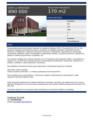 DOM na SPRZEDAŻ 890 000 Nowy Dwór Mazowiecki 170 m2 59/4150/ODS Secondary 350 170 2010 1 5 VeryGood ExternalSegment Opis Do sprzedania piętrowy skrajny segment w inwestycji Dębowy Parki I. Powierzchnia 170 m2. Na parterze znajduje się przestronny salon z wyjściem na zadbany ogródek, zamknięta kuchnia, łazienka i przedsionek z wejściem do garażu. Kuchnia w zabudowie, wyposażona w sprzęt agd (zmywarka, lodówka), stolik z krzesełkami, podstawowe sprzęty i naczynia kuchenne. Łazienka na paterze z kabiną prysznicową, umywalką i wc. Na I piętrze znajdują się 4 pokoje, łazienka i hol. W pokojach zamontowano szafki z umywalkami, z uwagi na to, że dom był przystosowywany do prowadzenia działalności medycznej. Łazienka na I piętrze, z bidetem, miską sedesową i umywalką. Na podłodze w pomieszczeniach gres polerowany. W łazienkach glazura i terakota. Wszystkie media miejskie. Garaż na jeden samochód + 2 miejsca postojowe przed budynkiem. Dom znajduje się na zamkniętym, chronionym osiedlu mieszkaniowym stanowiącym I etap realizacji inwestycji Dębowy Park. Jeżeli powyższe ogłoszenie nie spełnia Państwa oczekiwań, zachęcam do zapoznania się z innymi ofertami dostępnymi na stronie www.ikrealestate.pl lub kontaktu telefonicznego pod numerem 537 855 755. Powyższe ogłoszenie nie stanowi oferty handlowej w rozumieniu Kodeksu Cywilnego. Izabela Kurek tel. 537855755 email: [email protected] I.K. Real Estate Powered by TCPDF (www.tcpdf.org)