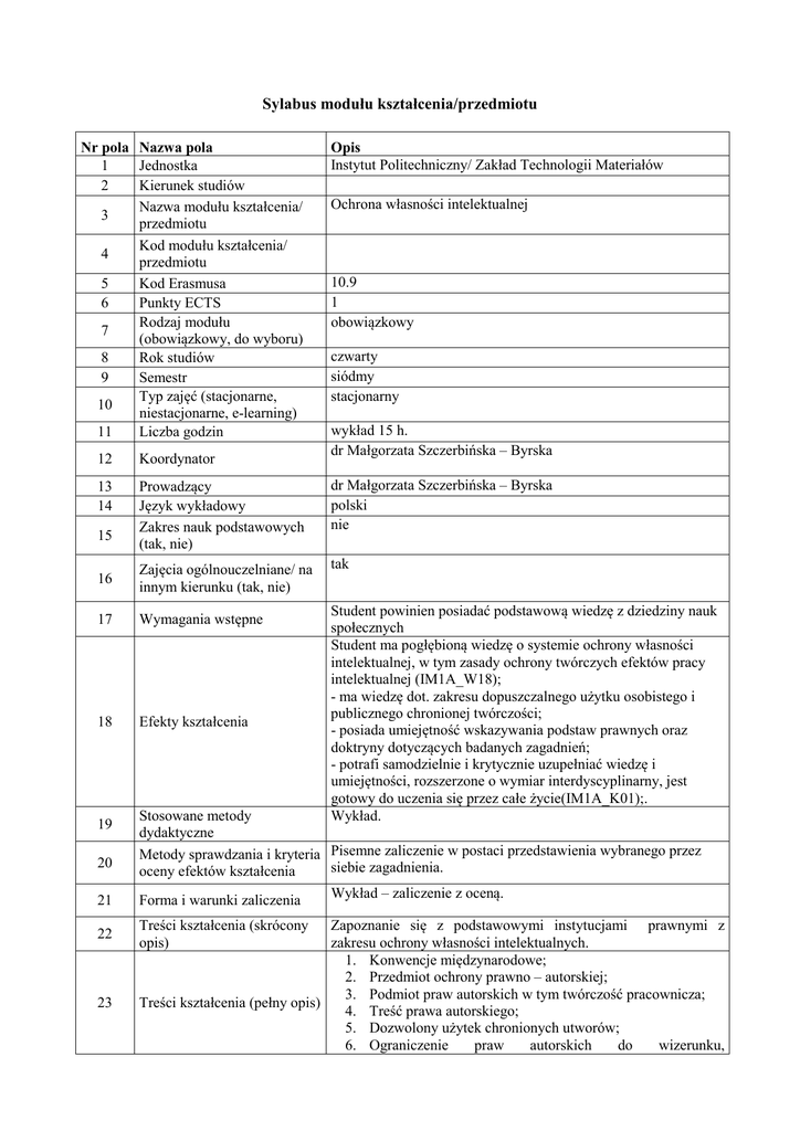 Sylabus modułu kształcenia/przedmiotu Nr pola Nazwa pola 1 Jednostka 2 Kierunek studiów Nazwa modułu kształcenia/ 3 przedmiotu Kod modułu kształcenia/ 4 przedmiotu 5 Kod Erasmusa 6 Punkty ECTS Rodzaj modułu 7 (obowiązkowy, do wyboru) 8 Rok studiów 9 Semestr Typ zajęć (stacjonarne, 10 niestacjonarne, e-learning) 11 Liczba godzin Opis Instytut Politechniczny/ Zakład Technologii Materiałów Ochrona własności intelektualnej 10.9 1 obowiązkowy czwarty siódmy stacjonarny wykład 15 h. dr Małgorzata Szczerbińska – Byrska 12 Koordynator 13 14 Prowadzący Język wykładowy Zakres nauk podstawowych (tak, nie) dr Małgorzata Szczerbińska – Byrska polski nie Zajęcia ogólnouczelniane/ na innym kierunku (tak, nie) tak 16 17 Wymagania wstępne 18 Efekty kształcenia 15 19 20 21 22 23 Student powinien posiadać podstawową wiedzę z dziedziny nauk społecznych Student ma pogłębioną wiedzę o systemie ochrony własności intelektualnej, w tym zasady ochrony twórczych efektów pracy intelektualnej (IM1A_W18); - ma wiedzę dot. zakresu dopuszczalnego użytku osobistego i publicznego chronionej twórczości; - posiada umiejętność wskazywania podstaw prawnych oraz doktryny dotyczących badanych zagadnień; - potrafi samodzielnie i krytycznie uzupełniać wiedzę i umiejętności, rozszerzone o wymiar interdyscyplinarny, jest gotowy do uczenia się przez całe życie(IM1A_K01);. Wykład. Stosowane metody dydaktyczne Metody sprawdzania i kryteria Pisemne zaliczenie w postaci przedstawienia wybranego przez siebie zagadnienia. oceny efektów kształcenia Wykład – zaliczenie z oceną. Forma i warunki zaliczenia Treści kształcenia (skrócony opis) Zapoznanie się z podstawowymi instytucjami prawnymi z zakresu ochrony własności intelektualnych. 1. Konwencje międzynarodowe; 2. Przedmiot ochrony prawno – autorskiej; 3. Podmiot praw autorskich w tym twórczość pracownicza; Treści kształcenia (pełny opis) 4. Treść prawa autorskiego; 5. Dozwolony użytek chronionych utworów; 6. Ograniczenie praw autorskich do wizerunku, korespondencji i źródeł informacji; Wykonywanie autorskich praw majątkowych; Ochrona praw autorskich: majątkowych/ osobistych; Ochrona programów komputerowych; Ochrona prawna baz danych; Ochrona baz danych osobowych w systemie prawa; Wynalazki, wzory użytkowe, wzory przemysłowe oraz topografie układów scalonych; 13. Oznaczenia odróżniające: znaki towarowe oraz oznaczenia geograficzne; 14. Prawne aspekty podpisu elektronicznego; 15. Prawo własności intelektualnej w dobie Internetu. „Prawo własności intelektualnej dla ekonomistów” pod red. B. Gnela, Warszawa 2014. 7. 8. 9. 10. 11. 12. 24 Literatura podstawowa i uzupełniająca 25 Przyporządkowanie modułu kształcenia/przedmiotu do obszaru/ obszarów kształcenia 26 27 28 Sposób określenia liczby punktów ECTS Liczba punktów ECTS – zajęcia wymagające bezpośredniego udziału nauczyciela akademickiego Liczba punktów ECTS – zajęcia o charakterze praktycznym Uzupełniająco: Ustawa z 04.02.1994 r. o prawie autorskim i prawach pokrewnych; Ustawa z 30.06.2000 r. Prawo własności przemysłowej; Ustawa z 27.07.2001 r. o ochronie baz danych. Obszar nauk technicznych 0,7 pkt ECTS - wykład 15 h - konsultacje 5 h 0,3 pkt ECTS (praca własna) - przygotowanie się do zajęć i zaliczenia 10 h Łączny nakład pracy studenta: 30 h 0,7 (20 h) -