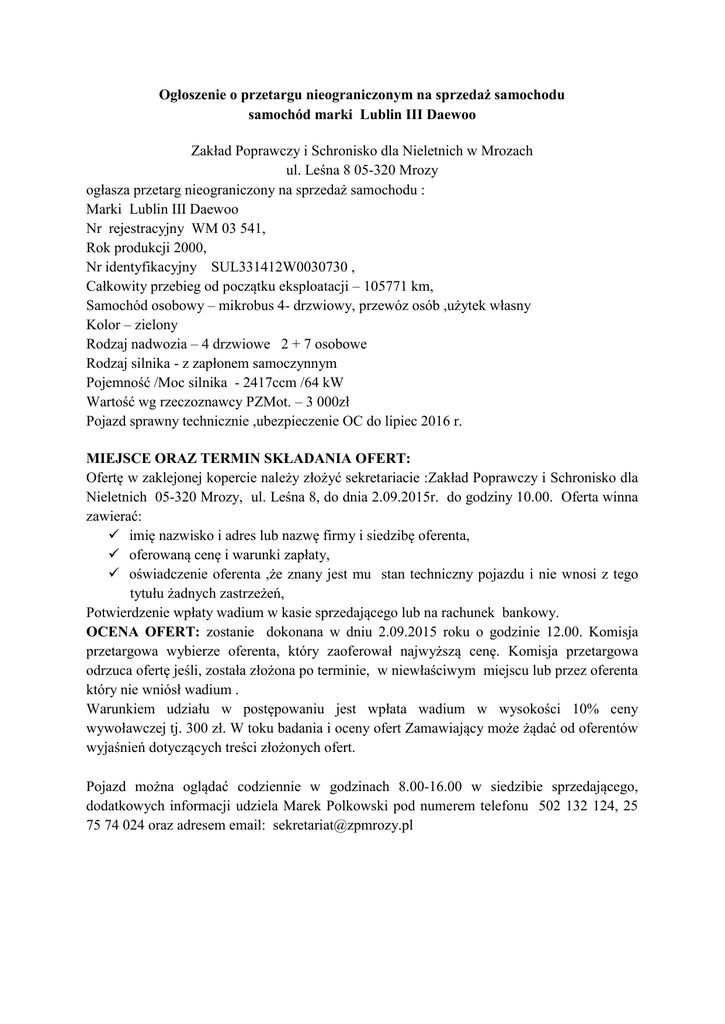 Ogłoszenie o przetargu nieograniczonym na sprzedaż samochodu samochód marki Lublin III Daewoo Zakład Poprawczy i Schronisko dla Nieletnich w Mrozach ul. Leśna 8 05-320 Mrozy ogłasza przetarg nieograniczony na sprzedaż samochodu : Marki Lublin III Daewoo Nr rejestracyjny WM 03 541, Rok produkcji 2000, Nr identyfikacyjny SUL331412W0030730 , Całkowity przebieg od początku eksploatacji – 105771 km, Samochód osobowy – mikrobus 4- drzwiowy, przewóz osób ,użytek własny Kolor – zielony Rodzaj nadwozia – 4 drzwiowe 2 + 7 osobowe Rodzaj silnika - z zapłonem samoczynnym Pojemność /Moc silnika - 2417ccm /64 kW Wartość wg rzeczoznawcy PZMot. – 3 000zł Pojazd sprawny technicznie ,ubezpieczenie OC do lipiec 2016 r. MIEJSCE ORAZ TERMIN SKŁADANIA OFERT: Ofertę w zaklejonej kopercie należy złożyć sekretariacie :Zakład Poprawczy i Schronisko dla Nieletnich 05-320 Mrozy, ul. Leśna 8, do dnia 2.09.2015r. do godziny 10.00. Oferta winna zawierać: imię nazwisko i adres lub nazwę firmy i siedzibę oferenta, oferowaną cenę i warunki zapłaty, oświadczenie oferenta ,że znany jest mu stan techniczny pojazdu i nie wnosi z tego tytułu żadnych zastrzeżeń, Potwierdzenie wpłaty wadium w kasie sprzedającego lub na rachunek bankowy. OCENA OFERT: zostanie dokonana w dniu 2.09.2015 roku o godzinie 12.00. Komisja przetargowa wybierze oferenta, który zaoferował najwyższą cenę. Komisja przetargowa odrzuca ofertę jeśli, została złożona po terminie, w niewłaściwym miejscu lub przez oferenta który nie wniósł wadium . Warunkiem udziału w postępowaniu jest wpłata wadium w wysokości 10% ceny wywoławczej tj. 300 zł. W toku badania i oceny ofert Zamawiający może żądać od oferentów wyjaśnień dotyczących treści złożonych ofert. Pojazd można oglądać codziennie w godzinach 8.00-16.00 w siedzibie sprzedającego, dodatkowych informacji udziela Marek Polkowski pod numerem telefonu 502 132 124, 25 75 74 024 oraz adresem email: [email protected]