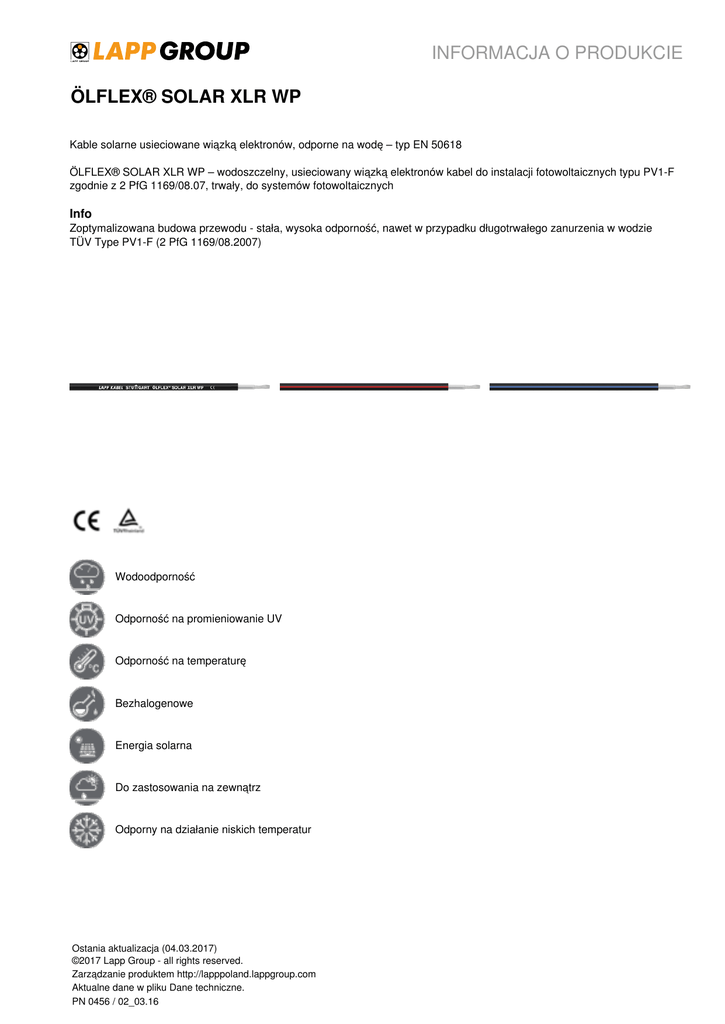 INFORMACJA O PRODUKCIE ÖLFLEX® SOLAR XLR WP Kable solarne usieciowane wiązką elektronów, odporne na wodę – typ EN 50618 ÖLFLEX® SOLAR XLR WP – wodoszczelny, usieciowany wiązką elektronów kabel do instalacji fotowoltaicznych typu PV1-F zgodnie z 2 PfG 1169/08.07, trwały, do systemów fotowoltaicznych Info Zoptymalizowana budowa przewodu - stała, wysoka odporność, nawet w przypadku długotrwałego zanurzenia w wodzie TÜV Type PV1-F (2 PfG 1169/08.2007) Wodoodporność Odporność na promieniowanie UV Odporność na temperaturę Bezhalogenowe Energia solarna Do zastosowania na zewnątrz Odporny na działanie niskich temperatur Ostania aktualizacja (04.03.2017) ©2017 Lapp Group - all rights reserved. Zarządzanie produktem http://lapppoland.lappgroup.com Aktualne dane w pliku Dane techniczne. PN 0456 / 02_03.16 INFORMACJA O PRODUKCIE ÖLFLEX® SOLAR XLR WP Korzyści Alternatywa w przypadku długotrwałego zastosowania w wodzie np. w przypadku zagrożenia powodzią lub zakopania w ziemi w peszlach Redukcja rozprzestrzeniania płomieni oraz powstawania toksycznych gazów podczas pożaru Wytrzymały na zagrożenia mechaniczne Wytłaczany pasek kolorowy służy jako zabezpieczenie przed odwrotną polaryzacją podczas montażu Dokładna kontrola ilości podczas montażu, metrażowanie na płaszczu zewnętrznym Zakres zastosowania Dla instalacji podziemnych w peszlach, wszędzie tam, gdzie może gromadzić się woda oraz wilgoć Do okablowania między modułami słonecznymi lub jako przedłużacz pomiędzy poszczególnymi ciągami modułów lub do przetwornika AC/DC Systemy fotowoltaiczne do dachów płaskich i dwuspadowych Elektrownie słoneczne, moduły fotowoltaiczne Do bezpośredniego zakopania, patrz "dane techniczne” Cechy produktu Odporny na warunki pogodowe, na promieniowanie UV zgodnie z HD 605/A1 Odporność na działanie ozonu według EN 50396 Bezhalogenowy oraz samogasnący Dobra odporność na nacięcia i ścieranie XLR WP = X-Linked Radiated Water-Proof (sieciowany radiacyjnie, wodoodporny) Wysoka jakość sieciowania wiązką elektronów Normy i aprobaty PV1-F (typ TÜV, zbadany według 2 PfG 1169/08.2007) Budowa produktu Żyły z cienkich drucików z miedzi cynowanej Izolacja żyły wykonana z kopolimeru usieciowanego wiązką elektronów Kolor izolacji żyły: biały Płaszcz zewnętrzny z kopolimeru usieciowanego wiązką elektronów Kolor płaszcza zewnętrznego: czarny lub odpowiednio czarny z czerwonym lub niebieskim paskiem Dane techniczne Klasyfikacja: ETIM 5.0 Class-ID: EC001578 Opis klasy ETIM 5.0: Przewód giętki Budowa żyły: Z cienkich drucików według VDE 0295, klasa 5/IEC 60228, klasa 5 Minimalny promień gięcia: Połączenia nieruchome: 4 x średnica zewnętrzna Napięcie nominalne: AC U0/U: 600/1000 V DC U0/U: 900/1500 V Maks. dopuszczalne napięcie robocze: DC 1,8 kV (między żyłami, układ bez uziemienia) Napięcie próbne: AC 6500 V Obciążalność prądowa: Zgodnie z wymogami spec. TÜV 2 PfG 1169/08.2007 tabela 1 Zakres temperatury: Maks. temperatura żyły od -40°C do +120°C wg EN 60216-1 Zakres temperatury otoczenia wg TÜV 2 PfG 1169/08.07: -40°C do +90°C Ostania aktualizacja (04.03.2017) ©2017 Lapp Group - all rights reserved. Zarządzanie produktem http://lapppoland.lappgroup.com Aktualne dane w pliku Dane techniczne. PN 0456 / 02_03.16 INFORMACJA O PRODUKCIE ÖLFLEX® SOLAR XLR WP Wskazówka Wszystkie podane wartości dotyczące produktów są wartościami nominalnymi (o ile nie wskazano inaczej). Inne wartości, takie jak np. tolerancje mogą być przedstawione na zamówienie (jeżeli są dostępne i przeznaczone do publikacji). Standardowe odcinki proszę sprawdzić na: www.lapppolska.pl Rodzaj opakowania: krążek 100 m; bęben (500; 1000 m) Fotografie nie mogą być używane do wymiarowania oraz nie stanowią szczegółowego odwzorowania przedstawionych produktów. * Podane ceny to ceny netto bez podatku VAT i dodatkowych opłat. Sprzedaż klientom biznesowym. Ostania aktualizacja (04.03.2017) ©2017 Lapp Group - all rights reserved. Zarządzanie produktem http://lapppoland.lappgroup.com Aktualne dane w pliku Dane techniczne. PN 0456 / 02_03.16 Powered by TCPDF (www.tcpdf.org) Przekrój żyły [mm²] Średnica zewnętrzna [mm] Indeks miedzi [kg/km] Waga [kg/km] 1023501 2,5 5,2 24 48 1023502 4 5,6 38,4 65 1023503 6 6,2 57,6 88 1023504 10 7,4 96 135 1023505 16 8,7 153,6 207 Izolacja żyły: biała; Płaszcz zewnętrzny: czarny z czerwonym paskiem 1023521 2,5 5,2 24 48 1023522 4 5,6 38,4 65 1023523 6 6,2 57,6 88 1023524 10 7,4 96 135 1023525 16 8,7 153,6 207 Izolacja żyły: biała; Płaszcz zewnętrzny: czarny z niebieskim paskiem 1023526 2,5 5,2 24 48 1023527 4 5,6 38,4 65 1023528 6 6,2 57,6 88 1023529 10 7,4 96 135 1023530 16 8,7 153,6 207 ÖLFLEX® SOLAR XLR WP Ostania aktualizacja (04.03.2017) ©2017 Lapp Group - all rights reserved. Zarządzanie produktem http://lapppoland.lappgroup.com Aktualne dane w pliku Dane techniczne. PN 0456 / 02_03.16 INFORMACJA O PRODUKCIE Powered by TCPDF (www.tcpdf.org) Numer katalogowy
