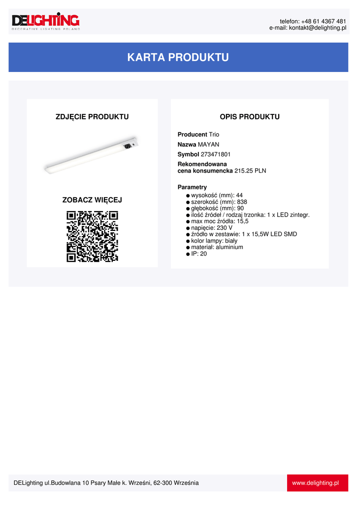 telefon: +48 61 4367 481 e-mail: [email protected] KARTA PRODUKTU ZDJĘCIE PRODUKTU OPIS PRODUKTU Producent Trio Nazwa MAYAN Symbol 273471801 Rekomendowana cena konsumencka 215.25 PLN ZOBACZ WIĘCEJ Parametry ● wysokość (mm): 44 ● szerokość (mm): 838 ● głębokość (mm): 90 ● ilość źródeł / rodzaj trzonka: 1 x LED zintegr. ● max moc źródła: 15,5 ● napięcie: 230 V ● źródło w zestawie: 1 x 15,5W LED SMD ● kolor lampy: biały ● materiał: aluminium ● IP: 20 DELighting ul.Budowlana 10 Psary Małe k. Wrześni, 62-300 Września www.delighting.pl
