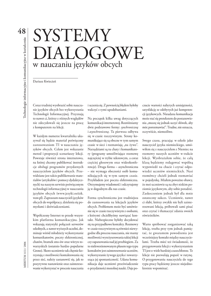 Technologie informacyjne i komunikacyjne w kształceniu 48 SYSTEMY DIALOGOWE w nauczaniu języków obcych Dariusz Kwiecień Coraz trudniej wyobrazić sobie nauczanie języków obcych bez wykorzystania Technologii Informacyjnej. Przyznają to nawet ci, którzy z różnych względów nie zdecydowali się jeszcze na pracę z komputerem na lekcji. MERITUM 1(1) / 2006 W każdym numerze kwartalnika ukazywał się będzie materiał poświęcony zastosowaniom TI w nauczaniu języków obcych. Celem jest wskazanie metod i propozycji scenariuszy lekcji. Powstaje również strona internetowa, na której chcemy publikować instrukcje obsługi programów przydatnych nauczycielom języków obcych. Przewidziane jest także publikowanie materiałów (artykułów i pomocy dydaktycznych) na naszym serwisie poświęconym technologii informacyjnej w nauczaniu języków obcych (www.jezyki.oeiizk. waw.pl). Zapraszam nauczycieli języków obcych do współpracy, dzielenia się pomysłami i doświadczeniami. Współczesny Internet to przede wszystkim platforma komunikacyjna. Jak wskazują statystyki połączeń serwerów szkolnych, a nawet wyższych uczelni, dominuje wśród młodzieży wykorzystanie komunikatorów, poczty elektronicznej, chatów, bramek sms-ów oraz witryn towarzyskich (ostatnio bardzo popularne Grono). Skoro uczniowie tak chętnie korzystają z możliwości kontaktowania się przez sieć, należy zastanowić się, jak to pozytywne nastawienie oraz zainteresowanie wykorzystać w procesie nauczania i uczenia się. Z pewnością błędem byłoby walczyć z tymi upodobaniami. Na początek kilka uwag dotyczących komunikacji internetowej. Rozróżniamy dwie podstawowe formy: synchroniczną i asynchroniczną. Ta pierwsza odbywa się w czasie rzeczywistym. Strony komunikujące się są obecne w tym samym czasie w sieci i rozmawiają „na żywo”. Narzędziami są tu chaty i komunikatory (programy umożliwiające rozmowę najczęściej w trybie tekstowym, a coraz częściej głosowym oraz wideokonferencje). Druga forma – asynchroniczna – nie wymaga obecności osób komunikujących się w tym samym czasie. Przykładem jest poczta elektroniczna. Otrzymujemy wiadomość i odczytujemy ją w dogodnym dla nas czasie. Forma synchroniczna jest trudniejsza do zastosowania na lekcjach języków obcych. Problemem może być umówienie się w czasie rzeczywistym z osobami, z którymi chcielibyśmy nawiązać kontakt. Niebezpieczne byłoby decydować się na przypadkowe kontakty. Rozmowy w czasie rzeczywistym są również niewygodne dla procesu nauczania, nie mamy możliwości wyreżyserowania takiej lekcji czy zapanowania nad jej przebiegiem. Za to niekwestionowanym plusem tego typu kontaktów jest zainteresowanie uczniów, wykorzystanie żywego języka i towarzysząca jej spontaniczność. Udana komunikacja daje uczniowi przeświadczenie o przydatności mozolnej nauki. Daje po- czucie wartości nabytych umiejętności, satysfakcję ze zdobytych już kompetencji językowych. Nieudana komunikacja może stać się pretekstem do postanowienia „muszę się jednak uczyć słówek, aby móc porozmawiać”. Trudne, nie oznacza, oczywiście, niemożliwe. Swego czasu, pracując w szkole jako nauczyciel języka niemieckiego, umówiłem się z nauczycielem z Niemiec na rozmowy naszych uczniów w trakcie lekcji. Wyobrażałem sobie, że całą klasą będziemy redagować wspólną wypowiedź na chacie i czytać odpowiedzi uczniów niemieckich. Nasi rozmówcy chcieli jednak rozmawiać w pojedynkę. Miałem poważne obawy, że moi uczniowie są na zbyt niskim poziomie językowym, aby sobie poradzić. Zaskoczeniem jednak był dla mnie ostateczny sukces. Uczniowie, nawet ci słabi, którzy zwykle nie byli zainteresowani lekcją, próbowali sami pisać oraz czytać i tłumaczyć zdania swoich rówieśników. Warto spróbować zorganizować taką lekcję, trzeba przy tym jednak pamiętać, że gwarantem powodzenia jest wcześniejszy kontakt między nauczycielami. Trzeba mieć też świadomość, że przygotowanie lekcji z wykorzystaniem TI jest o wiele bardziej czasochłonne. Te lekcje nie pozwalają popaść w rutynę. O przygotowaniu nauczyciela do tego typu pracy będziemy jeszcze niejednokrotnie wspominać. Scenariusz, który opisuję, jest formą zabawy językowej. Nauka poprzez zabawę jest najlepszą metodą także wtedy, gdy naszymi uczniami są dorośli. Z tego powodu proponuję przeprowadzenie lekcji z chaterbootem. SCENARIUSZ LEKCJI Faza przygotowania lekcji Nauczyciel uruchamia stronę z chaterbootem i zadaje pytania dotyczące jego osoby oraz notuje zadane pytania i udzielone odpowiedzi. Następnie grupuje je w bloki tematyczne, np. rodzina, zainteresowania, praca zawodowa, wykształcenie, itp. Przebieg lekcji Uczniowie (najlepiej w parach) prowadzą dialog ze sztucznym rozmówcą, przez około 5 minut, próbując jak najwięcej dowiedzieć się o jego osobie. Notują odpowiedzi chaterboota. W drugiej części lekcji nauczyciel pyta uczniów, czego dowiedzieli się o rozmówcy. Praca własna ucznia po lekcji (zadanie domowe) Nauczyciel podaje uczniom adres strony internetowej innego chaterboota i narzuca temat rozmowy. Wcześniej należy oczywiście sprawdzić, o czym można rozmawiać z wybranym automatem. Zwykle chaterbooty budowane są w określonym celu, np. „inteligentna” informacja o firmie, na której stronie znajduje się ten system dialogowy. Propozycja pracy na poziomie zaawansowanym (wykonanie projektu). Uczniowie przygotowują strony z własnym chaterbootem. Automat powinien informować rozmówcę o osobie ucznia, o tym, jak wygląda jego doba, mieście, w którym żyje, szkole, do której uczęszcza. Automat może też być specjalistą z zakresu innego przedmiotu szkolnego, np. opowiadać o układzie słonecznym. Wszystko zależy od poziomu zaawansowania językowego uczniów. Tę część byłoby dobrze połączyć z lekcją technologii informacyjnej lub informatyki. Współpraca nauczyciel
