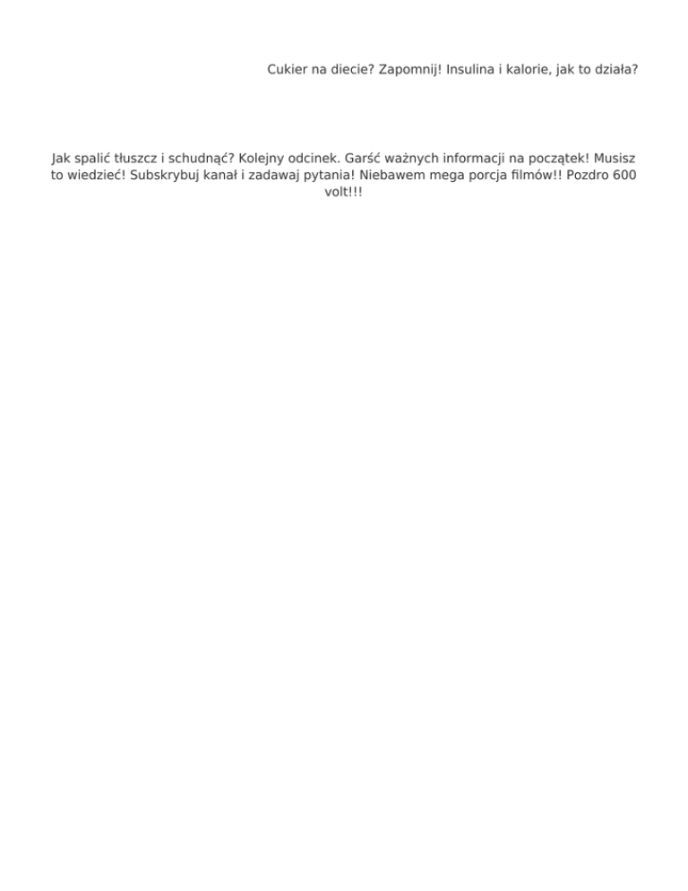 Cukier na diecie? Zapomnij! Insulina i kalorie, jak to działa? Jak spalić tłuszcz i schudnąć? Kolejny odcinek. Garść ważnych informacji na początek! Musisz to wiedzieć! Subskrybuj kanał i zadawaj pytania! Niebawem mega porcja filmów!! Pozdro 600 volt!!!