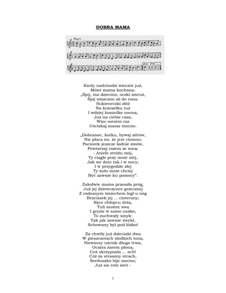 DOBRA MAMA Kiedy nadchodzi wieczór już, Mówi mama kochana: „Śpij, ma dziecino, oczki zmruż, Śpij smaczno aż do rana. Sukieneczki złóż Na krzesełku tuż I wdziej koszulkę nocną; Już na ciebie czas, Więc ostatni raz Uściskaj mamę mocno. „Dobranoc, kotku, bywaj zdrów, Nie płacz mi, że jest ciemno; Paciorek jeszcze ładnie zmów, Powtarzaj razem ze mną: - Aniele stróżu mój, Ty ciągle przy mnie stój, Jak we dnie tak i w nocy; I w przygodzie złej Ty koło mnie chciej Być zawsze ku pomocy”. Zaledwie mama przeszła próg, Już jej dziewczynce grzecznej Z radosnym śmiechem legł u nóg Braciszek jej ... cioteczny; Ręce chłopcu drżą, Tuli siostrę swą I gryzie w samo uszko; To zuchwały smyk: Tak jak zawsze zwykł, Schowany był pod łóżko! Za chwilę już dzieciaki dwa W pieszczotach słodkich toną, Niewinny uścisk długo trwa, Oczęta żarem płoną; Coś skrzypnęło ... ach! Cóż za straszny strach, Serduszko bije mocno; Już się robi świt - 1 „Adasiu ... mnie wstyd ... Oddaj koszulkę nocną ...” Różane ciałko drży jak liść „ ... Adasiu, tak nie można ... Ja muszę przecie za mąż iść, Ja muszę być ... ostrożna! Przecie dobrze wiesz, Że bym chciała też, Oddałabym ci wszystko .. Ale potem ... cóż? Chyba umrzeć już Albo ... zostać ... artystką ...” Niedługo słychać ranny gwar, Dziewczynka śpi już sama; Kneipowskiej kawki niosąc war W drzwi wchodzi dobra mama. Wlepia tkliwy wzrok: Dziś szesnasty rok Zaczyna drogie dziecię! „Co by tu? ... Ach, wiem! Waniliowy krem: Nic tak nie lubi w świecie ...” Pisane w r. 1911 2