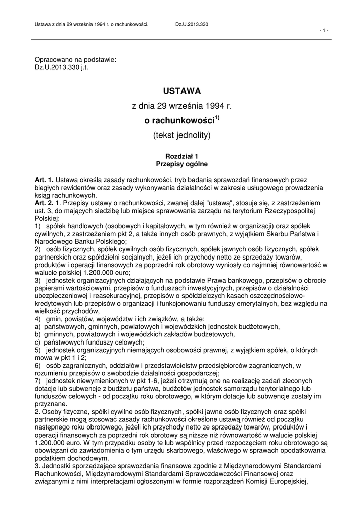 Ustawa z dnia 29 września 1994 r. o rachunkowości. Dz.U.2013.330 -1- Opracowano na podstawie: Dz.U.2013.330 j.t. USTAWA z dnia 29 września 1994 r. o rachunkowości1) (tekst jednolity) Rozdział 1 Przepisy ogólne Art. 1. Ustawa określa zasady rachunkowości, tryb badania sprawozdań finansowych przez biegłych rewidentów oraz zasady wykonywania działalności w zakresie usługowego prowadzenia ksiąg rachunkowych. Art. 2. 1. Przepisy ustawy o rachunkowości, zwanej dalej "ustawą", stosuje się, z zastrzeżeniem ust. 3, do mających siedzibę lub miejsce sprawowania zarządu na terytorium Rzeczypospolitej Polskiej: 1) spółek handlowych (osobowych i kapitałowych, w tym również w organizacji) oraz spółek cywilnych, z zastrzeżeniem pkt 2, a także innych osób prawnych, z wyjątkiem Skarbu Państwa i Narodowego Banku Polskiego; 2) osób fizycznych, spółek cywilnych osób fizycznych, spółek jawnych osób fizycznych, spółek partnerskich oraz spółdzielni socjalnych, jeżeli ich przychody netto ze sprzedaży towarów, produktów i operacji finansowych za poprzedni rok obrotowy wyniosły co najmniej równowartość w walucie polskiej 1.200.000 euro; 3) jednostek organizacyjnych działających na podstawie Prawa bankowego, przepisów o obrocie papierami wartościowymi, przepisów o funduszach inwestycyjnych, przepisów o działalności ubezpieczeniowej i reasekuracyjnej, przepisów o spółdzielczych kasach oszczędnościowokredytowych lub przepisów o organizacji i funkcjonowaniu funduszy emerytalnych, bez względu na wielkość przychodów, 4) gmin, powiatów, województw i ich związków, a także: a) państwowych, gminnych, powiatowych i wojewódzkich jednostek budżetowych, b) gminnych, powiatowych i wojewódzkich zakładów budżetowych, c) państwowych funduszy celowych; 5) jednostek organizacyjnych niemających osobowości prawnej, z wyjątkiem spółek, o których mowa w pkt 1 i 2; 6) osób zagranicznych, oddziałów i przedstawicielstw przedsiębiorców zagranicznych, w rozumieniu przepisów o swobodzie działalności gospodarczej; 7) jednostek niewymienionych w pkt 1-6, jeżeli otrzymują one na realizację zadań zleconych dotacje lub subwencje z budżetu państwa, budżetów jednostek samorządu terytorialnego lub funduszów celowych - od początku roku obrotowego, w którym dotacje lub subwencje zostały im przyznane. 2. Osoby fizyczne, spółki cywilne osób fizycznych, spółki jawne osób fizycznych oraz spółki partnerskie mogą stosować zasady rachunkowości określone ustawą również od początku następnego roku obrotowego, jeżeli ich przychody netto ze sprzedaży towarów, produktów i operacji finansowych za poprzedni rok obrotowy są niższe niż równowartość w walucie polskiej 1.200.000 euro. W tym przypadku osoby te lub wspólnicy przed rozpoczęciem roku obrotowego są obowiązani do zawiadomienia o tym urzędu skarbowego, właściwego w sprawach opodatkowania podatkiem dochodowym. 3. Jednostki sporządzające sprawozdania finansowe zgodnie z Międzynarodowymi Standardami Rachunkowości, Międzynarodowymi Standardami Sprawozdawczości Finansowej oraz związanymi z nimi interpretacjami ogłoszonymi w formie rozporządzeń Komisji Europejskiej, Ustawa z dnia 29 września 1994 r. o rachunkowości. Dz.U.2013.330 -2- zwanymi dalej "MSR", stosują przepisy ustawy oraz przepisy wykonawcze wydane na jej podstawie, w zakresie nieuregulowanym przez MSR. Art. 3. 1. Ilekroć w ustawie jest mowa o: 1) jednostce - rozumie się przez to podmioty i osoby określone w art. 2 ust. 1; 2) banku - rozumie się przez to jednostkę działającą na podstawie przepisów Prawa bankowego; 3) zakładzie ubezpieczeń - rozumie się przez to jednostkę prowadzącą działalność ubezpieczeniową na podstawie przepisów o działalności ubezpieczeniowej; 3a) przepisach o obrocie papierami wartościowymi - rozumie się przez to przepisy ustawy o obrocie instrumentami finansowymi, ustawy o nadzorze nad rynkiem kapitałowym, ustawy o ofercie publicznej i warunkach wprowadzania instrumentów finansowych do zorganizowanego systemu obrotu oraz o spółkach publicznych; 3b) zakładzie reasekuracji - rozumie się przez to jednostkę prowadzącą działalność reasekuracyjną na podstawie przepisów o działalności reasekuracyjnej; 4) udziałach lub udziałowcach - rozumie się przez to również odpowiednio akcje lub akcjonariuszy; 5) krajowych środkach płatniczych, walutach obcych i dewizach - rozumie się przez to krajowe środki płatnicze, waluty obce i dewizy, o których mowa w przepisach Prawa dewizowego; 5a) członku organu jednostki - rozumie się przez to osobę fizyczną, pełniącą funkcję członka zarządu lub innego organu zarządzającego, członka rady nadzorczej lub innego organu nadzorującego, jak również innego organu administrującego jednostki, powołaną do pełnienia tej funkcji zgodnie z postanowieniami umowy spółki, statutu lub innymi obowiązującymi jednostkę przepisami prawa; 6) kierowniku jednostki - rozumie się przez to członka zarządu lub innego organu zarządzającego, a jeżeli organ jest wieloosobowy - członków tego organu, z wyłączeniem pełnomocników ustanowionych przez jednostkę. W przypadku spółki jawnej i spółki cywilnej za kierownika jednostki uważa się - wspólników prowadzących sprawy spółki, w przypadku spółki partnerskiej - wspólników prowadzących sprawy spółki albo zarząd, a w odniesieniu do spółki komandytowej i spółki komandytowo-akcyjnej - komplementariuszy prowadzących sprawy spółki. W przypadku osoby fizycznej prowadzącej działalność gospodarczą za kierownika jednostki uważa się tę osobę; przepis ten stosuje się odpowiednio do osób wykonujących wolne zawody. Za kierownika jednostki uważa się również likwidatora, a także syndyka lub zarządcę ustanowionego w postępowaniu upadłościowym; 7) organie zatwierdzającym - rozumie się przez to organ, który zgodnie z obow