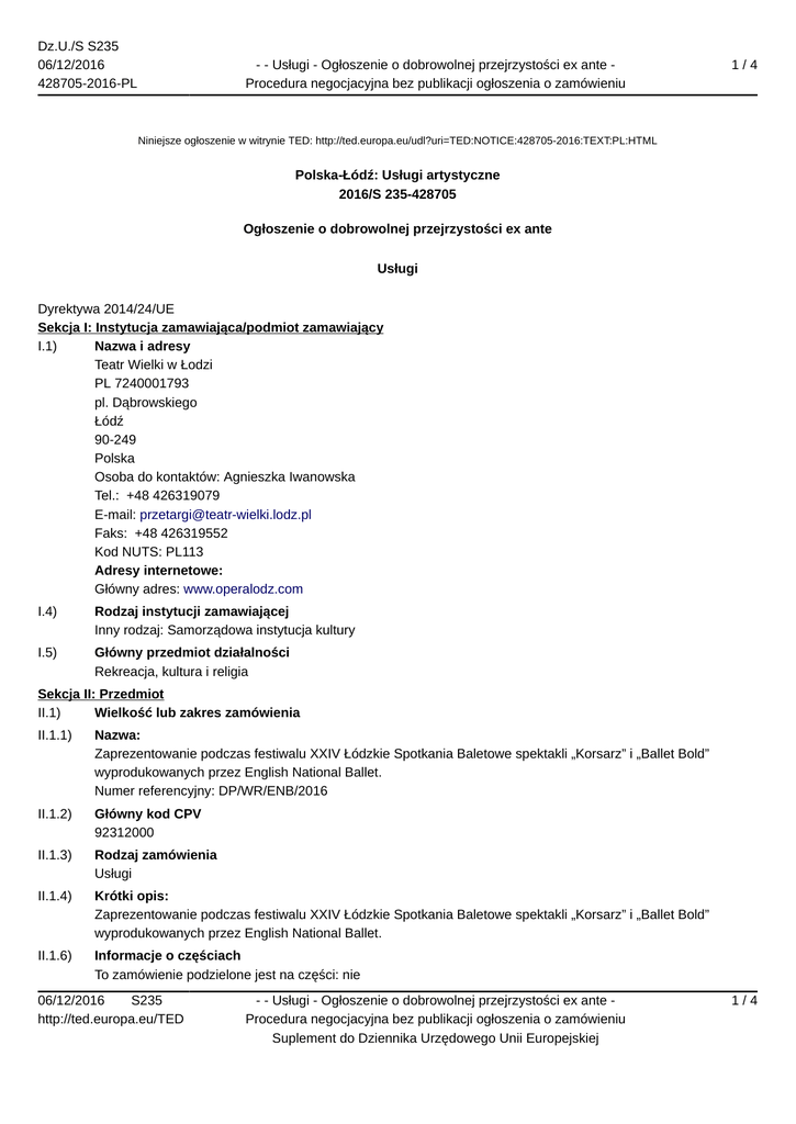 Dz.U./S S235 06/12/2016 428705-2016-PL - - Usługi - Ogłoszenie o dobrowolnej przejrzystości ex ante Procedura negocjacyjna bez publikacji ogłoszenia o zamówieniu 1/4 Niniejsze ogłoszenie w witrynie TED: http://ted.europa.eu/udl?uri=TED:NOTICE:428705-2016:TEXT:PL:HTML Polska-Łódź: Usługi artystyczne 2016/S 235-428705 Ogłoszenie o dobrowolnej przejrzystości ex ante Usługi Dyrektywa 2014/24/UE Sekcja I: Instytucja zamawiająca/podmiot zamawiający I.1) Nazwa i adresy Teatr Wielki w Łodzi PL 7240001793 pl. Dąbrowskiego Łódź 90-249 Polska Osoba do kontaktów: Agnieszka Iwanowska Tel.: +48 426319079 E-mail: [email protected] Faks: +48 426319552 Kod NUTS: PL113 Adresy internetowe: Główny adres: www.operalodz.com I.4) Rodzaj instytucji zamawiającej Inny rodzaj: Samorządowa instytucja kultury I.5) Główny przedmiot działalności Rekreacja, kultura i religia Sekcja II: Przedmiot II.1) Wielkość lub zakres zamówienia II.1.1) Nazwa: Zaprezentowanie podczas festiwalu XXIV Łódzkie Spotkania Baletowe spektakli „Korsarz” i „Ballet Bold” wyprodukowanych przez English National Ballet. Numer referencyjny: DP/WR/ENB/2016 II.1.2) Główny kod CPV 92312000 II.1.3) Rodzaj zamówienia Usługi II.1.4) Krótki opis: Zaprezentowanie podczas festiwalu XXIV Łódzkie Spotkania Baletowe spektakli „Korsarz” i „Ballet Bold” wyprodukowanych przez English National Ballet. II.1.6) Informacje o częściach To zamówienie podzielone jest na części: nie 06/12/2016 S235 http://ted.europa.eu/TED - - Usługi - Ogłoszenie o dobrowolnej przejrzystości ex ante Procedura negocjacyjna bez publikacji ogłoszenia o zamówieniu Suplement do Dziennika Urzędowego Unii Europejskiej 1/4 Dz.U./S S235 06/12/2016 428705-2016-PL - - Usługi - Ogłoszenie o dobrowolnej przejrzystości ex ante Procedura negocjacyjna bez publikacji ogłoszenia o zamówieniu 2/4 II.1.7) Całkowita wartość zamówienia (bez VAT) Wartość bez VAT: 207 220.00 GBP II.2) Opis II.2.1) Nazwa: II.2.2) Dodatkowy kod lub kody CPV II.2.3) Miejsce świadczenia usług Kod NUTS: PL113 Główne miejsce lub lokalizacja realizacji: Teatr Wielki w Łodzi Polska 90-249 Łódź, pl. Dąbrowskiego. II.2.4) Opis zamówienia: Zaprezentowanie podczas festiwalu XXIV Łódzkie Spotkania Baletowe spektakli „Korsarz” i „Ballet Bold” wyprodukowanych przez English National Ballet. II.2.5) Kryteria udzielenia zamówienia II.2.11) Informacje o opcjach Opcje: nie II.2.13) Informacje o funduszach Unii Europejskiej Zamówienie dotyczy projektu/programu finansowanego ze środków Unii Europejskiej: nie II.2.14) Informacje dodatkowe Uwaga!! W polu sekcji V.2.1) (data zawarcia umowy) arkusz nie pozwala wprowadzić daty późniejszej niż data bieżąca. W związku z powyższym Zamawiający w tym miejscu (sekcja V.2.1)) wprowadził datę wszczęcia postępowania, tj. zaproszenia wykonawcy do udziału w negocjacjach. Sekcja IV: Procedura IV.1) Opis IV.1.1) Rodzaj procedury Procedura negocjacyjna bez uprzedniej publikacji • Roboty budowlane/dostawy/usługi mogą być zrealizowane tylko przez określonego wykonawcę z następującego powodu: • zamówienie mające na celu stworzenie lub nabycie niepowtarzalnego dzieła sztuki lub wykonania artystycznego Wyjaśnienie: (art. 67 ust. 1 pkt. 1a) Teatr Wielki w Łodzi (TWŁ) jest organizatorem festiwalu Łódzkie Spotkania Baletowe (ŁSB) – największej i najbardziej prestiżowej imprezy baletowej w Polsce o zasięgu światowym. ŁSB są organizowane na scenie TWŁ w formie biennale od 1968r. Ideą festiwalu jest prezentowanie różnych form tańca przez najwybitniejsze zespoły baletowe z całego świata. Festiwal cieszy się dużą popularnością i prestiżem, czego dowodem jest udział w dotychczasowych edycjach najwybitniejszych zespołów baletowych o światowej renomie. ŁSB są znaczącą wizytówką Łodzi i z powodzeniem promują nasze miasto w świecie. ŁSB są wpisane do kalendarza międzynarodowych imprez MKiDN. Współorganizatorem jest Urząd Marszałkowski Województwa Łódzkiego. Do udziału w XXIV edycji pragniemy zaprosić jeden z najznamienitszych klasycznych zespołów baletowych na świecie – English National Ballet (ENB) – założony w 1950 r. przez znamienitych tancerzy Alicię Markovą i Antona Dolina przy finansowym wsparciu polskiego impresario Juliana Braunswega. Zespół miał upowszechniać światowej klasy balet klasyczny wśród szerokiej publiczności. Obecnie ENB jest jednym z najczęściej występujących gościnnie europejskich zespołów baletowych. Zespół regularnie występuje w London 06/12/2016 S235 http://ted.europa.eu/TED - - Usługi - Ogłoszenie o dobrowolnej przejrzystości ex ante Procedura negocjacyjna bez publikacji ogłoszenia o zamówieniu Suplement do Dziennika Urzędowego Unii Europejskiej 2/4 Dz.U./S S235 06/12/2016 428705-2016-PL - - Usługi - Ogłoszenie o dobrowolnej przejrzystości ex ante Procedura negocjacyjna bez publikacji ogłoszenia o zamówieniu 3/4 Coliseum i Royal Albert Hall. O światowej klasie ENB świadczy także patronat Księcia Yorku oraz fakt, że zespół od 2014r jest stowarzyszony ze znanym na całym świecie teatrem tańca Sadler's Wells. Brany pod uwagę do zaprezentowania w ramach ŁSB spektakl „Korsarz” to klasyczna choreografia autorstwa światowej sławy kanadyjskiej choreograf Anny-Marie Holmes według Mariusa Petipy i Konstantina Sergeyeva. Projekty dekoracji i kostiumów przygotował hollywoodzki twórca Bob Ringwood, który odpowiadał za takie filmowe hity jak m.in. „Batman”. Po premierze spektakl zebrał bardzo entuzjastyczne recenzje w najważniejszych brytyjskich mediach, stając się sztandarowym spektaklem zespołu. Poza spektaklem „Korsarz” zespół zaprezentowałby wieczór baletowy w trzech częściach pt. „Ballet Bold”, na który składają się choreografie światowej sławy choreografów Williama Forsythe'a, Hansa van Mannena oraz Kennetha MacMillana. Tak skomponowany wieczór