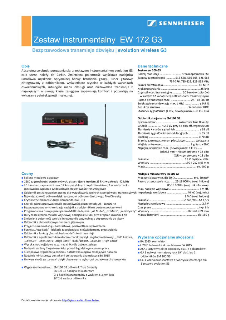 Zestaw instrumentalny EW 172 G3 Bezprzewodowa transmisja dźwięku | evolution wireless G3 Opis Dane techniczne Absolutna swoboda poruszania się: z zestawem instrumentalnym evolution G3 cała scena należy do Ciebie. Zmieniana pojemność wejściowa nadajnika umożliwia uzyskanie optymalnej barwy brzmienia gitary. Tuner gitarowy zintegrowany z odbiornikiem, wyświetlacze czytelne w każdych warunkach oświetleniowych, intuicyjne menu obsługi oraz niezawodna transmisja z największym w swojej klasie zasięgiem zapewniają komfort i pozwalają na wykazanie pełni ekspresji muzycznej. Zestaw ew 100 G3 Rodzaj modulacji ............................. szerokopasmowa FM Zakresy częstotliwości ............ 516-558, 566-608, 626-668 734-776, 780-822, 823-865 MHz Zakres przestrajania .............................................. 42 MHz Krok przestrajania ................................................... 25 kHz Częstotliwości transmisyjne ............. 20 banków (zbiorów) w każdym 12 kanały z częstotliwościami transmisyjnymi Pasmo przenoszenia m.cz. .......................... 25 - 18 000 Hz Zniekształcenia (dewiacja max. 1 kHz) ................... ≤ 0,9 % Redukcja szumów .................................... Sennheiser HDX Stosunek sygnał/szum (1 mV, dewiacja nom.) .. ≥ 110 dBA Odbiornik stacjonarny EM 100 G3 System odbioru ........................... różnicowy True Divesity Czułość .................. < 2,5 μV przy 52 dBA eff. sygnał/szum Tłumienie kanałów sąsiednich ............................... ≥ 65 dB Tłumienie sygnałów intermodulacyjnych .............. ≥ 65 dB Blocking ................................................................. ≥ 70 dB Bramka szumowa z tonem pilotującym ............ wyłączana Wejścia antenowe ...................................... 2 gniazda BNC Napięcie wyjściowe m.cz. (dewiacja max. 1 kHz) ...... jack 6,3 mm – niesymetryczne + 12 dBu XLR – symetryczne + 18 dBu Zasilanie .............................................. 12 V napięcie stałe Wymiary .............................................. 190 x 212 x 43 mm Masa ................................................................... ok. 900 g Cechy ■ Solidne metalowe obudowy ■ 1680 częstotliwości transmisyjnych, przestrajanie krokiem 25 kHz w zakresie 42 MHz ■ 20 banków z zapisanymi max. 12 kompatybilnymi częstotliwościami, 1 otwarty bank z możliwością wpisania 12 dowolnych częstotliwości transmisyjnych ■ Odbiornik ze skanowaniem pasma dla wyszukiwania wolnych częstotliwości transmisyjnych ■ Najwyższa jakość odbioru dzięki systemowi odbioru różnicowego TrueDiversity ■ Krystaliczne brzmienie dzięki kompanderowi HDX ■ Szeroki zakres przetwarzanych częstotliwości akustycznych: 25 - 18 000 Hz ■ Bezprzewodowa synchronizacja nadajnika z odbiornikiem portem podczerwieni ■ Programowana funkcja przełącznika MUTE nadajnika: „AF Mute”, „RF Mute”, „nieaktywny” ■ Duży zakres zmian czułości wejściowej nadajnika: 60 dB, przestrajanie krokiem 3 dB ■ Zmieniana pojemność wejścia liniowego dla optymalnego dopasowania do gitary ■ Odbiornik z chromatycznym tunerem gitarowym ■ Przyjazne menu obsługi. Kontrastowe, podświetlane wyświetlacze ■ Funkcja „Auto Lock” - blokada zapobiegająca nieświadomemu przestrojeniu ■ Odbiornik z funkcją „Soundcheck mode” - test transmisji ■ Odbiornik z equalizerem-korektorem charakterystyki częstotliwościowej: „Flat” liniowa, „Low Cut” - 3dB/180 Hz, „High Boost” +6 dB/10 kHz, „Low Cut + High Boost” ■ Wysoka moc wyjściowa w.cz. nadajnika dla dużego zasięgu ■ Nadajnik zasilany 2 ogniwami AA z ponad 8-godzinnym czasem pracy ■ 4-stopniowa sygnalizacja poziomu naładowania ogniw zasilających nadajnik ■ Nadajnik miniaturowy ze stykami do ładowania akumulatora BA 2015 ■ Uniwersalność zastosowań dzięki obszernemu wyborowi dodatkowych akcesoriów ■ Wyposażenie zestawu: EM 100 G3 odbiornik True Diversity SK 100 G3 nadajnik miniaturowy Ci 1 kabel instrumentalny z wtykiem 6,3 mm jack NT 2-1 zasilacz odbiornika Dodatkowe informacje i akcesoria http://aplauzaudio.pl/sennheiser Nadajnik miniaturowy SK 100 G3 Moc wyjściowa w.cz. dla 50 Ω ........................ typ. 30 mW Pasmo przenoszenia m.cz. ..... 25-18 000 Hz (wej. liniowe) 80-18 000 Hz (wej. mikrofonowe) Max. napięcie wejściowe ....................................... 3 V eff. Impedancja wejściowa ........................... 40 kΩ (wej. mik.) 1 MΩ (wej. liniowe) Zasilanie ............................................. 2 bat./aku. AA 1,5 V Napięcie znamionowe ............................................... 2,4 V Czas pracy ............................................................. typ. 8 h Wymiary .................................................. 82 x 64 x 24 mm Masa z bateriami ................................................. ok. 160 g Wybrane opcjonalne akcesoria ■ BA 2015 akumulator ■ L 2015 ładowarka akumulatorów BA 2015 ■ ASA 1 aktywny spliter antenowy dla 1-4 odbiorników ■ GA 3 uchwyt montażowy rack 19” dla 1 lub 2 odbiorników EM 100 G3 ■ CC 3 walizka transportowa z tworzywa sztucznego dla 1 zestawu evolution G3