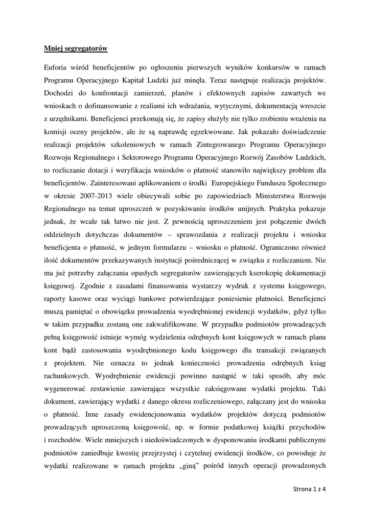 Mniej segregatorów Euforia wśród beneficjentów po ogłoszeniu pierwszych wyników konkursów w ramach Programu Operacyjnego Kapitał Ludzki juŜ minęła. Teraz następuje realizacja projektów. Dochodzi do konfrontacji zamierzeń, planów i efektownych zapisów zawartych we wnioskach o dofinansowanie z realiami ich wdraŜania, wytycznymi, dokumentacją wreszcie z urzędnikami. Beneficjenci przekonują się, Ŝe zapisy słuŜyły nie tylko zrobieniu wraŜenia na komisji oceny projektów, ale Ŝe są naprawdę egzekwowane. Jak pokazało doświadczenie realizacji projektów szkoleniowych w ramach Zintegrowanego Programu Operacyjnego Rozwoju Regionalnego i Sektorowego Programu Operacyjnego Rozwój Zasobów Ludzkich, to rozliczanie dotacji i weryfikacja wniosków o płatność stanowiło największy problem dla beneficjentów. Zainteresowani aplikowaniem o środki Europejskiego Funduszu Społecznego w okresie 2007-2013 wiele obiecywali sobie po zapowiedziach Ministerstwa Rozwoju Regionalnego na temat uproszczeń w pozyskiwaniu środków unijnych. Praktyka pokazuje jednak, Ŝe wcale tak łatwo nie jest. Z pewnością uproszczeniem jest połączenie dwóch oddzielnych dotychczas dokumentów – sprawozdania z realizacji projektu i wniosku beneficjenta o płatność, w jednym formularzu – wniosku o płatność. Ograniczono równieŜ ilość dokumentów przekazywanych instytucji pośredniczącej w związku z rozliczaniem. Nie ma juŜ potrzeby załączania opasłych segregatorów zawierających kserokopię dokumentacji księgowej. Zgodnie z zasadami finansowania wystarczy wydruk z systemu księgowego, raporty kasowe oraz wyciągi bankowe potwierdzające poniesienie płatności. Beneficjenci muszą pamiętać o obowiązku prowadzenia wyodrębnionej ewidencji wydatków, gdyŜ tylko w takim przypadku zostaną one zakwalifikowane. W przypadku podmiotów prowadzących pełną księgowość istnieje wymóg wydzielenia odrębnych kont księgowych w ramach planu kont bądź zastosowania wyodrębnionego kodu księgowego dla transakcji związanych z projektem. Nie oznacza to jednak konieczności prowadzenia odrębnych ksiąg rachunkowych. Wyodrębnienie ewidencji powinno nastąpić w taki sposób, aby móc wygenerować zestawienie zawierające wszystkie zaksięgowane wydatki projektu. Taki dokument, zawierający wydatki z danego okresu rozliczeniowego, załączany jest do wniosku o płatność. Inne zasady ewidencjonowania wydatków projektów dotyczą podmiotów prowadzących uproszczoną księgowość, np. w formie podatkowej ksiąŜki przychodów i rozchodów. Wiele mniejszych i niedoświadczonych w dysponowaniu środkami publicznymi podmiotów zaniedbuje kwestię przejrzystej i czytelnej ewidencji środków, co powoduje Ŝe wydatki realizowane w ramach projektu „giną” pośród innych operacji prowadzonych Strona 1 z 4 w ramach działalności komercyjnej. Wyodrębnienie wydatków następuje nie tylko dzięki odpowiedniemu opisaniu dokumentów księgowych, ale równieŜ poprzez właściwe oznaczenie transakcji w ksiąŜce przychodów i rozchodów. Ponadto wytyczne Ministerstwa Rozwoju Regionalnego „Zasady finansowania PO KL” sugerują prowadzenie na bieŜąco kumulatywnego zestawienia dokumentów potwierdzających poniesione wydatki. Po zakończeniu kaŜdego miesiąca zestawienie powinno zostać wydrukowane i podpisane przez osobę sporządzającą i zatwierdzającą oraz dołączone do dokumentacji projektu potwierdzającej poniesione wydatki. Zestawienie to przydatne będzie równieŜ samemu beneficjentowi, gdyŜ umoŜliwi monitoring postępu finansowego, dzięki czemu zapobiec będzie moŜna przekroczeniom w budŜecie skutkującym uznaniem kosztów za niekwalifikowalne. Ułatwi ono równieŜ przygotowanie wniosku o płatność poniewaŜ sporządzane jest w oparciu o załącznik do wniosku zawierający zestawienie wydatków. Istotnym udogodnieniem dla projektodawców jest ograniczenie ilości przekazywanych do instytucji pośredniczącej dokumentów. „Zasady finansowania POKL” zakładają, Ŝe beneficjent nie przedkłada dokumentów księgowych do wniosku o płatność, gdyŜ ich weryfikacja występuje jedynie na podstawie wyciągów bankowych, raportów kasowych i wyciągu z ewidencji księgowej, bądź z zestawień dokumentów. Praktyka pokazuje jednak, Ŝe niektóre z instytucji pośredniczących wymagają od realizatorów projektu próby dokumentów. Wskazuje to, jak silna jest obawa urzędników przed ewentualnymi nieprawidłowościami. Postępowanie to wydaje się racjonalne, gdyŜ z jednej strony chroni interesy instytucji przyznającej dotację przed niewłaściwym jej wydaniem, a z drugiej strony stanowi mobilizację dla projektodawców, aby na bieŜąco i rzetelnie prowadzić dokumentację. Pozwoli to teŜ uniknąć powielania błędów, które odpowiednio wcześnie moŜe wykryć instytucja pośrednicząca. Problemem, który nurtuje wiele osób rozliczających projekty, lecz na który wielu innych nie zwraca uwagi, jest kwestia sposobu dokonywania wyboru wykonawców i dostawców. Niestety zdarza się, Ŝe na etapie rozliczania wniosku o płatność projektodawca dowiaduje się, Ŝe powinien zastosować odpowiedni tryb Prawa Zamówień Publicznych, a tego nie uczynił. Efekt jest łatwy do przewidzenia, bo projektodawca dowiaduje się o nieuznaniu kwalifikowalności poniesionych kosztów - w konsekwencji naraŜa się na wielotysięczne straty. Nowelizacja ustawy PZP z 2006 r. znacznie ograniczyła zakres jej stosowania przez podmioty prywatne. Nie zwalnia to jednak takich beneficjentów przed obowiązkiem zachowania zasad przejrzystości, równego traktowania i uczciwej konkurencji. JuŜ na etapie weryfikacji wniosków o płatność realizatorzy projektu mogą zostać poproszeni o wskazanie zasad wyboru wykonawcy bądź dostawcy i przedstawienia róŜnych Strona 2 z 4 ofert. Z pewnością kwestię tę uporządkuje wprowadzenie do umów podpisywanych z beneficjentami po 1 pa