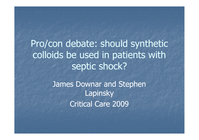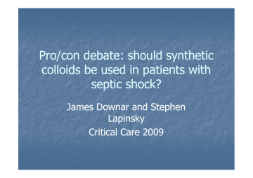 Pro/con debate: should synthetic colloids be used in patients with septic shock? James Downar and Stephen Lapinsky Critical Care 2009 Koloidy są powszechnie stosowane w celu uzyskania i utrzymania adekwatnej objętości śródnaczyniowej. Wysokie koszty albuminalbumin-naturalnych koloidówkoloidówskłaniają do poszukiwania bezpieczniejszych i tańszych koliodów syntetycznych HES Naturalny zmodyfikowany polimer amylopektyny, hydrolizowany przez amylazę do cząstek 50 kDa, a następnie wydalane z moczem Preparaty charakteryzowane przez masę cząsteczkową (MW) wielkocząsteczkowe –ok. 450 kDa, średniocząsteczkowe 130130-200 kDa, drobnocząsteczkowe 40 40--70 kDa, stopień substytucji molarnej DS (>0.6 metabolizowane wolniej) oraz współczynnik C2/C6 (>8 metabolizowane wolniej) Żelatyny Polidyspersyjne polipeptydy otrzymywane w wyniku degradacji kolagenu bydlęcego Krótki czas urzymywania się żelatyn w łożysku naczyniowym, częste reakcje alergiczne, brak właściwości reologicznych, priony?? Nie kumuluja się w organizmie, brak istotnego klinicznie wpływu na krzepnięcie krwi, brak ograniczeń co do zalecanych dawek Dekstrany Polidyspersyjne rortwory polimerów glukozy produkowane przez bakterie Leuconostoc mesenteroides, typowe MW 4040-70 kDa, Efekt reologiczny, działanie antykoagulacyjne,nasilenie fibrynolizy, wydłużenie czasu krwawienia oraz możliwość nasilenia krwawienia Stosunkowo częste reakcje anafilaktyczne, ostra niewydolność nerek, możliwość zafałszowania oznaczeń grupy krwi i próby zgodności Pro: Nie ma usprawiedliwienia dla stosowania syntetycznych koloidów u pacjentów we wstrząsie septycznym Powszechnie znane potencjalne ryzyko wystąpienia niewydolności nerek, zaburzeń krzepnięcia, reakcji anafilaktycznych, zaburzenie funkcji układu siateczkowosiateczkowośródbłonkowego, zaburzenie funkcji wątroby, świądu. Koloidy uważane za bezpieczne w wyniku braku długoterminowych badań Schortgen i współpracownicy 129 pacjentów –2 grupy: HES 200/0.6 lub 3% żelatynażelatyna34 dni obserwacji W grupie otrzymującej HES stwierdzono częstsze występowanie ostrej niewydolności nerek (42% vs 34%) definiowanej jako 2x wzrost wartości kreatyny Ograniczenie ilości HESu –średnio 14 ml/kg w 1 dobie, <20ml/kg w ciągu następnych 3 dni VISEP (Efficacy of Volume substitution and Insulin Therapy i Severe Sepsis) 537 pacjentówpacjentów- HES 200/0.5 lub mleczan Ringera przez 96h, cel: CVP>8mmHg,MAP>70mmHg, saturacja żylna>70% W grupie otrzymującej HES stwierdzono częstsze występowanie ostrej niewydolności nerek wymagającej dializoterapii (31% vs 19%) Limit 20 ml/kg/db przekroczony był u ok. 35% pacjentów, ale w grupie otrzymującej dawki polecane także stwierdzono większą częstość ARF Efekt kumulacji dawkidawki- większa całkowita dawka HES= większa częstość niewydolności nerek oraz wyższa śmiertelność oceniana po 90 dobie Żelatyny i Dekstran Brak dużych, randomizowanych badań dotyczących bezpieczeństwa stosowania u pacjentów w ciężkiej sepsie Brak danych pozwalających uważać deksran i żelatynę za bezpieczniejsze w ARF WielkokoWielkoko- i średniocząsteczkowe rr-ry HES odpowiedzialne za koagulopatię z rozcieńczenia( cz. VIII i cz. von Willebranda), zaburzenie funkcji PLT= większe zapotrzebowanie na KKCz Con: Syntetyczne koloidy powinny być używane ale nie nadużywane VISEP- HES dominującym płynemVISEPpłynem- średnio 2,4 l/db, max 13l/db w 11ej dobie terapii, ponadto w grupie kontrolnej (z krystaloidem) 26% otrzymywało koloidy Badania z HESem jako „dodatkiem” do krystaloidów wykazały korzystny wpływ na hemodynamikę i dostarczanie tlenu do tkanek, nie oceniano natomiast czynności nerek= w praktyce klinicznej nie wiąże się ARF z HES Ryzyko ARF u pacjentów bez stwierdzonej uprzednio dysfunkcji nerek, otrzymujących koloidy i HES jest prawdopodobni nikłe Brak badań dotyczących preparatów nowej generacji Con: Syntetyczne koloidy powinny być używane ale nie nadużywane c.d. Żadne z cytowanych badań nie wykazało związku między stosowaniem preparatów drobnocząsteczkowych HES a koniecznością prowadzenia terapii nerkozastępczej czy zaburzeniami krzepnięcia Ponadto w grupie dawców nerek otrzymujących HES 130/0.4 stwierdzono u biorców istotną redukcję częstości późnych odrzuceń przeszczepów (22% vs 33%) W badaniach na zwierzętach stwierdzono, że zrównoważone roztwory koloidów powodują mniejsze zaburzenia czynności nerek i krzepnięcia niż „klasyczne” koloidy Wnioski Aktualnie dostępne dane kliniczne powinny zwrócić uwagę klinicystów na potencjalne ryzyko wynikające ze stosowania wysokich dawek HES, zwłaszcza średniocząsteczkowego Syntetyczne koloidy nie powinny być stosowane jako podstawowe płyny w leczeniu pacjentów w stanie krytycznym Należy zwrócić uwagę na możliwość wystąpienia objawów ubocznych podczas terapii tymi preparatami oraz monitorować ich dawki tak, aby nie przekroczyć dawek rekomendowanych.
