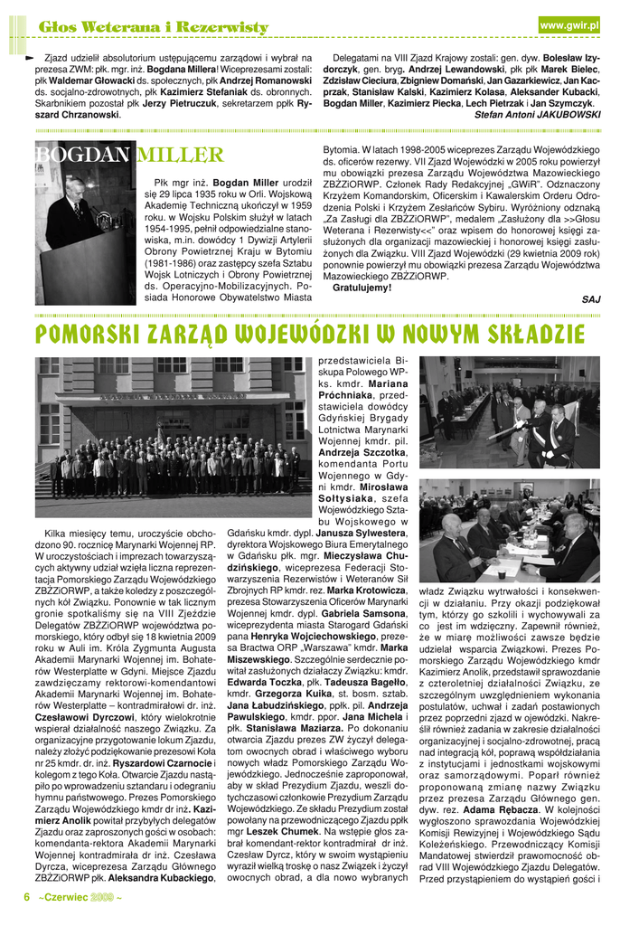 G³os Weterana i Rezerwisty www.gwir.pl Zjazd udzielił absolutorium ustępującemu zarządowi i wybrał na prezesa ZWM: płk. mgr. inż. Bogdana Millera! Wiceprezesami zostali: płk Waldemar Głowacki ds. społecznych, płk Andrzej Romanowski ds. socjalno-zdrowotnych, płk Kazimierz Stefaniak ds. obronnych. Skarbnikiem pozostał płk Jerzy Pietruczuk, sekretarzem ppłk Ryszard Chrzanowski. Delegatami na VIII Zjazd Krajowy zostali: gen. dyw. Bolesław Izydorczyk, gen. bryg. Andrzej Lewandowski, płk płk Marek Bielec, Zdzisław Cieciura, Zbigniew Domański, Jan Gazarkiewicz, Jan Kacprzak, Stanisław Kalski, Kazimierz Kolasa, Aleksander Kubacki, Bogdan Miller, Kazimierz Piecka, Lech Pietrzak i Jan Szymczyk. Stefan Antoni JAKUBOWSKI BOGDAN MILLER Bytomia. W latach 1998-2005 wiceprezes Zarządu Wojewódzkiego ds. oficerów rezerwy. VII Zjazd Wojewódzki w 2005 roku powierzył mu obowiązki prezesa Zarządu Województwa Mazowieckiego ZBŻZiORWP. Członek Rady Redakcyjnej „GWiR”. Odznaczony Krzyżem Komandorskim, Oficerskim i Kawalerskim Orderu Odrodzenia Polski i Krzyżem Zesłańców Sybiru. Wyróżniony odznaką „Za Zasługi dla ZBŻZiORWP”, medalem „Zasłużony dla >>Głosu Weterana i Rezerwisty<<” oraz wpisem do honorowej księgi zasłużonych dla organizacji mazowieckiej i honorowej księgi zasłużonych dla Związku. VIII Zjazd Wojewódzki (29 kwietnia 2009 rok) ponownie powierzył mu obowiązki prezesa Zarządu Województwa Mazowieckiego ZBŻZiORWP. Gratulujemy! SAJ Płk mgr inż. Bogdan Miller urodził się 29 lipca 1935 roku w Orli. Wojskową Akademię Techniczną ukończył w 1959 roku. w Wojsku Polskim służył w latach 1954-1995, pełnił odpowiedzialne stanowiska, m.in. dowódcy 1 Dywizji Artylerii Obrony Powietrznej Kraju w Bytomiu (1981-1986) oraz zastępcy szefa Sztabu Wojsk Lotniczych i Obrony Powietrznej ds. Operacyjno-Mobilizacyjnych. Posiada Honorowe Obywatelstwo miasta POMORSKI ZARZĄD WOJEWÓDZKI W NOWYM SKŁADZIE Kilka miesięcy temu, uroczyście obchodzono 90. rocznicę Marynarki Wojennej RP. W uroczystościach i imprezach towarzyszących aktywny udział wzięła liczna reprezentacja Pomorskiego Zarządu Wojewódzkiego ZBŻZiORWP, a także koledzy z poszczególnych kół Związku. Ponownie w tak licznym gronie spotkaliśmy się na VIII Zjeździe Delegatów ZBŻZiORWP województwa pomorskiego, który odbył się 18 kwietnia 2009 roku w Auli im. Króla Zygmunta Augusta Akademii Marynarki Wojennej im. Bohaterów Westerplatte w Gdyni. Miejsce Zjazdu zawdzięczamy rektorowi-komendantowi Akademii Marynarki Wojennej im. Bohaterów Westerplatte – kontradmirałowi dr. inż. Czesławowi Dyrczowi, który wielokrotnie wspierał działalność naszego Związku. Za organizacyjne przygotowanie lokum Zjazdu, należy złożyć podziękowanie prezesowi Koła nr 25 kmdr. dr. inż. Ryszardowi Czarnocie i kolegom z tego Koła. Otwarcie Zjazdu nastąpiło po wprowadzeniu sztandaru i odegraniu hymnu państwowego. Prezes Pomorskiego Zarządu Wojewódzkiego kmdr dr inż. Kazimierz Anolik powitał przybyłych delegatów Zjazdu oraz zaproszonych gości w osobach: komendanta-rektora Akademii Marynarki Wojennej kontradmirała dr inż. Czesława Dyrcza, wiceprezesa Zarządu Głównego ZBŻZiORWP płk. Aleksandra Kubackiego, ~Czerwiec 2009 ~ przedstawiciela Biskupa Polowego WPks. kmdr. Mariana Próchniaka, przedstawiciela dowódcy Gdyńskiej Brygady Lotnictwa Marynarki Wojennej kmdr. pil. Andrzeja Szczotka, komendanta Portu Wojennego w Gdyni kmdr. Mirosława Sołtysiaka, szefa Wojewódzkiego Sztabu Wojskowego w Gdańsku kmdr. dypl. Janusza Sylwestera, dyrektora Wojskowego Biura Emerytalnego w Gdańsku płk. mgr. Mieczysława Chudzińskiego, wiceprezesa Federacji Stowarzyszenia Rezerwistów i Weteranów Sił Zbrojnych RP kmdr. rez. Marka Krotowicza, prezesa Stowarzyszenia Oficerów Marynarki Wojennej kmdr. dypl. Gabriela Samsona, wiceprezydenta miasta Starogard Gdański pana Henryka Wojciechowskiego, prezesa Bractwa ORP „Warszawa” kmdr. Marka Miszewskiego. Szczególnie serdecznie powitał zasłużonych działaczy Związku: kmdr. Edwarda Toczka, płk. Tadeusza Bagełło, kmdr. Grzegorza Kuika, st. bosm. sztab. Jana Łabudzińskiego, ppłk. pil. Andrzeja Pawulskiego, kmdr. ppor. Jana Michela i płk. Stanisława Maziarza. Po dokonaniu otwarcia Zjazdu prezes ZW życzył delegatom owocnych obrad i właściwego wyboru nowych władz Pomorskiego Zarządu Wojewódzkiego. Jednocześnie zaproponował, aby w skład Prezydium Zjazdu, weszli dotychczasowi członkowie Prezydium Zarządu Wojewódzkiego. Ze składu Prezydium został powołany na przewodniczącego Zjazdu ppłk mgr Leszek Chumek. Na wstępie głos zabrał komendant-rektor kontradmirał dr inż. Czesław Dyrcz, który w swoim wystąpieniu wyraził wielką troskę o nasz Związek i życzył owocnych obrad, a dla nowo wybranych władz Związku wytrwałości i konsekwencji w działaniu. Przy okazji podziękował tym, którzy go szkolili i wychowywali za co jest im wdzięczny. Zapewnił również, że w miarę możliwości zawsze będzie udzielał wsparcia Związkowi. Prezes Pomorskiego Zarządu Wojewódzkiego kmdr Kazimierz Anolik, przedstawił sprawozdanie z czteroletniej działalności Związku, ze szczególnym uwzględnieniem wykonania postulatów, uchwał i zadań postawionych przez poprzedni zjazd w ojewódzki. Nakreślił również zadania w zakresie działalności organizacyjnej i socjalno-zdrowotnej, pracą nad integracją kół, poprawą współdziałania z instytucjami i jednostkami wojskowymi oraz samorządowymi. Poparł również proponowaną zmianę nazwy Związku przez prezesa Zarządu Głównego gen. dyw. rez. Adama Rębacza. W kolejności wygłoszono sprawozdania Wojewódzkiej Komisji Rewizyjnej i Wojewódzkiego Sądu Koleżeńskiego. Przewodniczący Komisji Mandatowej stwierdził prawomocność obrad VIII Wojewódzkiego Zjazdu Delegatów. Przed przystąpieniem do wystąpień gości i