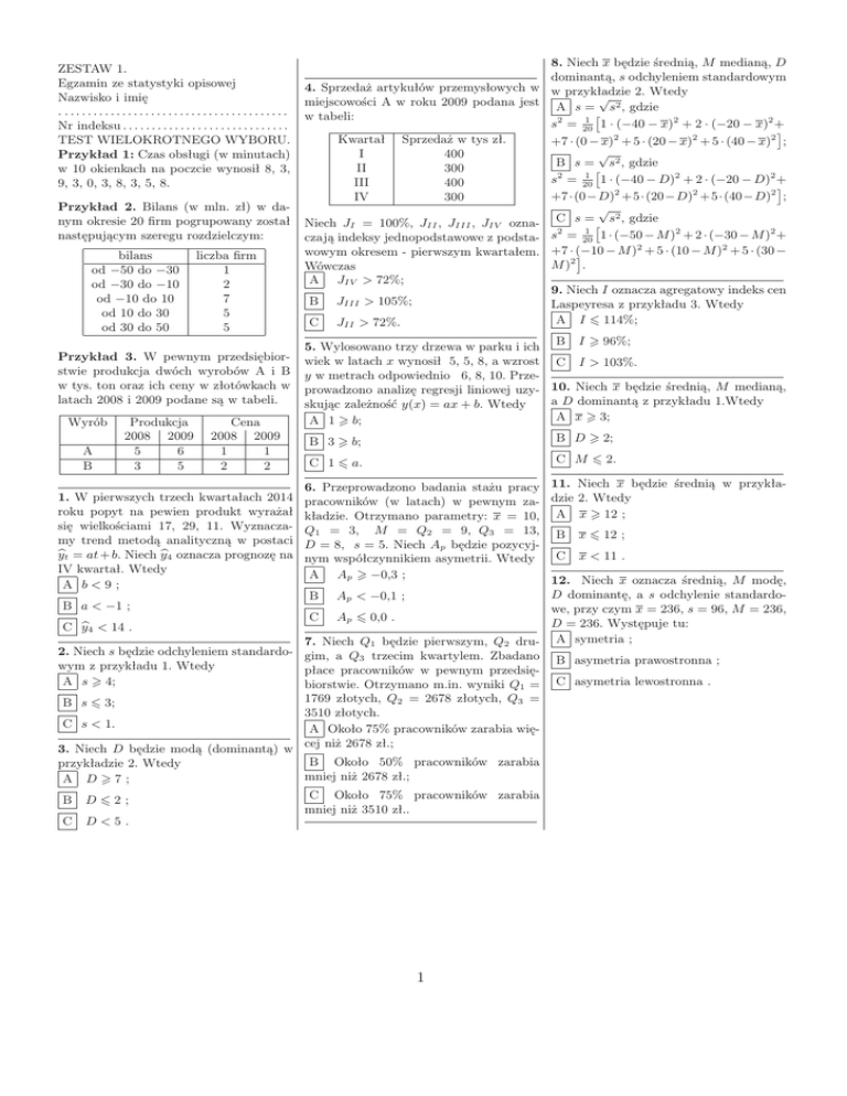 ZESTAW 1. Egzamin ze statystyki opisowej Nazwisko i imię . ....................................... Nr indeksu . . . . . . . . . . . . . . . . . . . . . . . . . . . . . TEST WIELOKROTNEGO WYBORU. Przykład 1: Czas obsługi (w minutach) w 10 okienkach na poczcie wynosił 8, 3, 9, 3, 0, 3, 8, 3, 5, 8. Przykład 2. Bilans (w mln. zł) w danym okresie 20 firm pogrupowany został następującym szeregu rozdzielczym: bilans od −50 do −30 od −30 do −10 od −10 do 10 od 10 do 30 od 30 do 50 liczba firm 1 2 7 5 5 Przykład 3. W pewnym przedsiębiorstwie produkcja dwóch wyrobów A i B w tys. ton oraz ich ceny w złotówkach w latach 2008 i 2009 podane są w tabeli. Wyrób A B Produkcja 2008 2009 5 6 3 5 Cena 2008 2009 1 1 2 2 4. Sprzedaż artykułów przemysłowych w miejscowości A w roku 2009 podana jest w tabeli: Kwartał I II III IV Sprzedaż w tys zł. 400 300 400 300 Niech JI = 100%, JII , JIII , JIV oznaczają indeksy jednopodstawowe z podstawowym okresem - pierwszym kwartałem. Wówczas A JIV > 72%; B JIII > 105%; C JII > 72%. 8. Niech x będzie średnią, M medianą, D dominantą, s odchyleniem standardowym w przykładzie 2. Wtedy √ A s = s2 , gdzie 1 s2 = 20 1 · (−40 − x)2 + 2 · (−20 − x)2 + +7 · (0 − x)2 + 5 · (20 − x)2 + 5 · (40 − x)2 ; √ B s = s2 , gdzie 1 s2 = 20 1 · (−40 − D)2 + 2 · (−20 − D)2 + +7·(0−D)2 +5·(20−D)2 +5·(40−D)2 ; √ C s = s2 , gdzie 1 1 · (−50 − M )2 + 2 · (−30 − M )2 + s2 = 20 +7 · (−10 − M )2 + 5 · (10 − M )2 + 5 · (30 − M )2 . 9. Niech I oznacza agregatowy indeks cen Laspeyresa z przykładu 3. Wtedy A I ¬ 114%; 5. Wylosowano trzy drzewa w parku i ich B I 96%; wiek w latach x wynosił 5, 5, 8, a wzrost C I > 103%. y w metrach odpowiednio 6, 8, 10. Przeprowadzono analizę regresji liniowej uzy- 10. Niech x będzie średnią, M medianą, a D dominantą z przykładu 1.Wtedy skując zależność y(x) = ax + b. Wtedy A x 3; A 1 b; B D 2; B 3 b; C M ¬ 2. C 1 ¬ a. 6. Przeprowadzono badania stażu pracy 11. Niech x będzie średnią w przykłapracowników (w latach) w pewnym za- dzie 2. Wtedy kładzie. Otrzymano parametry: x = 10, A x 12 ; Q1 = 3, M = Q2 = 9, Q3 = 13, B x ¬ 12 ; D = 8, s = 5. Niech Ap będzie pozycyjC x < 11 . nym współczynnikiem asymetrii. Wtedy A Ap −0,3 ; 12. Niech x oznacza średnią, M modę, D dominantę, a s odchylenie standardoB Ap < −0,1 ; B a < −1 ; we, przy czym x = 236, s = 96, M = 236, C Ap ¬ 0,0 . D = 236. Występuje tu: C yb4 < 14 . 7. Niech Q1 będzie pierwszym, Q2 dru- A symetria ; 2. Niech s będzie odchyleniem standardo- gim, a Q3 trzecim kwartylem. Zbadano B asymetria prawostronna ; wym z przykładu 1. Wtedy płace pracowników w pewnym przedsięA s 4; biorstwie. Otrzymano m.in. wyniki Q1 = C asymetria lewostronna . 1769 złotych, Q2 = 2678 złotych, Q3 = B s ¬ 3; 3510 złotych. C s < 1. A Około 75% pracowników zarabia więcej niż 2678 zł.; 3. Niech D będzie modą (dominantą) w B Około 50% pracowników zarabia przykładzie 2. Wtedy mniej niż 2678 zł.; A D7; C Około 75% pracowników zarabia B D¬2; mniej niż 3510 zł.. C D<5. 1. W pierwszych trzech kwartałach 2014 roku popyt na pewien produkt wyrażał się wielkościami 17, 29, 11. Wyznaczamy trend metodą analityczną w postaci ybt = at + b. Niech yb4 oznacza prognozę na IV kwartał. Wtedy A b<9; 1