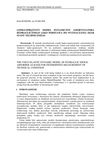 ZESZYTY NAUKOWE POLITECHNIKI ŚLĄSKIEJ Seria: TRANSPORT z. 66 2010 Nr kol. 1825 Rafał BURDZIK, Jan WARCZEK LEPKO-SPRĘśYSTY MODEL DYNAMICZNY AMORTYZATORA HYDRAULICZNEGO JAKO PODSTAWA DO WYZNACZANIA MIAR STANU TECHNICZNEGO Streszczenie. W artykule przedstawiono wyniki badań amortyzatorów samochodowych przeprowadzonych na stanowisku indykatorowym. Celem tych badań było wyznaczenie ich własności lepko-spręŜystych. Na tej podstawie zaproponowano strukturę modelu symulacyjnego, który został wdroŜony w środowisku badań symulacyjnych Matlab/Simulink. Uzyskane wyniki badań symulacyjnych wykazują zgodność z rzeczywistym amortyzatorem w określonym przedziale zgodności, wynikającym z moŜliwości pomiarowych stanowiska. THE VISCO-ELASTIC DYNAMIC MODEL OF HYDRAULIC SHOCKABSORBER AS BASIS FOR DETERMINING MEASUREMENT OF TECHNICAL CONDITION Summary. As part of the work being studied as a car shock-absorber on indicatory stand. The aim of research has been evaluation of the visco-elastic properties. On this basis, the proposed structure of the simulation model. The model has been implemented in an environment of simulation studies Matlab/Simulink. The results of simulation tests show compliance with the real shock-absorber. Conformance is a specified period of relevance arising from the possibility of measuring the stand. 1. WPROWADZENIE Określanie stanu technicznego maszyny lub urządzenia bardzo często wymusza konieczność korzystania z obszernych baz danych. Gromadzenie informacji diagnostycznej w czasie eksperymentów na obiektach rzeczywistych jest czasochłonne i bardzo kosztowne. Alternatywną procedurą jest przeprowadzanie eksperymentów symulacyjnych na modelach matematycznych. W takim przypadku niezbędnym warunkiem jest wykorzystanie szczegółowego modelu, który w jak najlepszym stopniu odzwierciedla rzeczywistość. Diagnostyka według modelu otwiera ogromne moŜliwości. Ocena bieŜącego stanu technicznego oraz analiza przyszłego rozwoju uszkodzenia pozwalają na zastosowanie skutecznych środków zaradczych, które umoŜliwiają uniknąć awarii. Ogromną zaletą posiadania takiej wiedzy jest równieŜ moŜliwość optymalnego sterowania czasem eksploatacji [3]. Celem badań było opracowanie modelu dynamicznego amortyzatora samochodowego uwzględniającego jego cechy, takie jak nieliniowość i niesymetryczność charakterystyki oraz jej zaleŜność od parametrów wymuszenia. Uwzględnienie wpływu wymienionych czynników na chwilowe wartości siły, generowanej w amortyzatorze umoŜliwia jego wykorzystanie do wyznaczania miar stanu technicznego. 6 R. Burdzik, J. Warczek 2. MODELOWANIE AMORTYZATORÓW SAMOCHODOWYCH Powszechnie stosowanym sposobem modelowania charakterystyki tłumienia jest przyjmowanie jednoznaczności, pomiędzy chwilową wartością siły generowanej przez amortyzator do chwilowej wartości prędkości ruchu względnego tłoczka i obudowy amortyzatora [7]. Przyjęte załoŜenie nasuwa wniosek, Ŝe amortyzator samochodowy jest elementem o tłumieniu wiskotycznym, a siła oporu ruchu w kaŜdych warunkach zaleŜy jedynie od prędkości wymuszenia. Stanowi to powaŜne ograniczenie poprawności takich modeli dynamicznych amortyzatora do zakresu wymuszeń niskoczęstotliwościowych, których wartość nie przekracza 0,5 Hz. Dla takich wymuszeń nie występują zjawiska pozornej sztywności amortyzatora oraz pomijalny jest efekt wpływu amplitudy skoku wymuszenia na kształt charakterystyki tłumienia. Rys. 1. Zbiór wykresów pracy amortyzatora, uzyskany dla róŜnych częstotliwości wymuszeń Fig. 1. The set of graphs obtained damper work for different frequencies extortion Rys. 2. Wykresy prędkościowe amortyzatora Fig. 2. Graphs of shock-absorber characteristics of damping force Lepko-spręŜysty model dynamiczny amortyzatora... 7 W przypadku analizy dynamiki amortyzatora w zakresie wyŜszych częstotliwości wymuszeń wpływ wyŜej wymienionych parametrów jest znaczący. Zjawisko pozornej sztywności amortyzatora, badanego na stanowisku indykatorowym, obrazują rys. 1 i 2, na których przedstawiono zbiór wykresów pracy amortyzatora oraz odpowiadające im wykresy prędkościowe. Im wyŜsza częstotliwość wymuszenia, tym większa jest wartość pozornej sztywności, co moŜna zaobserwować na wykresach prędkościowych w postaci powiększania się ich szerokości w pobliŜu zerowej prędkości wymuszenia. Tak więc siła generowana przez amortyzator jest sumą dwóch składowych - tłumienia i pozornej sztywności [1]. Kolejny aspekt rozpatrywania poprawności modeli obliczeniowych amortyzatorów to zjawisko wpływu długości skoku wymuszenia na kształt charakterystyki tłumienia. W przypadku wymuszenia sinusoidalnego maksymalną prędkość ruchu posuwisto-zwrotnego tłoczka amortyzatora uzyskujemy zawsze w chwili, dla której wartość przemieszczenia jest równa zeru, przy załoŜeniu, Ŝe początek układu współrzędnych jest umieszczony w połowie długości skoku roboczego. Określoną, maksymalną wartość prędkości wymuszenia moŜna uzyskać na dwa sposoby – zwiększając długość skoku roboczego dla stałej częstotliwości wymuszenia lub przy stałej długości skoku zmieniając częstotliwość wymuszenia. W literaturze moŜna spotkać się z tezą, iŜ niezaleŜnie od przyjętej metody uzyskania danej prędkości maksymalnej wymuszenia, odpowiedź amortyzatora będzie zawsze taka sama. Jest to słuszne załoŜenie przy spełnieniu warunku małych częstotliwości wymuszeń. W rzeczywistych warunkach ruchu pojazdu występują drgania z szerokiego zakresu częstotliwości, a prędkości ruchu tłoczka amortyzatora rzędu kilku m/s występują zarówno dla długich, jak i krótkich skoków roboczych. Z tego względu celowe jest rozpatrywanie charakterystyki tłumienia amortyzatora jako funkcji dwuargumentowej [2, 4]. W opracowywanym modelu przyjęto następujące załoŜenia: - uwzględnienie sztywności pozornej am
