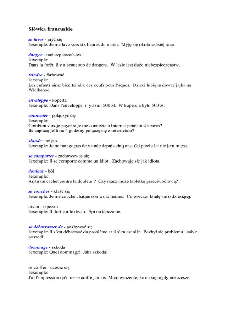 Słówka francuskie se laver - myć się l'exemple: Je me lave vers six heures du matin. Myję się około szóstej rano. danger - niebezpieczeństwo l'exemple: Dans la forêt, il y a beaucoup de dangers. W lesie jest dużo niebezpieczeństw. teindre - farbować l'exemple: Les enfants aime bien teindre des oeufs pour Pâques. Dzieci lubią malować jajka na Wielkanoc. enveloppe - koperta l'exemple: Dans l'enveloppe, il y avait 500 zł. W kopercie było 500 zł. connecter - połączyć się l'exemple: Combien vais-je payer si je me connecte à Internet pendant 4 heures? Ile zapłacę jeśli na 4 godziny połączę się z internetem? viande - mięso l'exemple: Je ne mange pas de viande depuis cinq ans. Od pięciu lat nie jem mięsa. se comporter - zachowywać się l'exemple: Il se comporte comme un idiot. Zachowuje się jak idiota. douleur - ból l'exemple: As-tu un cachet contre la douleur ? Czy masz może tabletkę przeciwbólową? se coucher - kłaść się l'exemple: Je me couche chaque soir a dix heures. Co wieczór kładę się o dziesiątej. divan - tapczan l'exemple: Il dort sur le divan. Śpi na tapczanie. se débarrasser de - pozbywać się l'exemple: Il s’est débarrasé du problème et il s’en est allé. Pozbył się problemu i sobie poszedł. dommage - szkoda l'exemple: Quel dommage! Jaka szkoda! se coiffer - czesać się l'exemple: J'ai l'impression qu'il ne se coiffe jamais. Mam wrażenie, że on się nigdy nie czesze. mobilité - ruchliwość l'exemple: Dans la vie professionnelle, la mobilité est très importante. W życiu zawodowym mobilność jest bardzo ważna. se baigner - kąpać się l'exemple: On ne peut pas se baigner dans ce lac. W tym jeziorze nie można się kąpać. négligence - niedbalstwo l'exemple: Qui est responsable de cette négligence? Kto jest odpowiedzialny za to niedbalstwo? se déconnecter - przerwać połączenie l'exemple: Quand quelqu’un m’appelle, l’internet sur mon ordinateur se déconnecte. Kiedy ktoś do mnie dzwoni, internet ma moim komputerze się rozłącza. nécessité - konieczność l'exemple: La paix est une nécessité pour le monde. Pokój jest konieczny dla świata. se dépècher - spieszyć się l'exemple: Nous devons nous dépecher, il est tard. Musimy się spieszyć, jest późno. neveu - siostrzeniec, bratanek l'exemple: Aujourd'hui, c'est l'anniversaire de mon neuveu. Mój siostrzeniec ma dziś urodziny se blesser - kaleczyć się l'exemple: Il s’est blessé très grièvement pendant le voyage. Podczas podróży bardzo poważnie się skaleczył. odorat - węch l'exemple: L’odorat est un des cinq sens. Węch jest jednym z pięciu zmysłów. route - droga l'exemple: Où mène cette route? Dokąd wiedzie ta droga? avoir - mieć l'exemple: J'ai un petit chien. Mam małego pieska. rouge à lèvres - szminka l'exemple: Les tâches de rouge à levres sont difficiles à enlever. Plamy ze szminki jest trudno wywabić. séparer - rozdzielać l'exemple: Il faut séparer ces deux questions. Należy rozdzielić te dwie kwestie. renseignement - informacja l'exemple: Pouvez-vous me fournir des renseignements? Czy może Pan mi udzielić informacji? soutenir - podtrzymywać; twierdzić; bronić l'exemple: Pierre soutient les communistes depuis 10 ans. Pierre od 10 lat wspiera komunistów. rhume - katar l'exemple: Depuis quelques jours, j'ai le rhume. Od kilku dni mam katar. approuver - pochwalać, uznawać l'exemple: Edouard n’approuve pas le choix de sa fille. Edouard nie pochwala wyboru córki. robe - sukienka l'exemple: Pour cette fête je vais acheter une nouvelle robe. Na tę imprezę kupię sobie nową sukienkę. abîmer - psuć l'exemple: Les petits enfants abîment vite les jouets. Małe dzieci szybko niszczą zabawki.