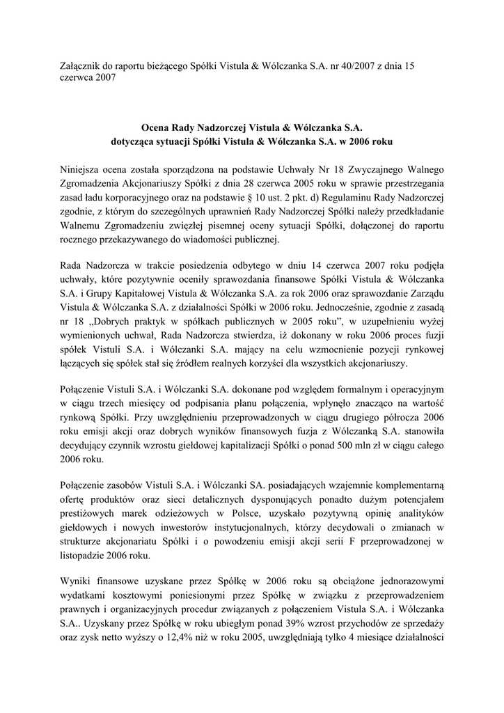 Załącznik do raportu bieŜącego Spółki Vistula & Wólczanka S.A. nr 40/2007 z dnia 15 czerwca 2007 Ocena Rady Nadzorczej Vistula & Wólczanka S.A. dotycząca sytuacji Spółki Vistula & Wólczanka S.A. w 2006 roku Niniejsza ocena została sporządzona na podstawie Uchwały Nr 18 Zwyczajnego Walnego Zgromadzenia Akcjonariuszy Spółki z dnia 28 czerwca 2005 roku w sprawie przestrzegania zasad ładu korporacyjnego oraz na podstawie § 10 ust. 2 pkt. d) Regulaminu Rady Nadzorczej zgodnie, z którym do szczególnych uprawnień Rady Nadzorczej Spółki naleŜy przedkładanie Walnemu Zgromadzeniu zwięzłej pisemnej oceny sytuacji Spółki, dołączonej do raportu rocznego przekazywanego do wiadomości publicznej. Rada Nadzorcza w trakcie posiedzenia odbytego w dniu 14 czerwca 2007 roku podjęła uchwały, które pozytywnie oceniły sprawozdania finansowe Spółki Vistula & Wólczanka S.A. i Grupy Kapitałowej Vistula & Wólczanka S.A. za rok 2006 oraz sprawozdanie Zarządu Vistula & Wólczanka S.A. z działalności Spółki w 2006 roku. Jednocześnie, zgodnie z zasadą nr 18 „Dobrych praktyk w spółkach publicznych w 2005 roku”, w uzupełnieniu wyŜej wymienionych uchwał, Rada Nadzorcza stwierdza, iŜ dokonany w roku 2006 proces fuzji spółek Vistuli S.A. i Wólczanki S.A. mający na celu wzmocnienie pozycji rynkowej łączących się spółek stał się źródłem realnych korzyści dla wszystkich akcjonariuszy. Połączenie Vistuli S.A. i Wólczanki S.A. dokonane pod względem formalnym i operacyjnym w ciągu trzech miesięcy od podpisania planu połączenia, wpłynęło znacząco na wartość rynkową Spółki. Przy uwzględnieniu przeprowadzonych w ciągu drugiego półrocza 2006 roku emisji akcji oraz dobrych wyników finansowych fuzja z Wólczanką S.A. stanowiła decydujący czynnik wzrostu giełdowej kapitalizacji Spółki o ponad 500 mln zł w ciągu całego 2006 roku. Połączenie zasobów Vistuli S.A. i Wólczanki SA. posiadających wzajemnie komplementarną ofertę produktów oraz sieci detalicznych dysponujących ponadto duŜym potencjałem prestiŜowych marek odzieŜowych w Polsce, uzyskało pozytywną opinię analityków giełdowych i nowych inwestorów instytucjonalnych, którzy decydowali o zmianach w strukturze akcjonariatu Spółki i o powodzeniu emisji akcji serii F przeprowadzonej w listopadzie 2006 roku. Wyniki finansowe uzyskane przez Spółkę w 2006 roku są obciąŜone jednorazowymi wydatkami kosztowymi poniesionymi przez Spółkę w związku z przeprowadzeniem prawnych i organizacyjnych procedur związanych z połączeniem Vistula S.A. i Wólczanka S.A.. Uzyskany przez Spółkę w roku ubiegłym ponad 39% wzrost przychodów ze sprzedaŜy oraz zysk netto wyŜszy o 12,4% niŜ w roku 2005, uwzględniają tylko 4 miesiące działalności Spółki po połączeniu z Wólczanką S.A. i nie odzwierciedlają w pełni wszystkich efektów synergii operacyjnych i finansowych wynikających z połączenia, których naleŜy oczekiwać w ciągu dwóch najbliŜszych lat. Przychody ze sprzedaŜy uzyskane w 2006 roku w konsekwentnie rozwijanej sieci sklepów firmowych, potwierdziły systematyczny od kilku lat wzrost udziału sieci detalicznej w strukturze przychodów oraz poprawę efektywności jej działania wyraŜoną rosnącym poziomem realizowanych marŜ handlowych. Rozwijane z powodzeniem kompetencje Spółki w zakresie dystrybucji detalicznej i zarządzania markami, skłoniły zarząd do podjęcia w drugiej połowie 2006 roku decyzji o dokonaniu inwestycji w przejęcie spółki Galeria Centrum Sp. z o.o., dysponującej znanymi na rynku polskim markami w segmencie ekonomicznym oraz multibrandowymi sklepami odzieŜowymi o duŜych powierzchniach sprzedaŜowych, umoŜliwiających wdraŜanie nowoczesnych konceptów handlowych. Inwestycja w zakup udziałów Galerii Centrum Sp. z o.o. stanowi dla Spółki pierwszy powaŜny krok na drodze znaczącego zwiększenia udziałów w polskim rynku odzieŜowym poza tradycyjnym segmentem formalnej mody męskiej. Obok rozszerzania oferty casualowej marek Vistula i Wólczanka, marka Galerii Centrum wraz z jej strukturami detalicznymi ma umoŜliwić pozyskanie nowych klientów w masowym segmencie mody damskiej i męskiej przeznaczonej dla klienta mniej zamoŜnego, ale wraŜliwego na zmieniające się trendy w modzie i oczekującego wysokiej jakości. W świetle przytoczonych powyŜej faktów, Rada Nadzorcza pozytywnie ocenia sytuację Spółki i rezultaty jej działalności w roku 2006, a wyniki osiągnięte przez Spółkę w pierwszym kwartale roku bieŜącego traktuje jako zapowiedź skutecznej realizacji dalszych korzyści dla akcjonariuszy zapowiadanych przez zarząd w planie połączenia z Wólczanką S.A. oraz w uzasadnieniu decyzji o zakupie udziałów w Galerii Centrum Sp. z o.o.