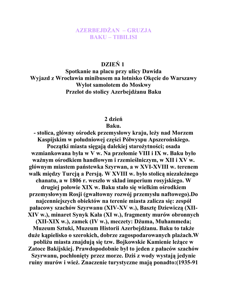 AZERBEJDŻAN – GRUZJA BAKU – TIBILISI DZIEŃ 1 Spotkanie na placu przy ulicy Dawida Wyjazd z Wrocławia minibusem na lotnisko Okęcie do Warszawy Wylot samolotem do Moskwy Przelot do stolicy Azerbejdżanu Baku 2 dzień Baku. - stolica, główny ośrodek przemysłowy kraju, leży nad Morzem Kaspijskim w południowej części Półwyspu Apszerońskiego. Początki miasta sięgają dalekiej starożytności; osada wzmiankowana była w V w. Na przełomie VIII i IX w. Baku było ważnym ośrodkiem handlowym i rzemieślniczym, w XII i XV w. głównym miastem państewka Szyrwan, a w XVI-XVIII w. terenem walk między Turcją a Persją. W XVIII w. było stolicą niezależnego chanatu, a w 1806 r. weszło w skład imperium rosyjskiego. W drugiej połowie XIX w. Baku stało się wielkim ośrodkiem przemysłowym Rosji (gwałtowny rozwój przemysłu naftowego).Do najcenniejszych obiektów na terenie miasta zalicza się: zespół pałacowy szachów Szyrwanu (XIV-XV w.), Basztę Dziewiczą (XIIXIV w.), minaret Synyk Kała (XI w.), fragmenty murów obronnych (XII-XIX w.), zamek (IV w.), meczety: Dżuma, Muhammeda; Muzeum Sztuki, Muzeum Historii Azerbejdżanu. Baku to także duże kąpielisko o szerokich, dobrze zagospodarowanych plażach.W pobliżu miasta znajdują się tzw. Bojkowskie Kamienie leżące w Zatoce Bakijskiej. Prawdopodobnie był to jeden z pałaców szachów Szyrwanu, pochłonięty przez morze. Dziś z wody wystają jedynie ruiny murów i wież. Znaczenie turystyczne mają ponadto:(1935-91 r. — miasto w zachodniej części kraju nad rzeką Giandżaczaj w dorzeczu Kury. Założone zostało w V-VI w. W X-XIII w. było jednym z największych handlowych i rzemieślniczych ośrodków Azerbejdżanu. W XVIII w. miasto stało się stolicą chanatu Gandży, a w 1804 r. zostało przyłączone do Rosji.Na uwagę zasługują liczne obiekty zabytkowe: resztki murów, mostów i twierdzy (XVII-XVIII w.), meczet (XVII w.), mauzoleum Imamzade (XIV-XVII w.). Okolice Giandży słyną z winnic i sadów. Dzień 3 QOBUSTAN Wyjazd do oddalonego o 60 km od Banu, rezerwatu Qobustan.Podrodze będziemymieli okazję zobaczyć pola naftowe na lądzie i wodzie (na jednym z pól naftowych kręcono sceny do J.Bonda) oraz ich „subtelny” wpływ na środowisko naturalne. Teren rezerwatu to pustynia z ciekawymi formami – przypomina krajobraz księżyca. Na terenie rezerwatu znajduje się muzeum i petroglify z okresu kamienia (UNESCO). Formy geologiczne powstałe na skutek wylewania się błota wypychanego gazem ziemnym unikat na skalę światową i nr 1 wśród okolicznych atrakcji. Ostatnia erupcja miała miejsce w lutym 2010. Wulkany rozsiane na odcinku 100 kilometrów przyjmują rozmiary od małych otworów w ziemi po 500 metrowe góry. Gobustan to unikalny na świecie rezerwat, odkryty dopiero w latach 1930. Na jego księżycowy charakter składają się oryginalne formacje wapienne, wśród których znajduje się ok. 300 błotnych wulkanów osiągających max. kilka metrów wysokości. Największą atrakcją turystyczną Gobustanu są wielkie ilości (ponad pół miliona) petroglifów: głęboko wyrytych w skale rysunków, z których najstarsze pochodzą z XII w. p.n.e. Przedstawiają one sylwetki ludzi, zwierząt, tańców rytualnych, lodzi, wojowników z bronią, karawan wielbłądów Dzień 4 SURAKHANI - ATESHGAH Całodniowa wycieczka do miejscowości , wioski położonej na obrzeżach Baku. Surakhani było jednym z pierwszych centrów przemysłu naftowego w Azerbejdżanie. Tutaj została zbudowana pierwsza rafineria na terenach rosyjskich w 1859r. Wizyta w świątyni Ateshgah, która jest miejscem kultu czcicieli ognia zaratusztrian. Zaratusztrianizm to jedna z najstarszych i wciąż mająca wyznawców na świecie religii monoteistycznych. Została założona przez Zoroastera (inaczej Zaratusztra; wsp. pers. Zartoszt / ) زرتشت Zaratusztra żył około roku 1400 - 1200 p.n.e na terenie północnowschodniego Iranu i Turkmenii. Był on jednym z wielu kapłanów wiary staroirańskiej, zwanej mazdaizmem od głównego boga występującego w panteonie tej religii o nazwie Mazda. Religia ta jest typową religią politeistyczną, podobną do np. wierzeń starożytnych Greków. Muzułmanie nazywają jej wyznawców czcicielami ognia. Zaratusztrianizm był religią państwową w pięciu kolejnych imperiach istniejących na terenie współczesnego Iranu i Iraku - państwie Achemenidów, Partów (Arsacydów) oraz Sasanidów. Miał bardzo silny wpływ na inne religie - judaizm i poprzez judaizm na chrześcijaństwo oraz islam DZIEŃ 5 Nachiczewan - kraj mauzoleów, księżycowych widoków, pełen uroku Jest taki obszar w Azji położony w Azerbejdżanie, którego jest autonomiczną częścią a jednocześnie całkowicie odcięty od świata to właśnie Nachiczewan. Tu nie ma autostrad, miast pełnych zdobyczy cywilizacji, turystów. To kraina pełna górskich wierzchołków, gościnnych Azerów. A także miejsce gdzie stykają się kultury wrogich sobie Ormian i Azerów a także muzułmanów i chrześcijan. Nachiczewan - jest jednym z najstarszych miast na Kaukazie. W XII w. był stolicą emiratu Eldigiżydów, a w XVIII i na początku XIX w. chanatu nachiczewańskiego. W 1828 r. został przyłączony do Rosji. Na terenie miasta zachowały się: twierdza (X-XIV w.), mauzolea: Jusufa (XII w.), Mumine-chatum (XII w.); zespół meczetów i mauzoleów (XVIII w.), meczet (XIX w.).Surachany — jest niewielką osadą niedaleko Baku, z dobrze zachowanym klasztorem hinduskim i świątynią czcicieli ognia "Ateszga" (XVIII w.). DZIEŃ 6 Zwiedzamy dalej Baku Wieża Dziewic Wieża Dziewic znajduje się w starym mieście w Baku. Powstała w XII wieku, ale nabudowana została najprawdopodobniej na struktury z VII-VI stulecia p.n.e. Istnieje kilka wyjaśnień jej nazwy: - legenda o dziewicy, która rzuciła się z wieży do morza - wieża poświęcona została boginii dziewic Ani, występującej w mitologii kaukaskiej i środkow