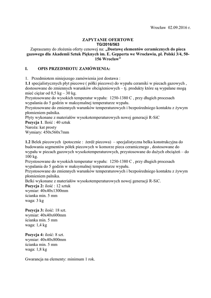 Wrocław 02.09.2016 r. ZAPYTANIE OFERTOWE TG/2016/563 Zapraszamy do złożenia oferty cenowej na: „Dostawę elementów ceramicznych do pieca gazowego dla Akademii Sztuk Pięknych im. E. Gepperta we Wrocławiu, pl. Polski 3/4, 50156 Wrocław” I. OPIS PRZEDMIOTU ZAMÓWIENIA: 1. Przedmiotem niniejszego zamówienia jest dostawa : 1.1 specjalistycznych płyt piecowe ( półki piecowe) do wypału ceramiki w piecach gazowych , dostosowane do zmiennych warunków obciążeniowych – tj. produkty które są wypalane mogą mieć ciężar od 0,5 kg – 30 kg. Przystosowane do wysokich temperatur wypału: 1250-1380 C , przy długich procesach wypalania do 5 godzin w maksymalnej temperaturze wypału. Przystosowane do zmiennych warunków temperaturowych i bezpośredniego kontaktu z żywym płomieniem palnika. Płyty wykonane z materiałów wysokotemperaturowych nowej generacji R-SiC Pozycja 1. Ilość : 40 sztuk Naroża: kat prosty Wymiary: 450x560x7mm 1.2 Belek piecowych (potocznie : żerdź piecowa) – specjalistyczna belka konstrukcyjna do budowania segmentów półek piecowych w komorze pieca ceramicznego , dostosowane do wypału w piecach gazowych wysokotemperaturowych, przystosowane do dużych obciążeń – do 100 kg. Przystosowane do wysokich temperatur wypału: 1250-1380 C , przy długich procesach wypalania do 5 godzin w maksymalnej temperaturze wypału. Przystosowane do zmiennych warunków temperaturowych i bezpośredniego kontaktu z żywym płomieniem palnika. Belki wykonane z materiałów wysokotemperaturowych nowej generacji R-SiC. Pozycja 2: ilość : 12 sztuk wymiar: 40x40x1300mm ścianka min. 5 mm waga: 3 kg Pozycja 3: ilość: 18 szt. wymiar: 40x40x600mm ścianka min. 5 mm waga: 1,4 kg Pozycja 4: ilość: 8 szt. wymiar: 40x40x800mm ścianka min. 5 mm waga: 1,8 kg Gwarancja na elementy: minimum 1 rok. 2. Wykonawca jest zobowiązany do pozyskania wszelkich informacji, które są niezbędne do przygotowania oferty. Koszty z tym związane ponosi Wykonawca. 3. Termin realizacji zamówienia do 20.10.2016r. II. OPIS WARUNKÓW UDZIAŁU W POSTĘPOWANIU O udzielenie zamówienia może ubiegać się Wykonawca: - posiadający niezbędną wiedzę i doświadczenie zapewniające wykonanie zamówienia - dysponujący potencjałem technicznym i osobami zdolnymi do wykonania zamówienia, - który złoży ofertę na formularzu oferty stanowiącym załącznik do niniejszego zapytania ofertowego wraz z dokumentem dopuszczającym do obrotu prawnego, zgodną ze wszystkimi wymogami oraz który te wymogi akceptuje oraz warunki gwarancji. Ocena spełniania przez Wykonawców w/w warunków dokonana będzie zgodnie z formułą spełnia/nie spełnia na podstawie złożonych przez Wykonawcę dokumentów. III. WARUNKI PŁATNOŚCI Opis w $ 5 umowy. IV. KRYTERIA OCENY OFERT 1. Zamawiający zastosuje następujące kryteria wyboru oferty: Cena – 90% i gwarancja – 10% Zamawiający udzieli zamówienia Wykonawcy, które spełni wszystkie wymogi Zamawiającego opisane w niniejszym zapytaniu ofertowym i przedstawi najniższą cenę. V. SPOSÓB ZŁOŻENIA OFERTY: 1. Ofertę należy złożyć na załączonym formularzu oferty (załącznik nr 1 do zapytania ofertowego) wraz z załączonymi warunkami gwarancyjnymi. 2. Cenę podaną w ofercie (brutto z VAT), należy określić z dokładnością do dwóch miejsc po przecinku w PLN. 3. Ceny podane w ofercie muszą obejmować wszystkie koszty związane z realizacją zamówienia. 4. Termin związania ofertą wynosi 21 dni. 5. Ofertę należy złożyć w formie elektronicznej ( skan wypełnionego formularza ofertowego) : [email protected] do dnia 06.09.2016 r. do godz. 12.00. 6. Osoby do kontaktu z Wykonawcami: a) Andrzej Jura – tel. 71 343 80 33 wew. 236 7. Zamawiający zastrzega sobie prawo do unieważnienia postępowania bez podania przyczyny. 8. Konsekwencje złożenia oferty niezgodnie z ww. wymogami ponosi Wykonawca ( np. potraktowanie oferty jako zwykłej korespondencji i nie dostarczenie jej na miejsce składania ofert w terminie określonym w punkcie 5. Oferty, które wpłyną po terminie określonym w pkt. 5 nie będą rozpatrywane. Akademia Sztuk Pięknych im. Eugeniusza Gepperta we Wrocławiu inż. Wojciech Orzechowski Załącznik nr 1 do zapytania TG/2016/563 FORMULARZ OFERTOWY ___________________ Pieczęć Wykonawcy I DANE WYKONAWCY NAZWA: SIEDZIBA: ul. _____________________________ kod ________ miejscowość _______________ NIP _______________ REGON TELEFON _____________ _________________ MAIL _________________ OSOBA DO KONTAKTÓW: Imię i nazwisko _______________________________ Tel. II PRZEDMIOT OFERTY Niniejszym, po zapoznaniu się zapytaniem ofertowym w trybie art.4 pkt. 8 ustawy PZP na: „Dostawa elementów ceramicznych do pieca gazowego dla Akademii Sztuk Pięknych im. E. Gepperta we Wrocławiu, pl. Polski 3/4, 50-156 Wrocław” składamy ofertę na realizację dostawy. III CENA Oświadczamy, że przedmiot zamówienia zobowiązujemy się wykonać w zakresie ustalonym w opisie przedmiotu zamówienia w sposób wskazany w umowie opis Poz. 1……………… …………………… …………………… Poz. 2……………… …………………… …………………… Poz. 3……………… …………………… …………………… Poz. 4……………… …………………… …………………… Razem cena netto VAT cena brutto zł zł zł zł zł zł zł zł zł zł zł zł zł zł zł (słownie: __________________________________________________________________________ brutto zł) Czas gwarancji: ………………………………………….. IV POTWIERDZENIE SPEŁNIENIA WYMOGÓW ZAMAWIAJACEGO 1. Oświadczamy, że zapoznaliśmy się z warunkami zawartymi zapytaniu ofertowym i akceptujemy je bez zastrzeżeń oraz gwarantujemy wykonanie całości niniejszego zamówienia. 2. Oświadczamy, że uzyskaliśmy informacje niezbędne do właściwego przygotowania oferty i nie wnosimy żadnych uwag. 3. Oświadczamy, że uważa